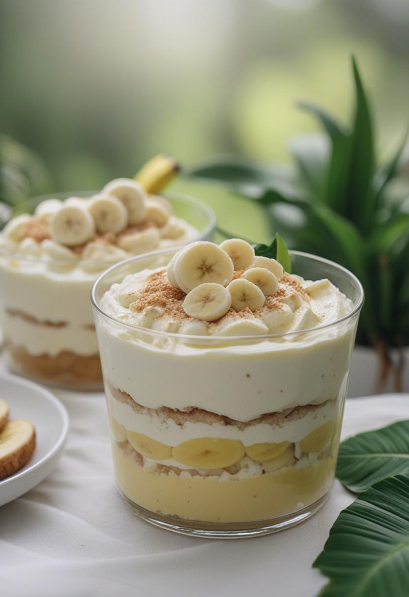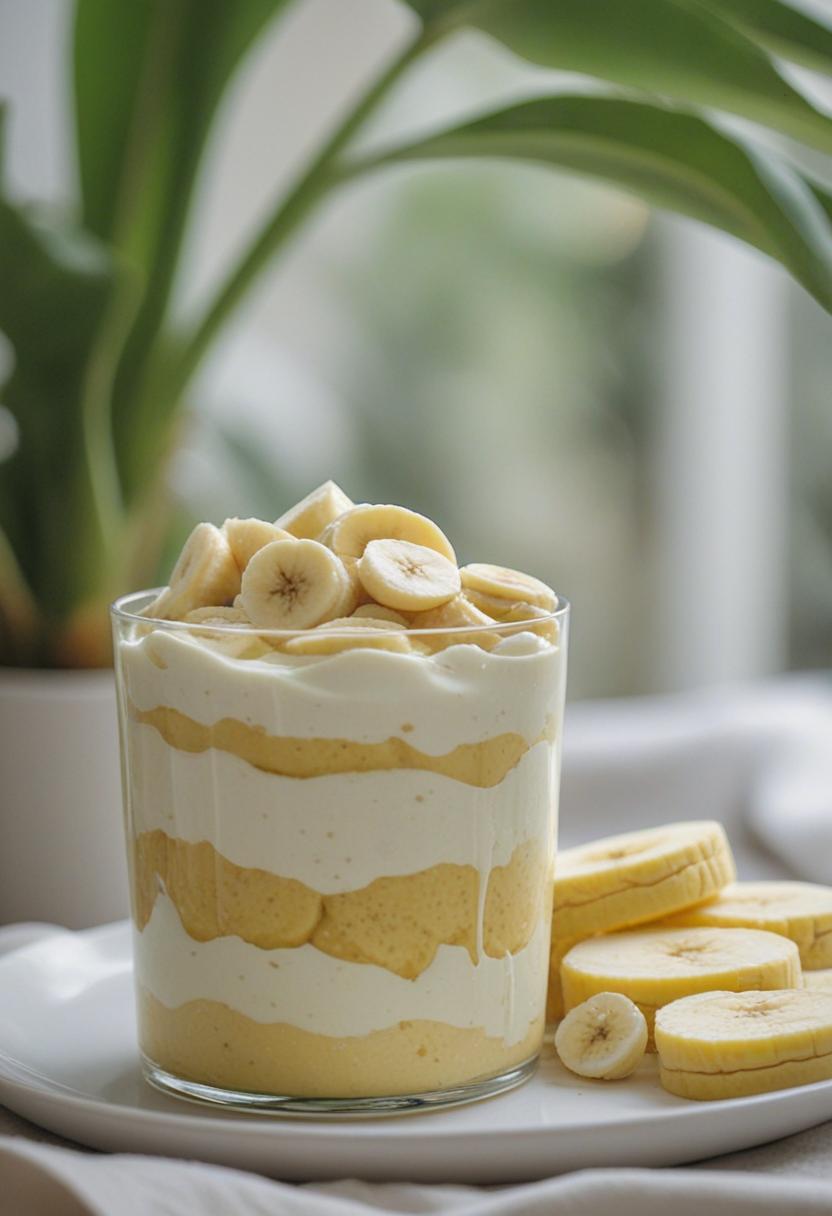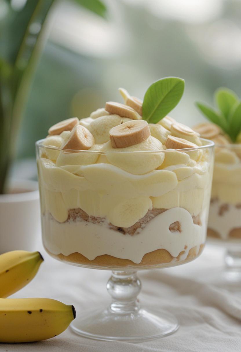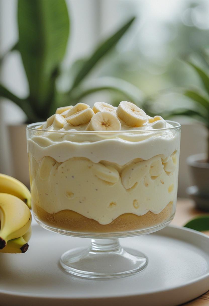 8. A whimsical blend of banana pudding and plant life, featuring pastel hues, fluffy textures, and sweet, sugary elements fused with lush greenery, creating a dreamy, dessert-inspired botanical vibe.