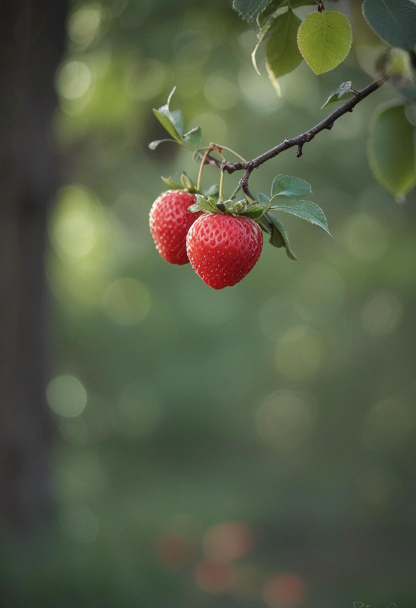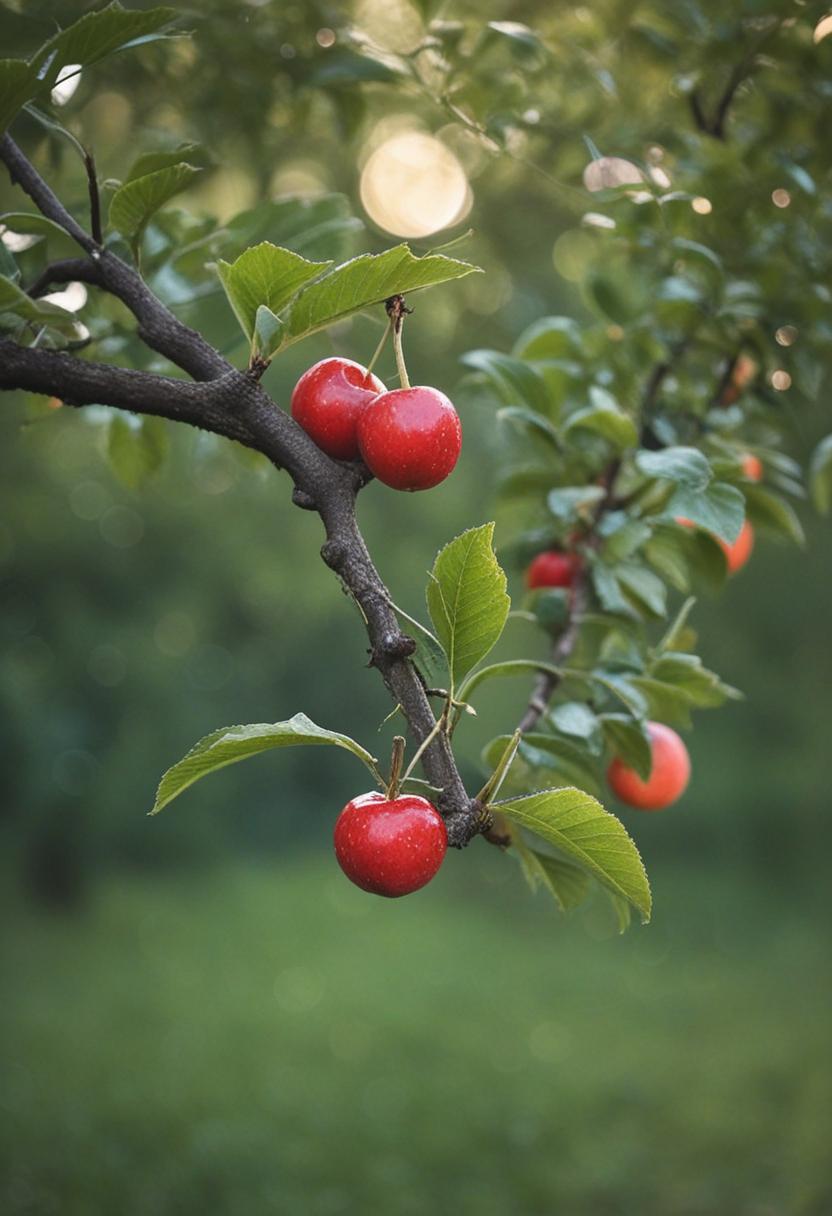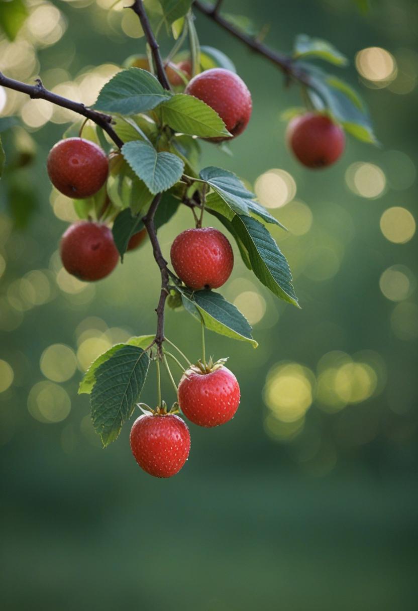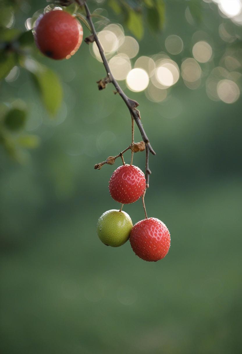 2. Vibrant fruits in nature, showcasing bright, lush colors. A peaceful blend of nature and fruit, evoking a fresh, healthy, and joyful atmosphere.