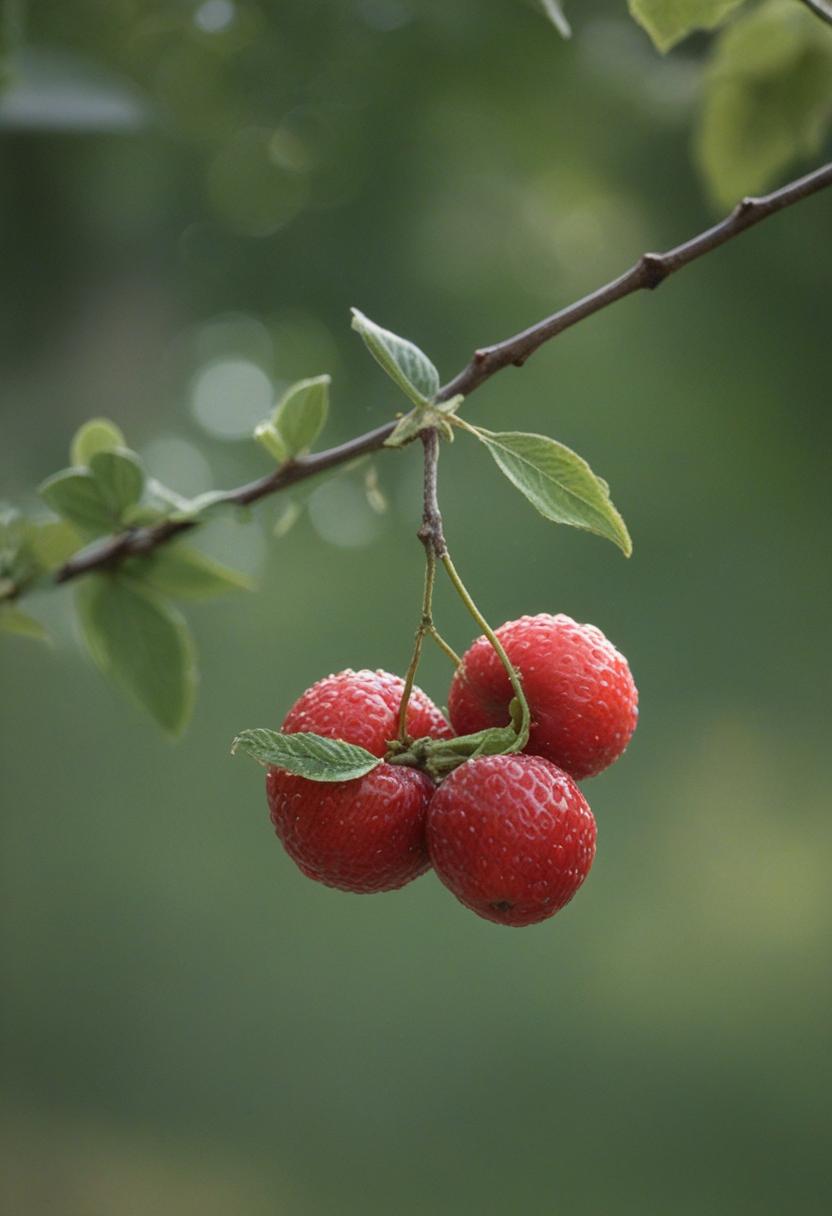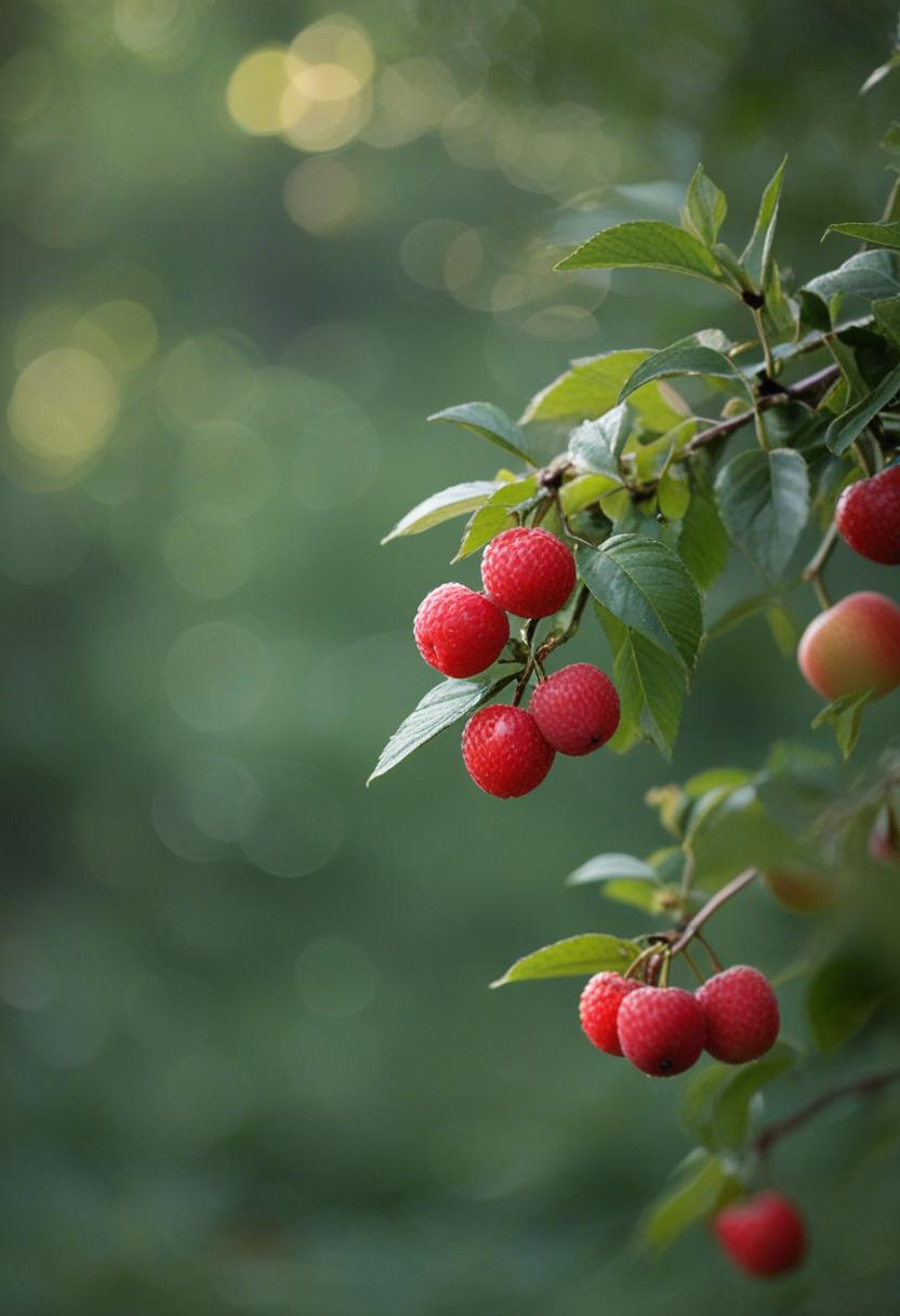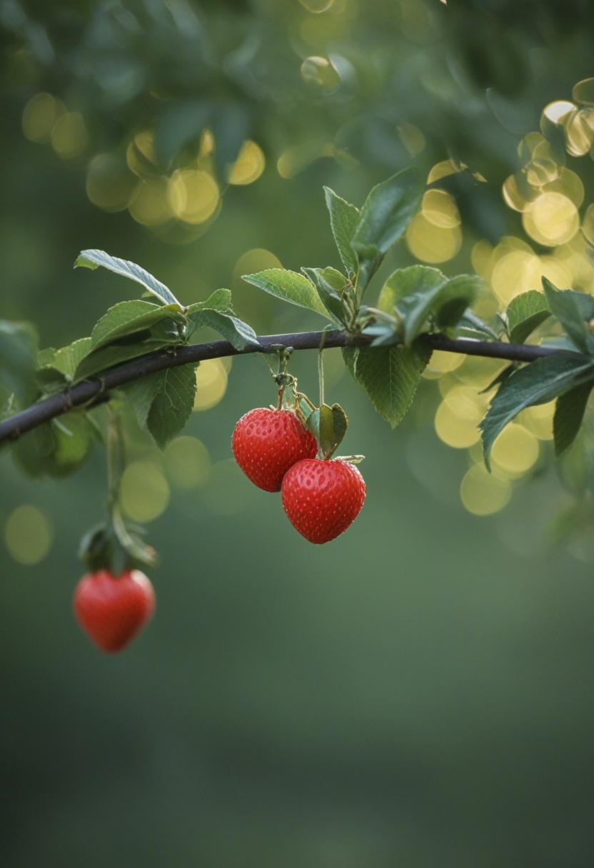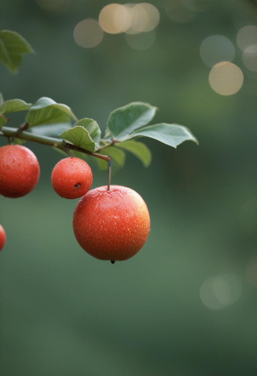 2. Vibrant fruits in nature, showcasing bright, lush colors. A peaceful blend of nature and fruit, evoking a fresh, healthy, and joyful atmosphere.