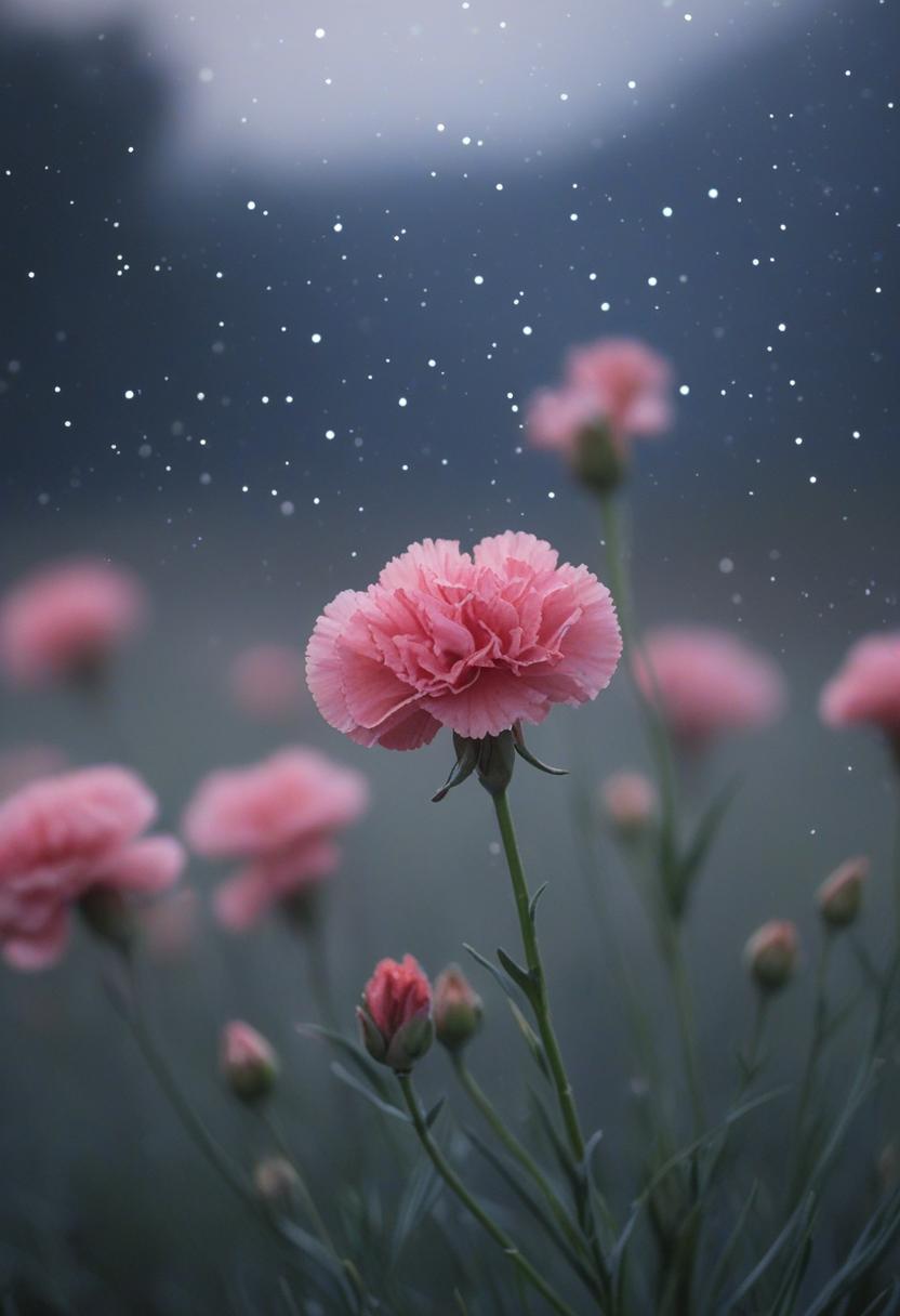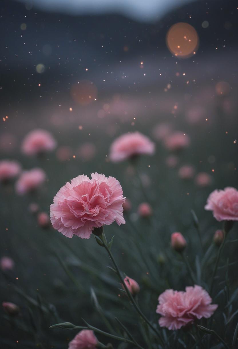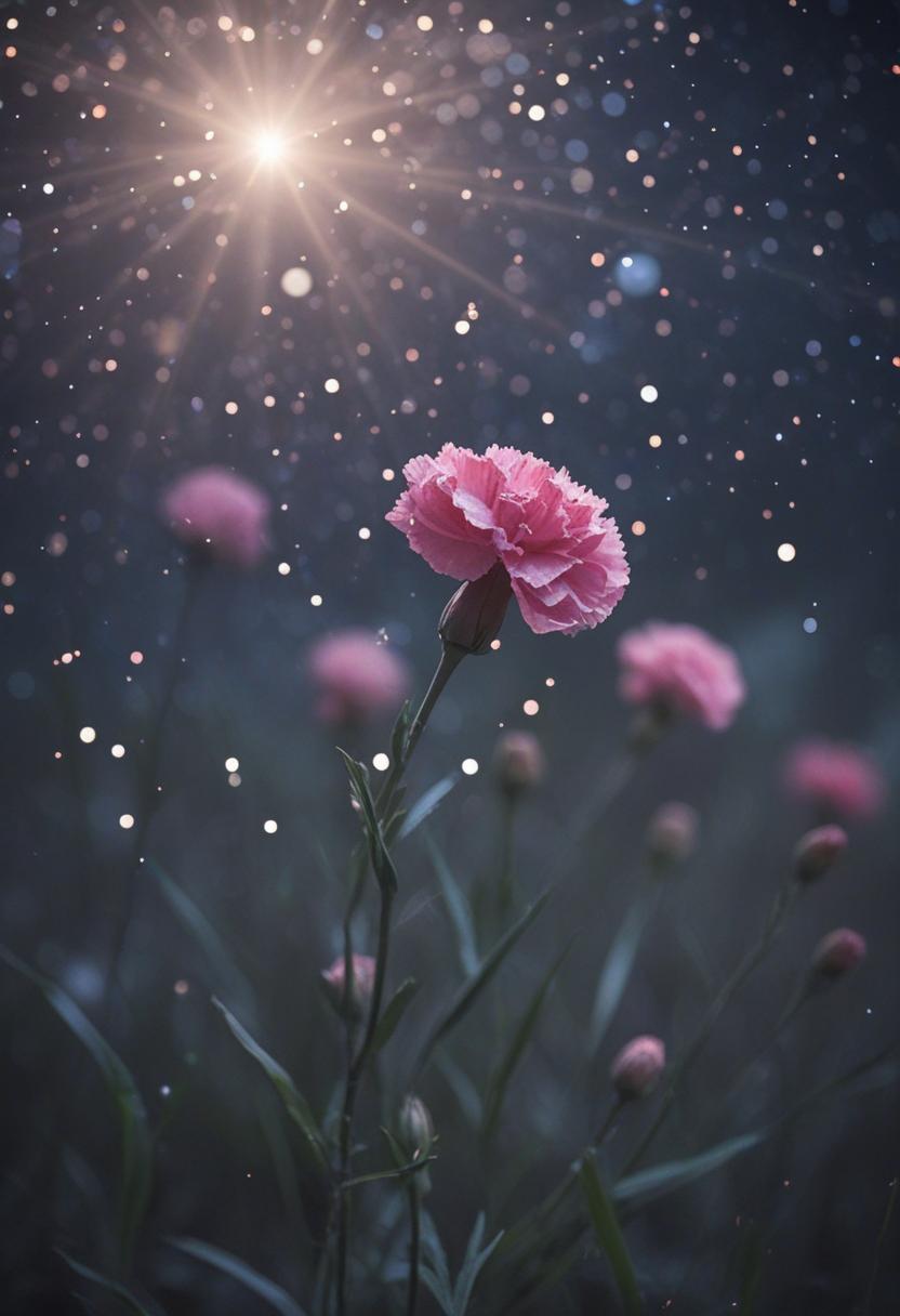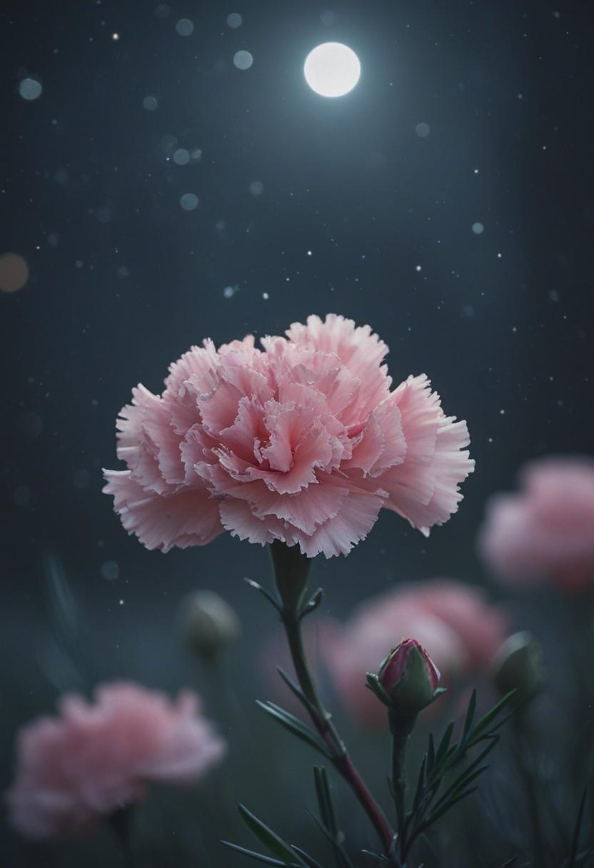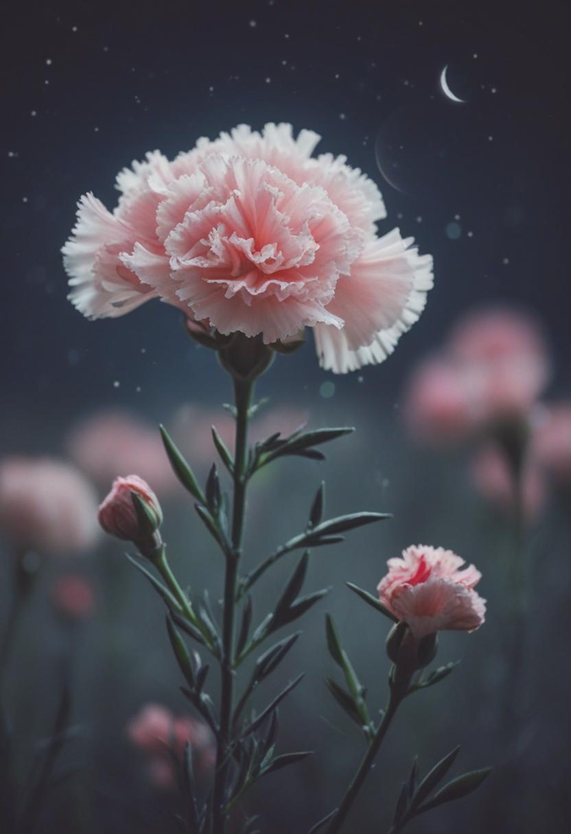12. A soft, cozy close-up of a carnation under starlight, capturing a dreamy, serene atmosphere with gentle lighting and a touch of magical wonder.