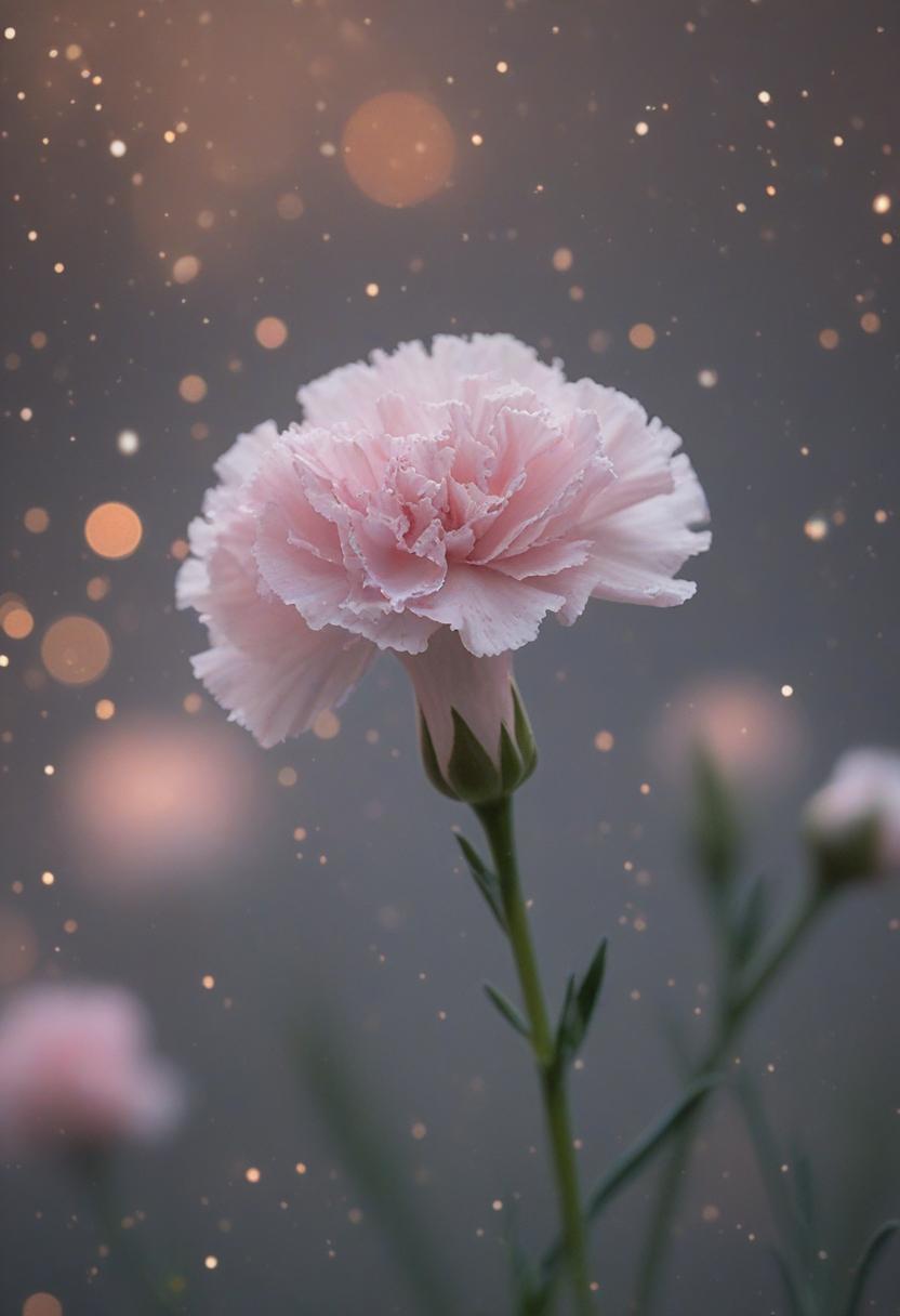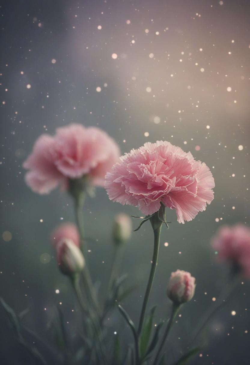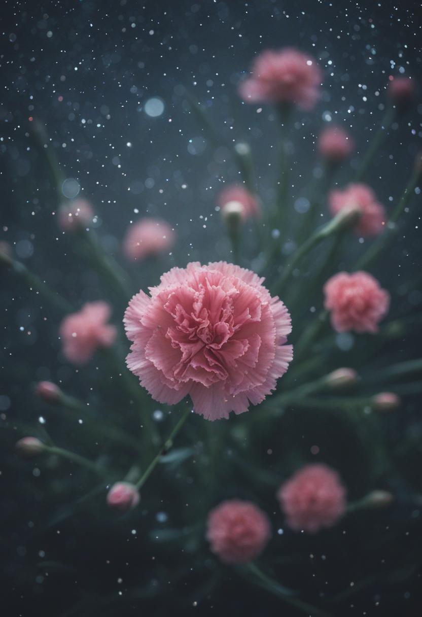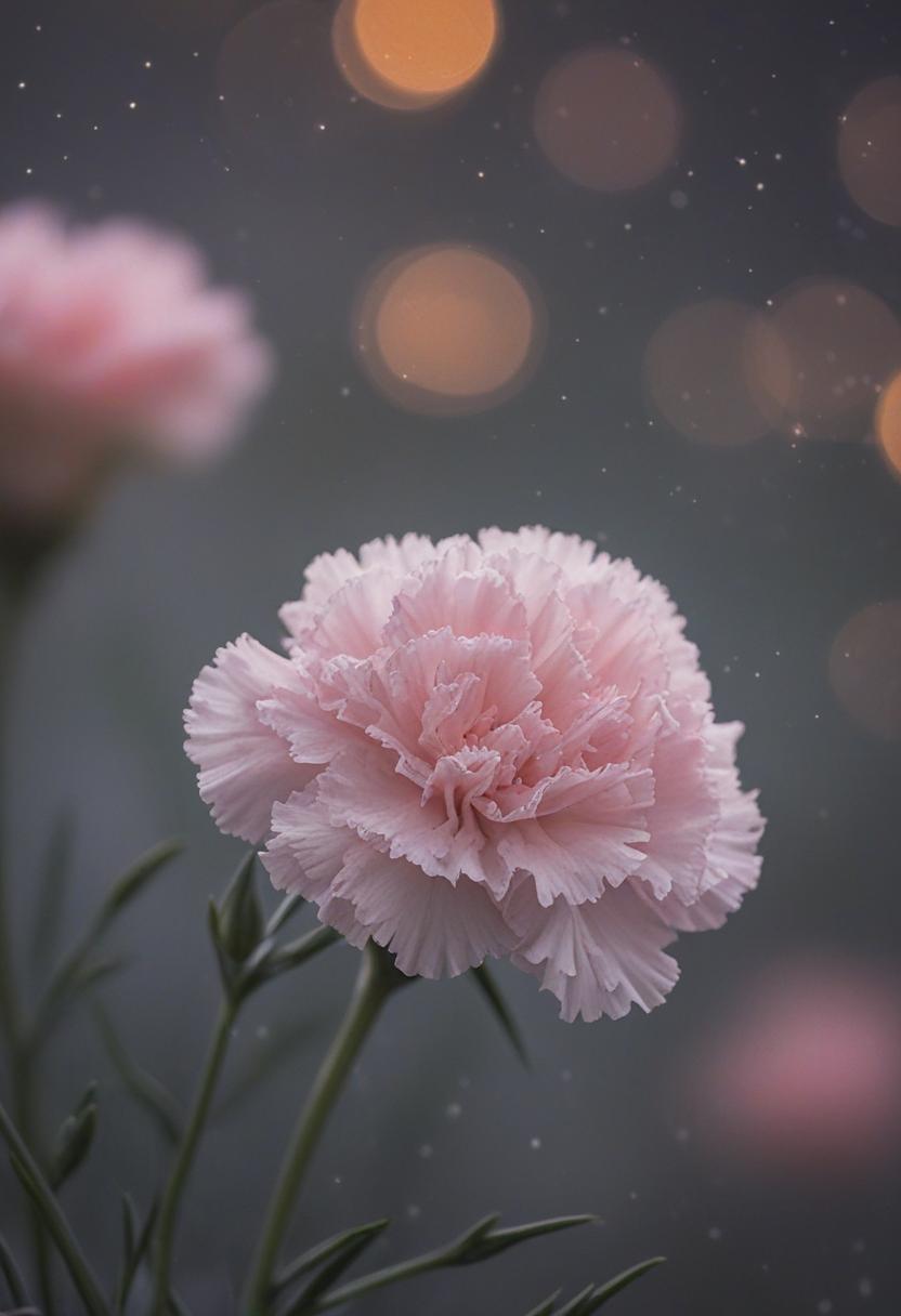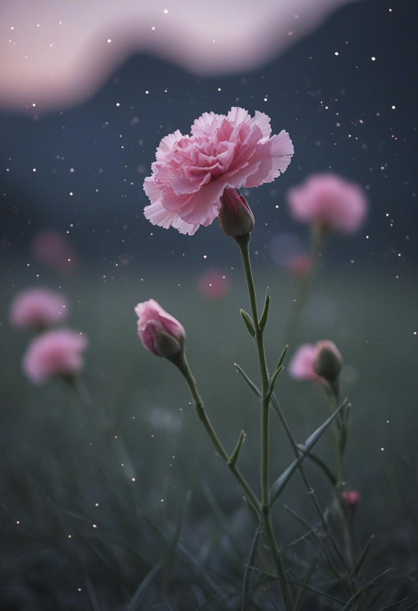 12. A soft, cozy close-up of a carnation under starlight, capturing a dreamy, serene atmosphere with gentle lighting and a touch of magical wonder.