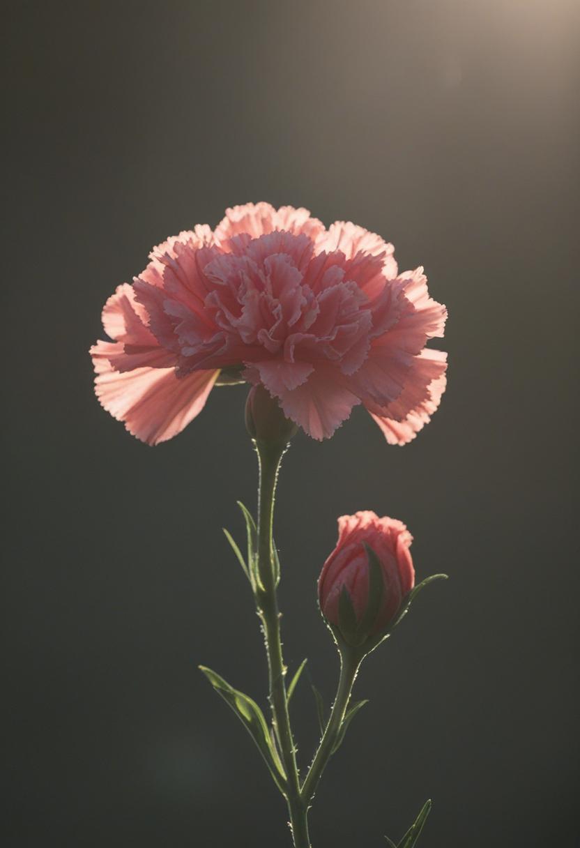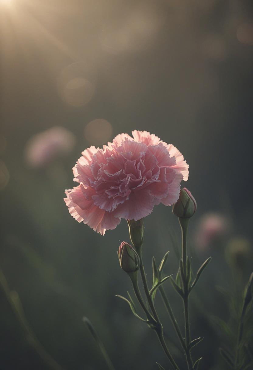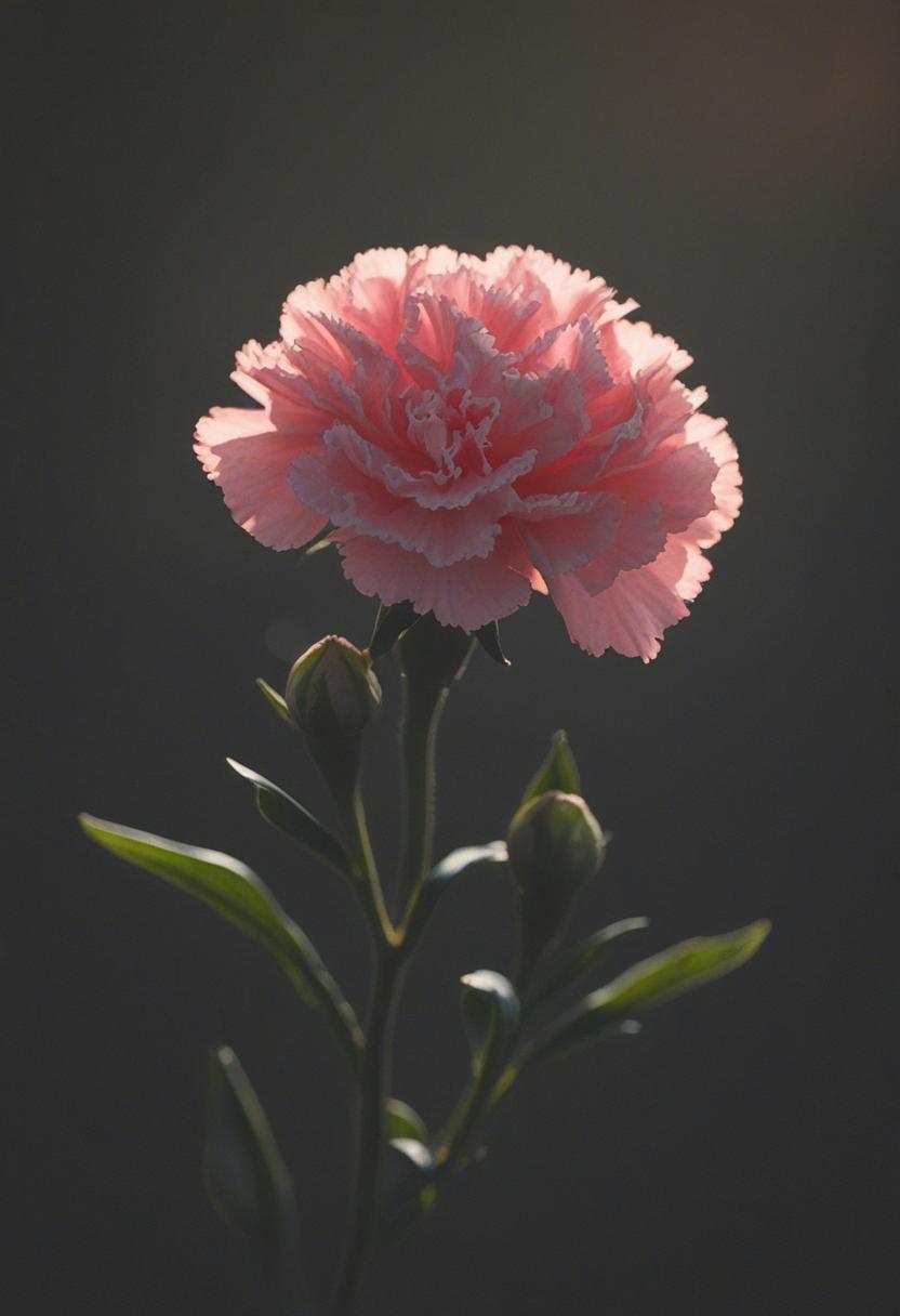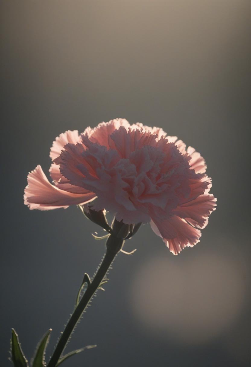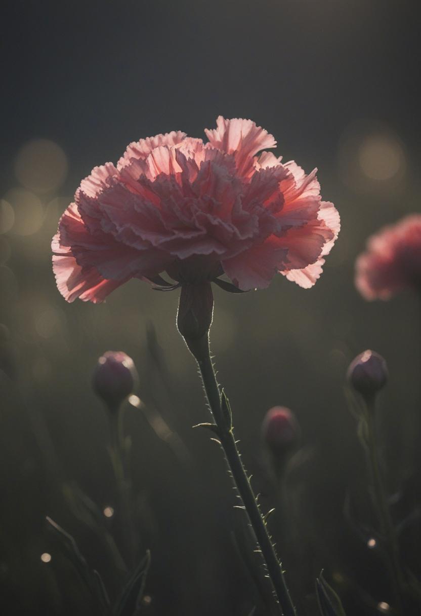 3. A dramatic close-up of a carnation under soft backlighting, capturing its delicate petals in a serene, aesthetic glow, evoking emotion and beauty with a touch of poetic intensity.