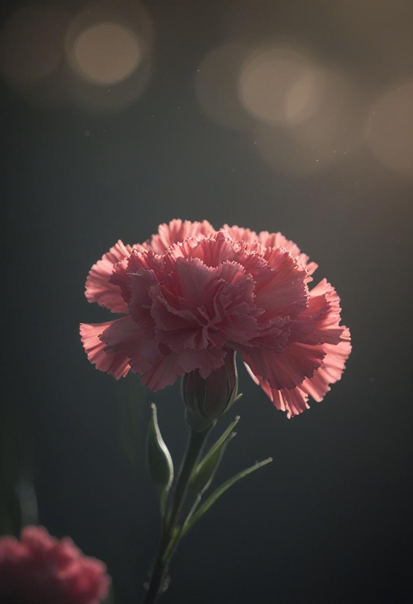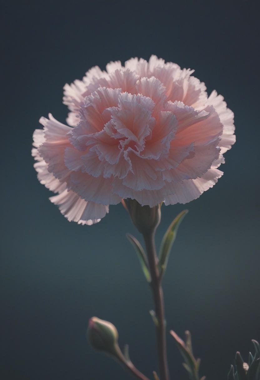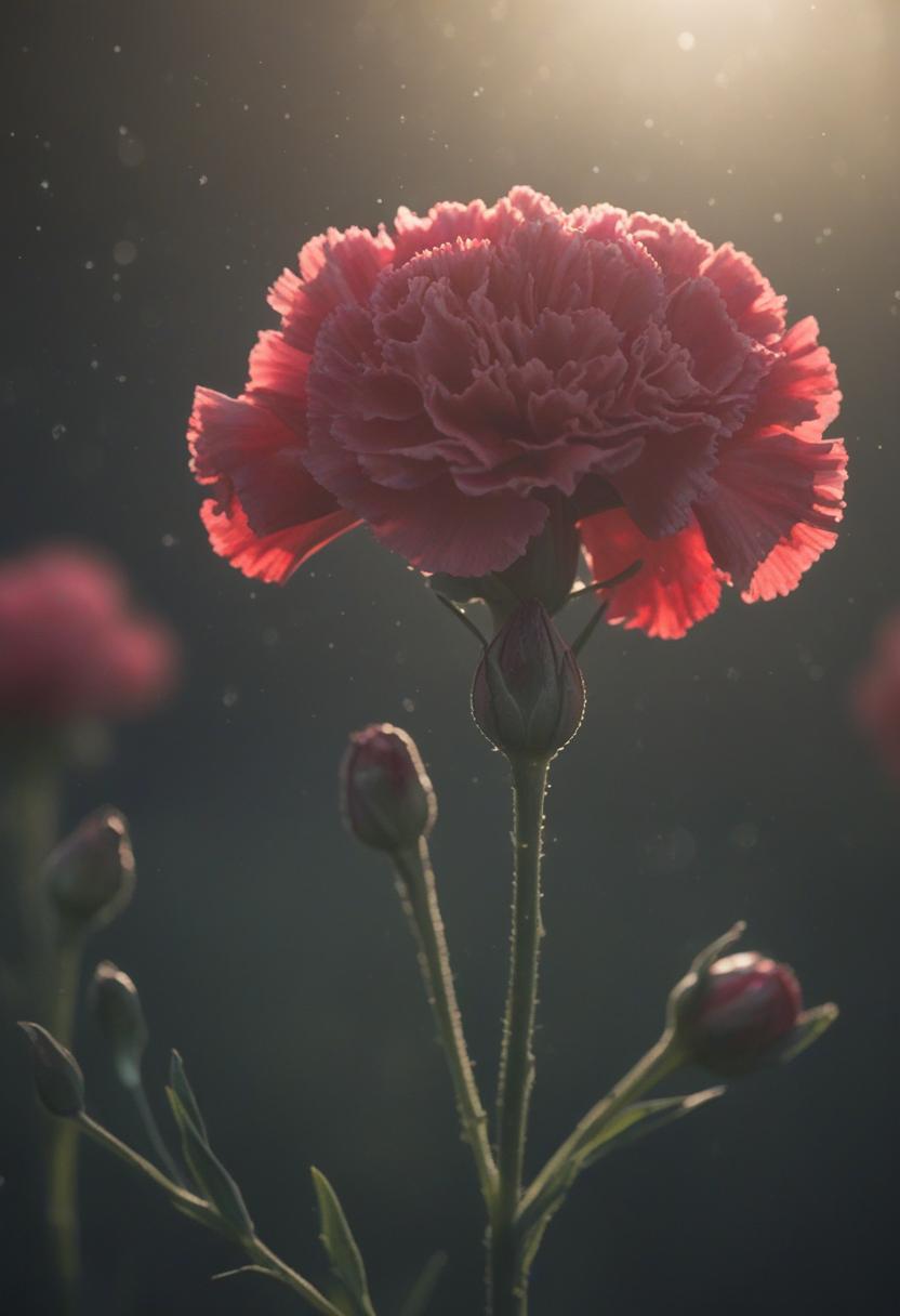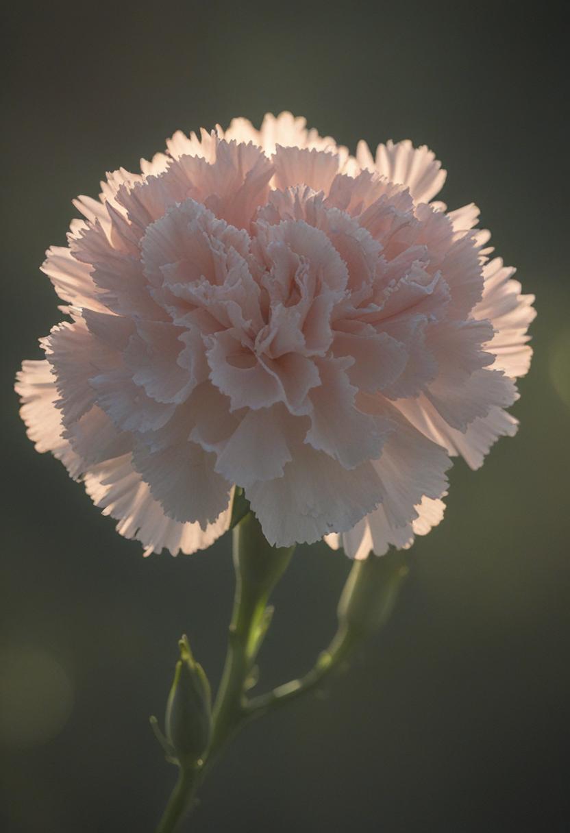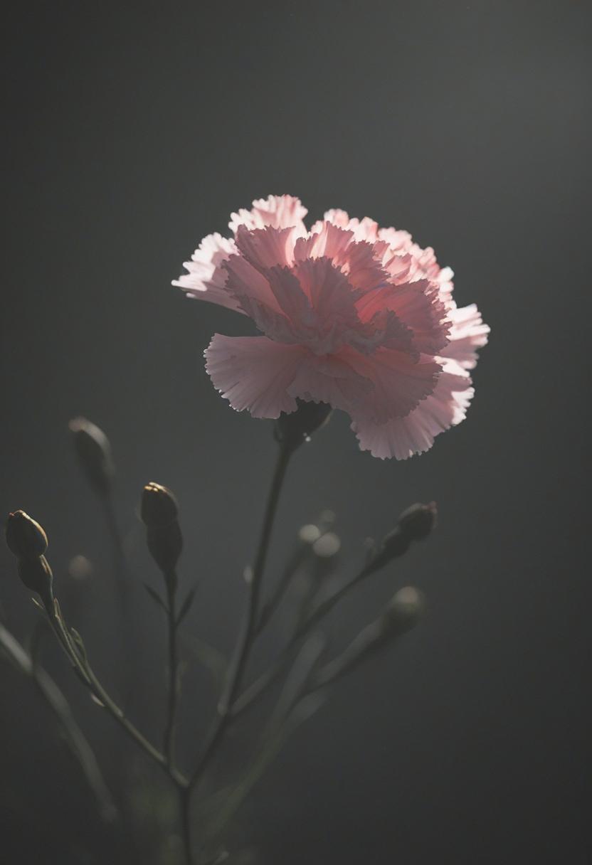 3. A dramatic close-up of a carnation under soft backlighting, capturing its delicate petals in a serene, aesthetic glow, evoking emotion and beauty with a touch of poetic intensity.