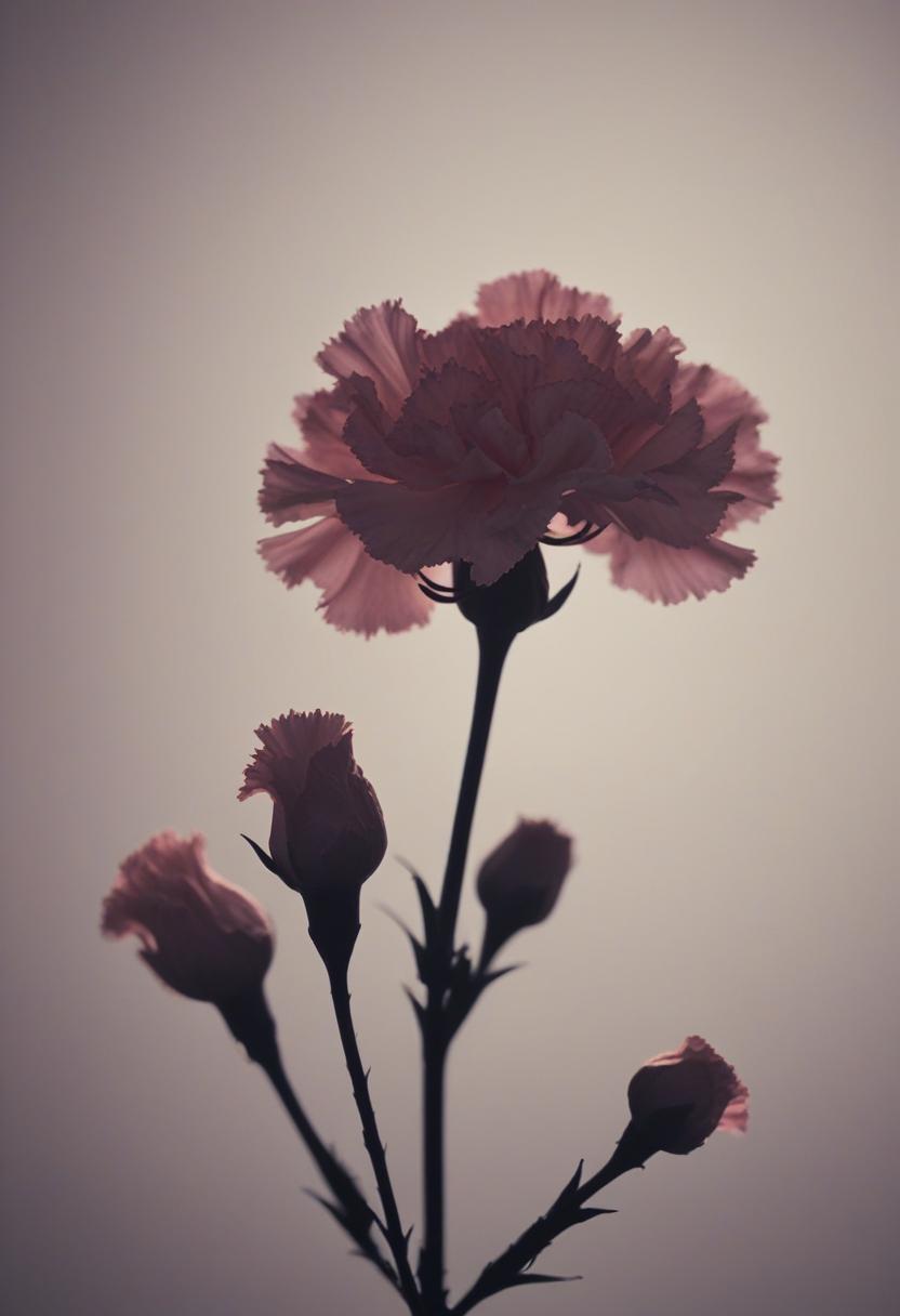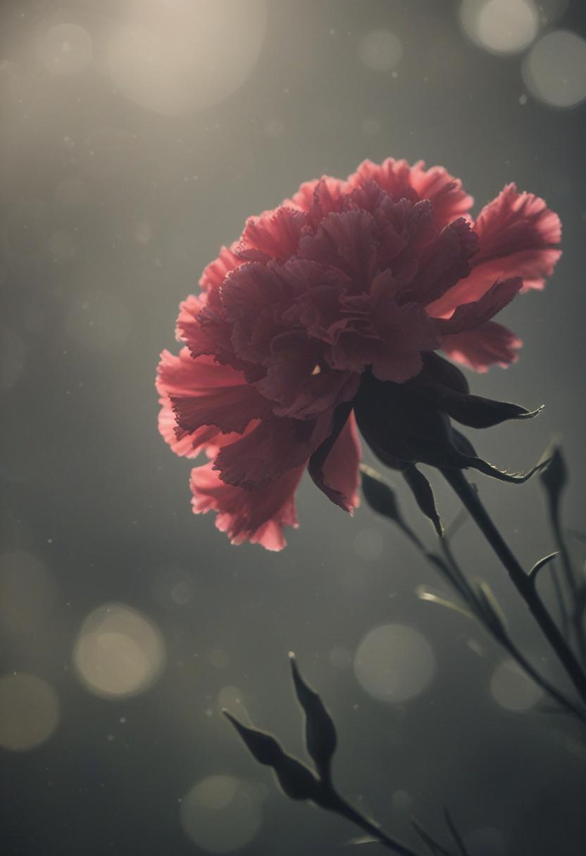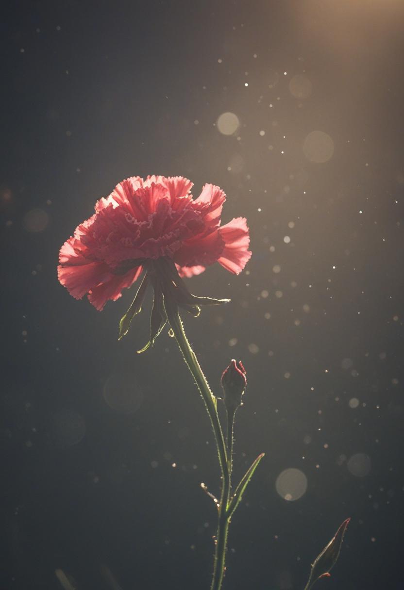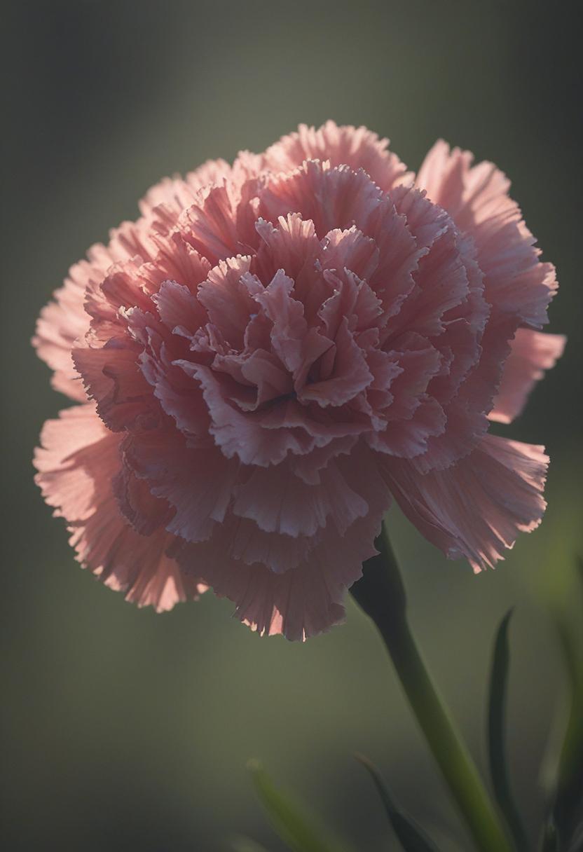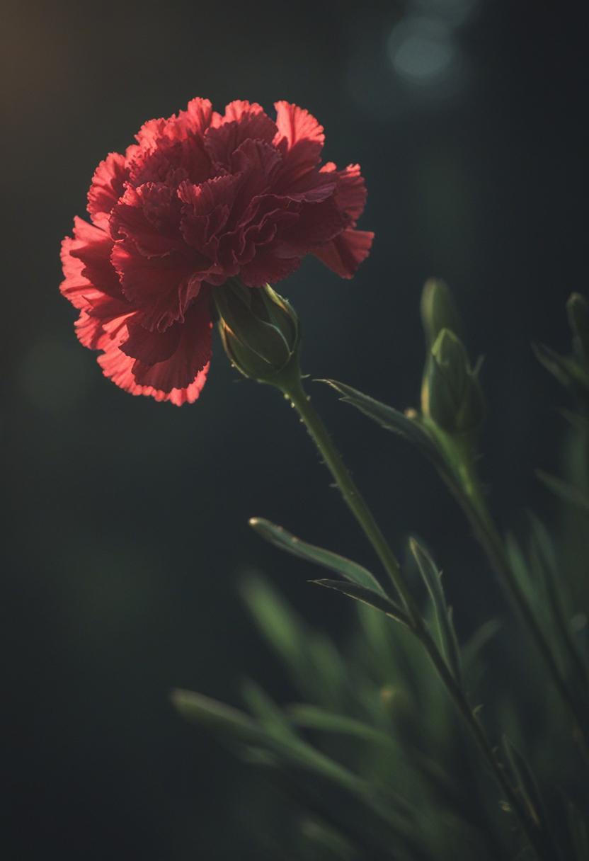 3. A dramatic close-up of a carnation under soft backlighting, capturing its delicate petals in a serene, aesthetic glow, evoking emotion and beauty with a touch of poetic intensity.