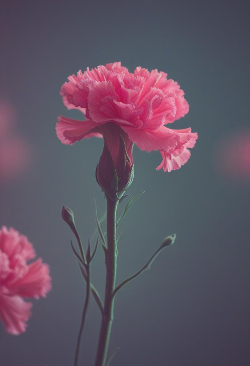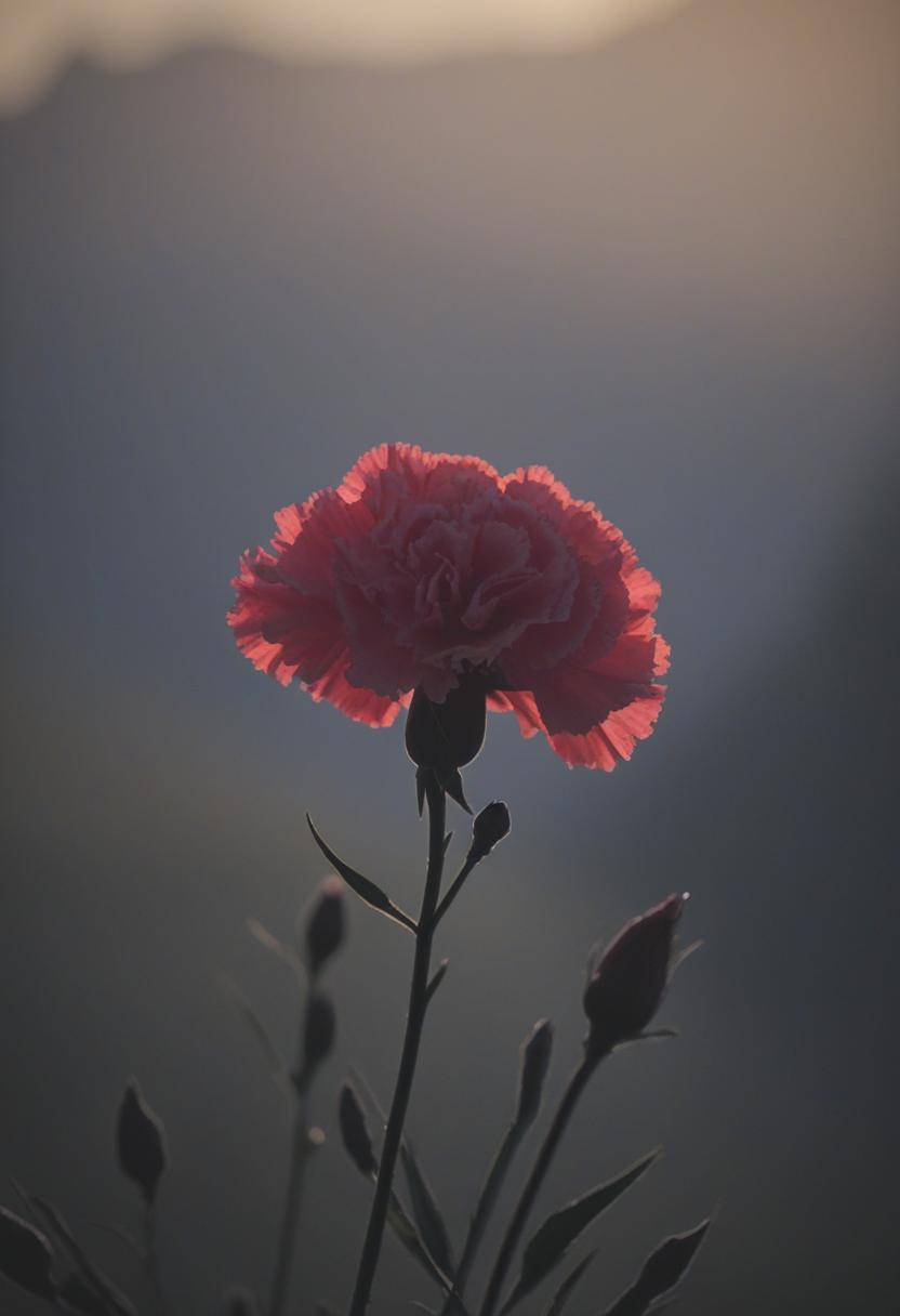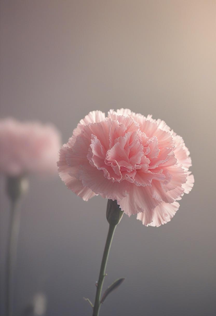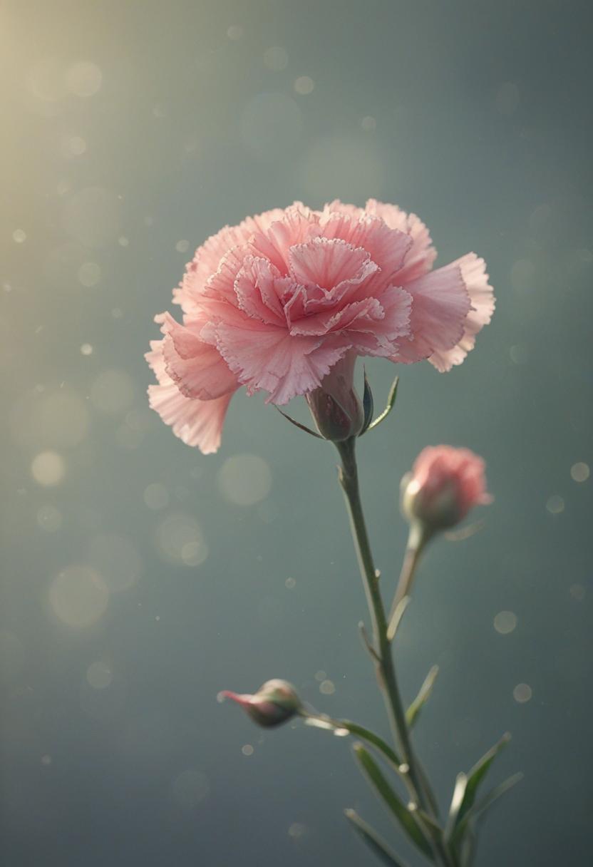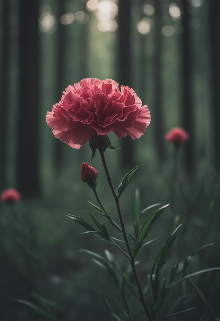 3. A dramatic close-up of a carnation under soft backlighting, capturing its delicate petals in a serene, aesthetic glow, evoking emotion and beauty with a touch of poetic intensity.