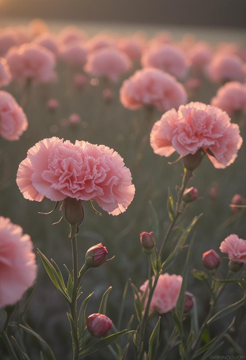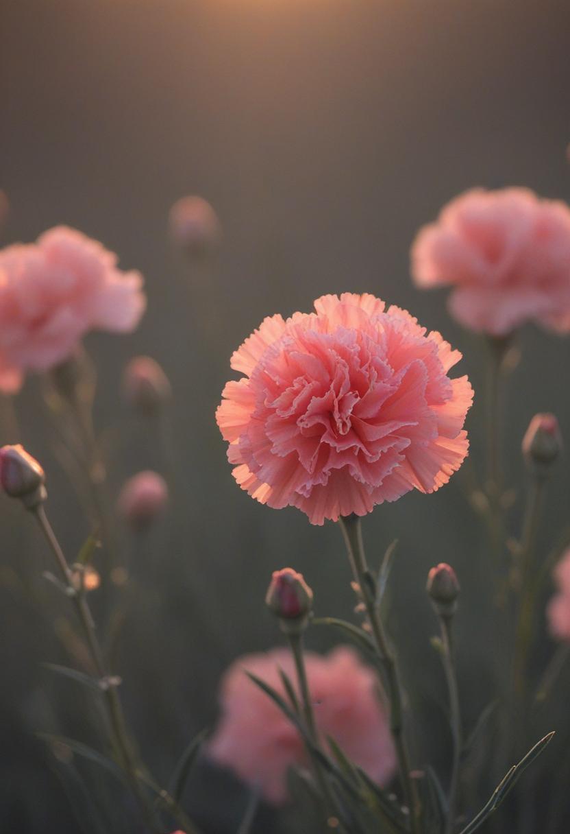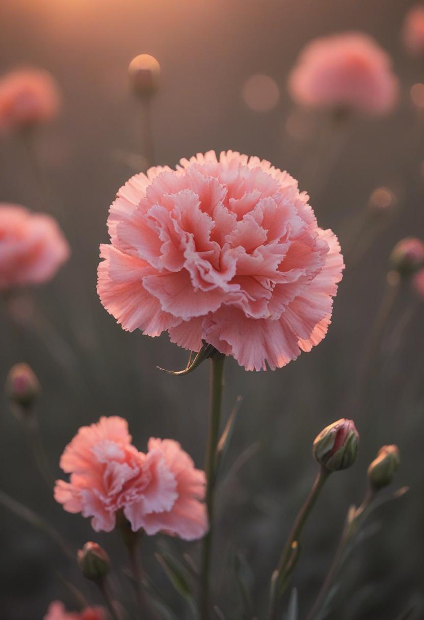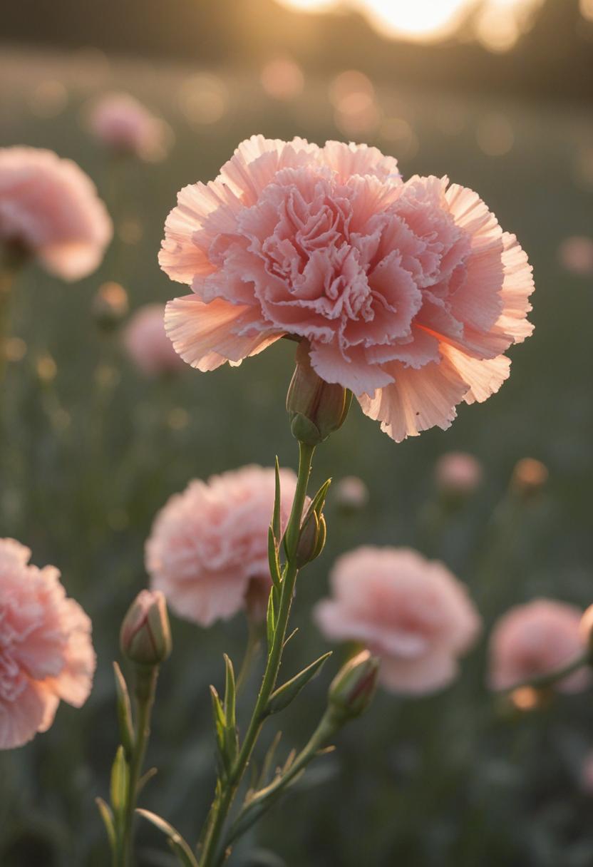 65. A close-up of a carnation bathed in a soft, ethereal sunset glow, capturing a serene and dreamlike carnation aesthetic with warm, gentle lighting and delicate details.