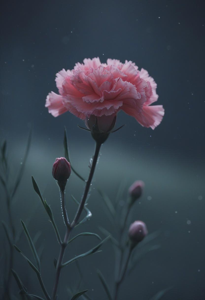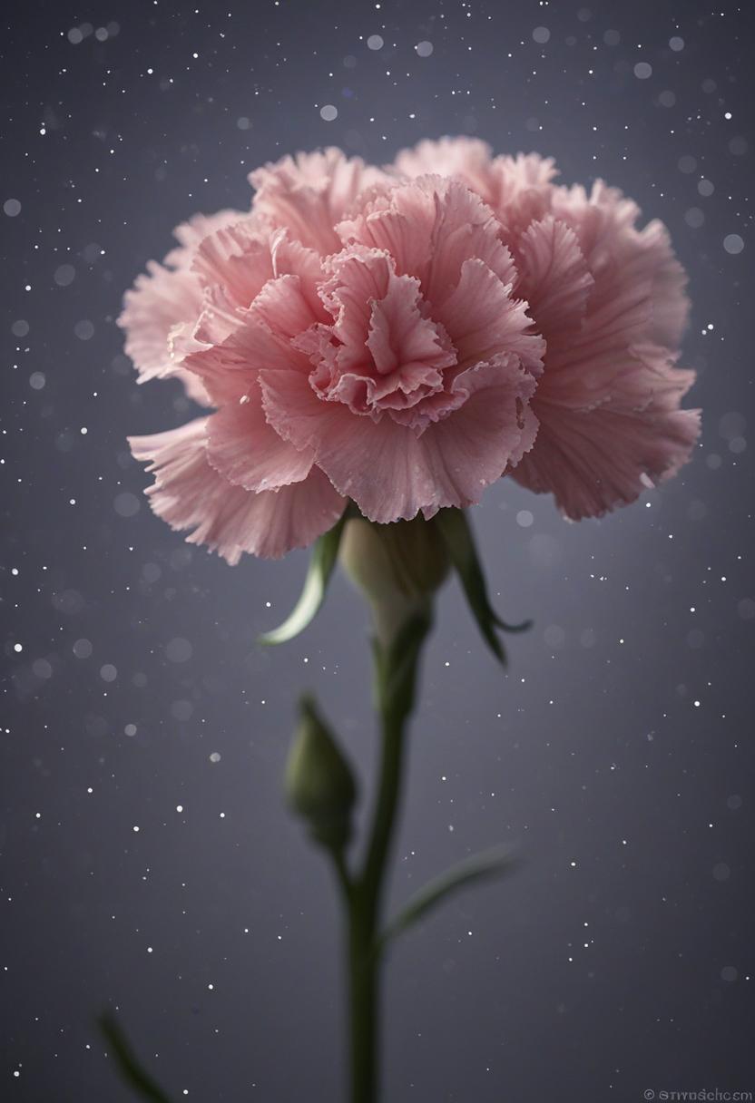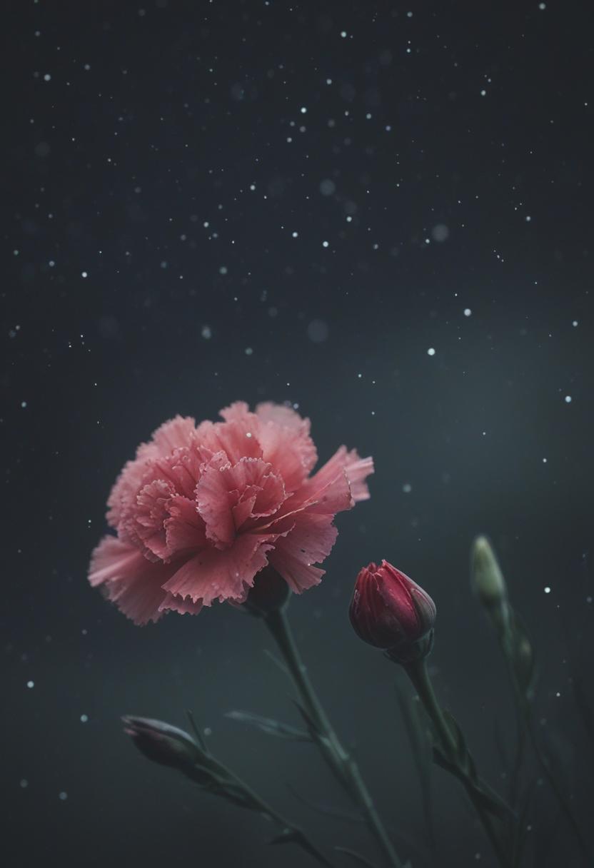 2. A minimalist side view of a carnation under starlight, exuding a soft, serene carnation aesthetic. Gentle lighting highlights the flower's delicate petals, creating a peaceful and dreamy atmosphere.
