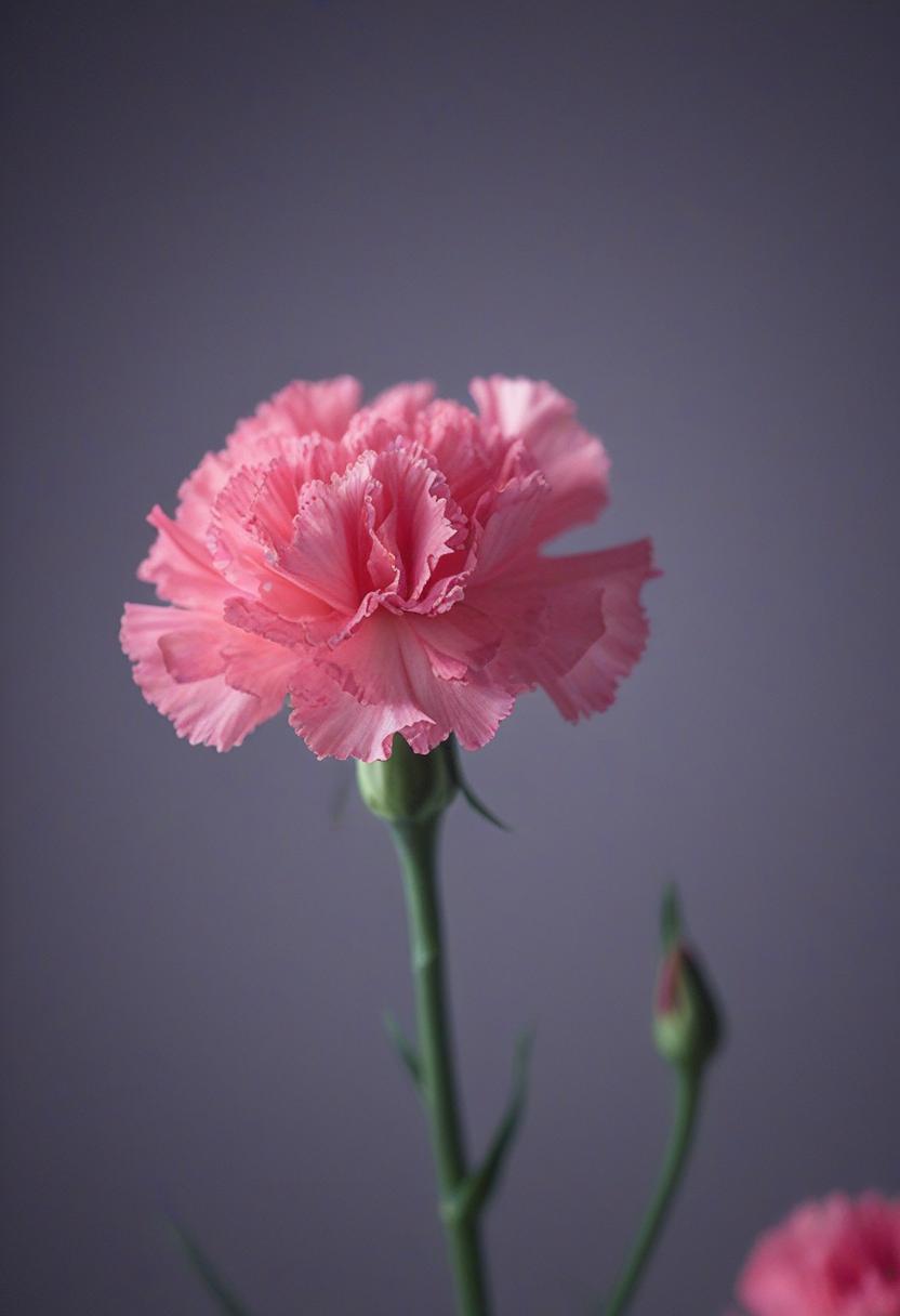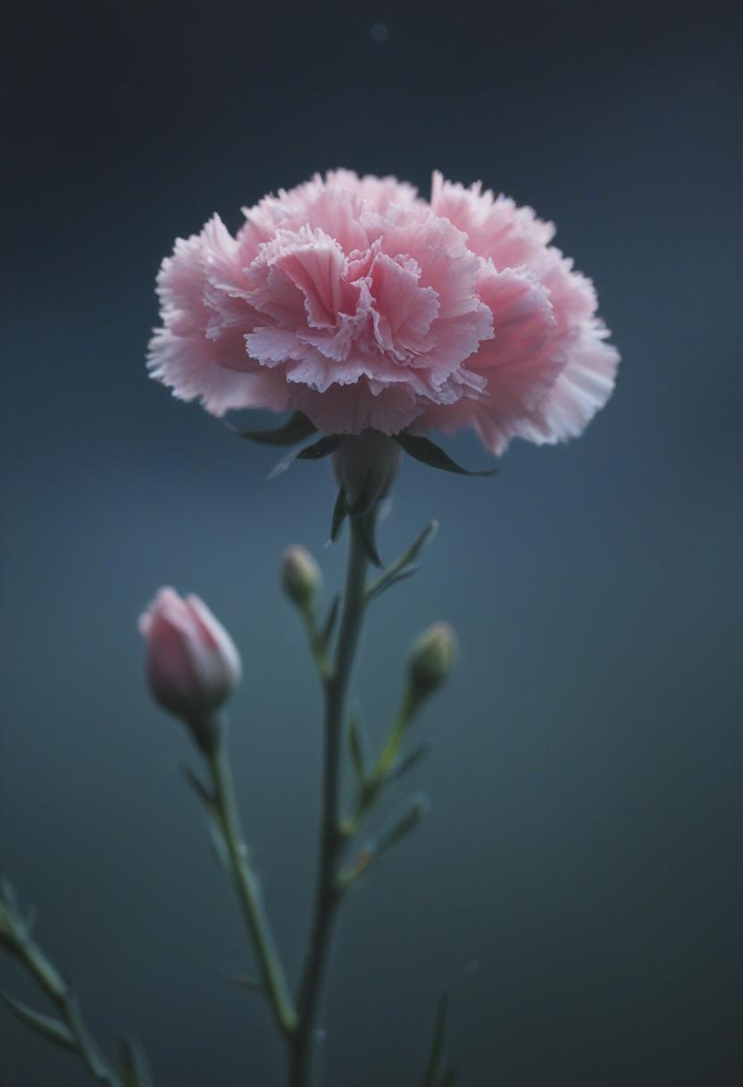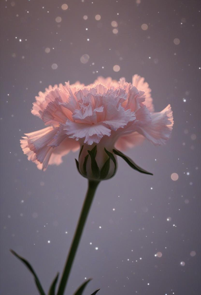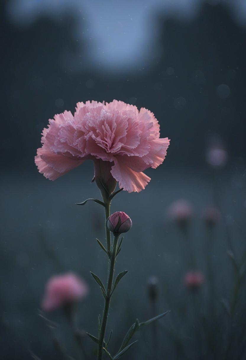 2. A minimalist side view of a carnation under starlight, exuding a soft, serene carnation aesthetic. Gentle lighting highlights the flower's delicate petals, creating a peaceful and dreamy atmosphere.