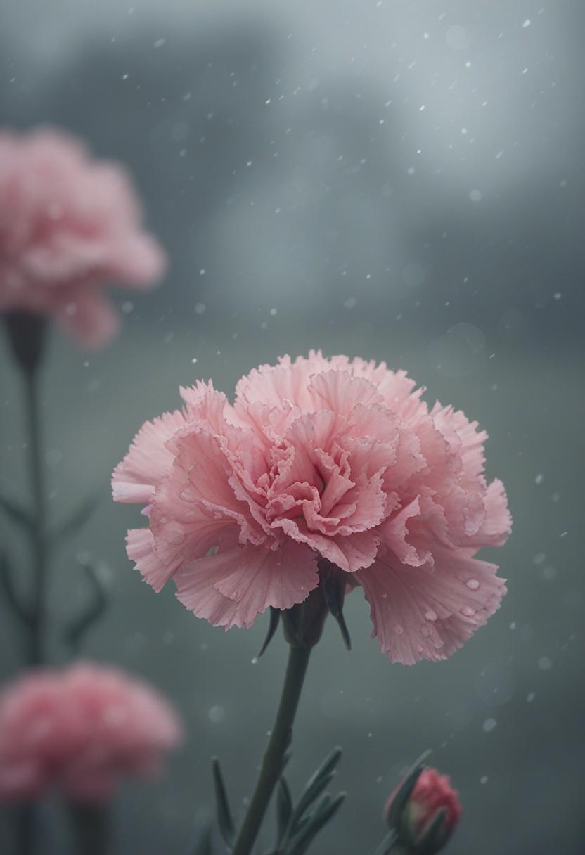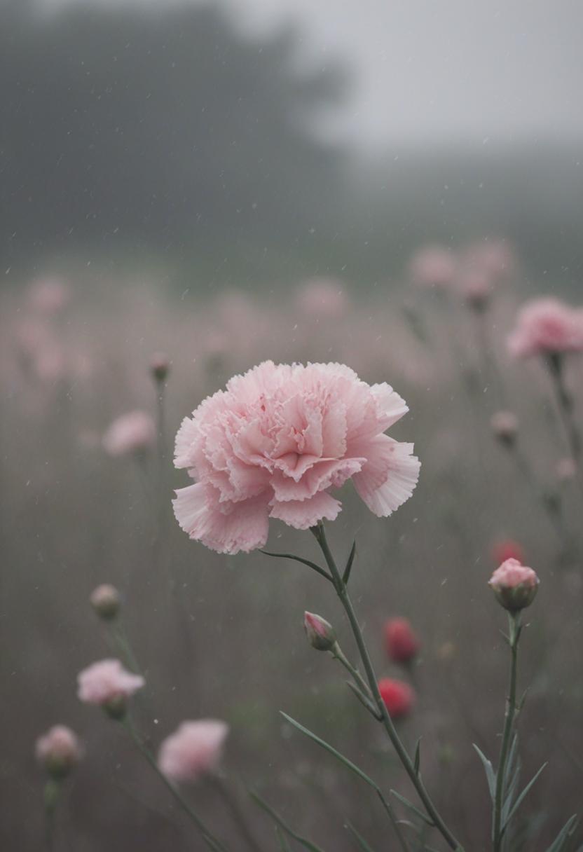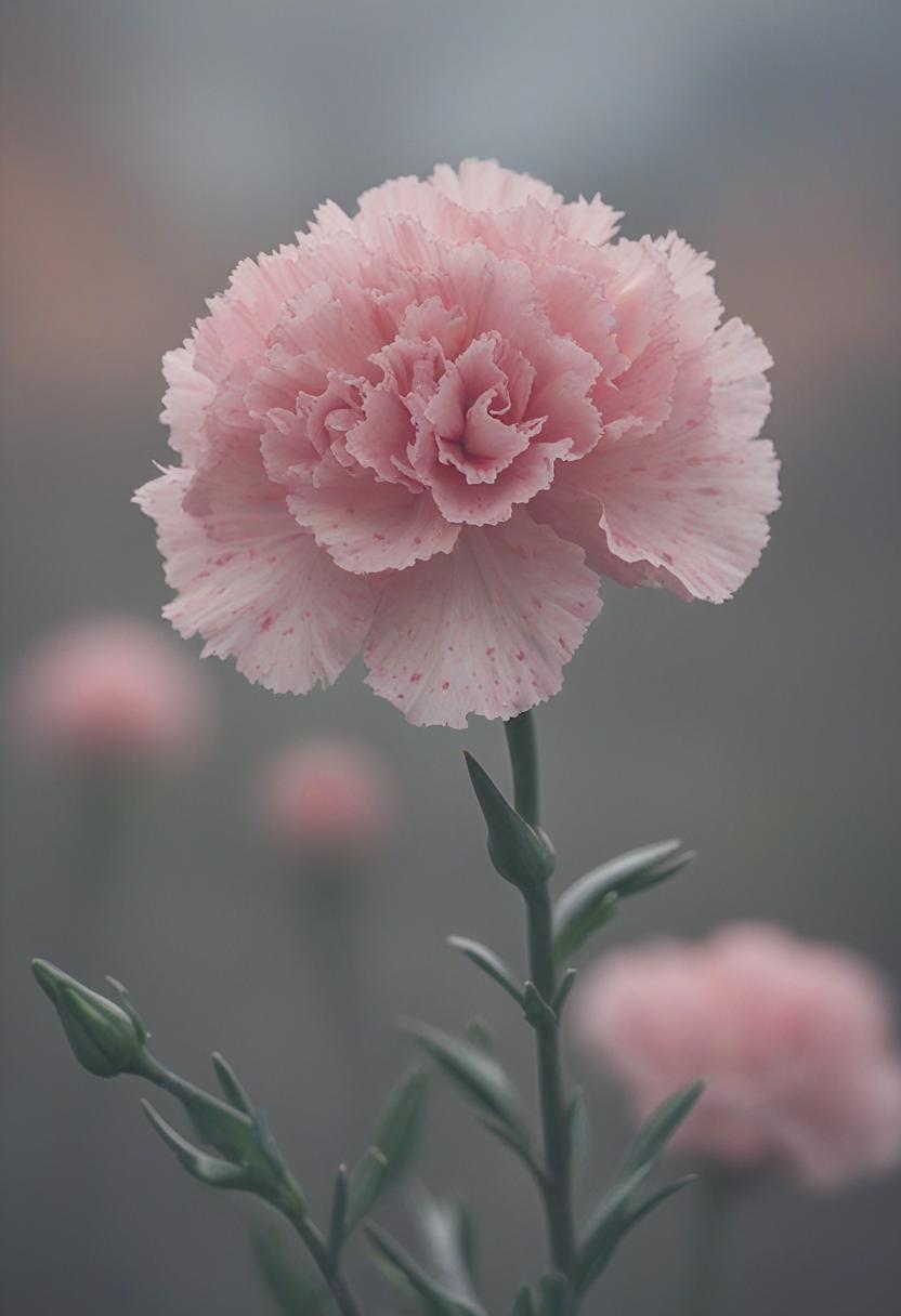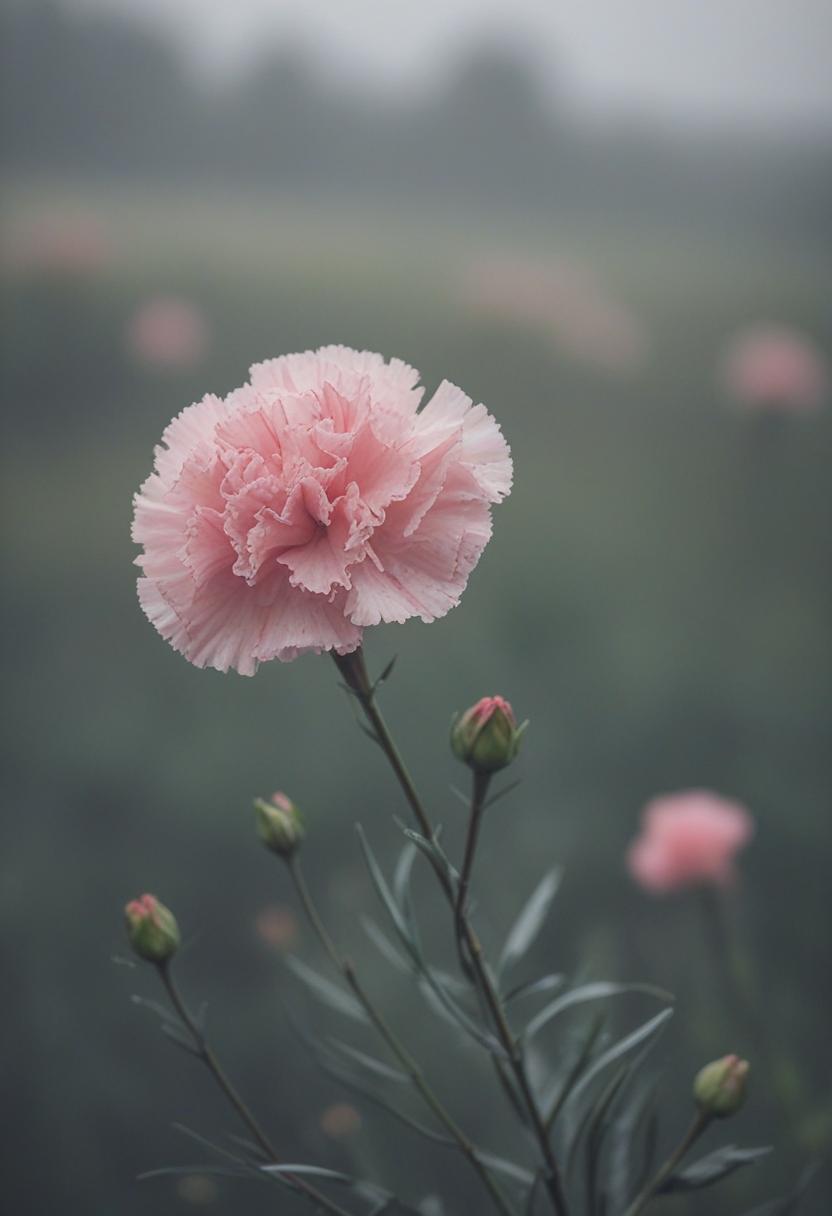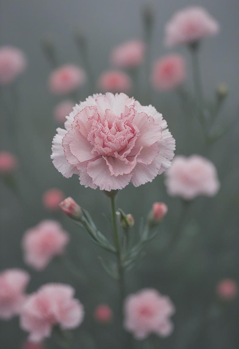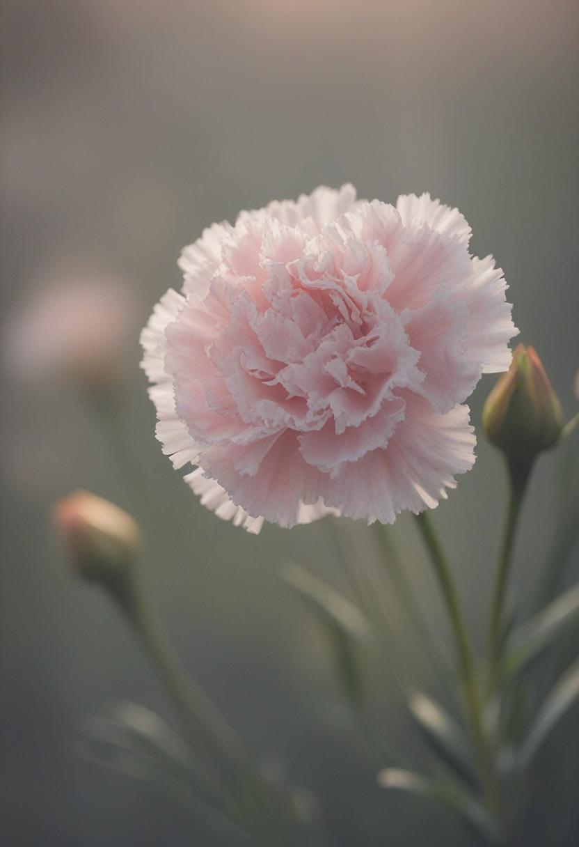 54. A soft, cloudy sky casts a gentle glow over a midshot of a carnation, capturing the serene, dreamy essence of the carnation aesthetic with muted tones and subtle lighting.