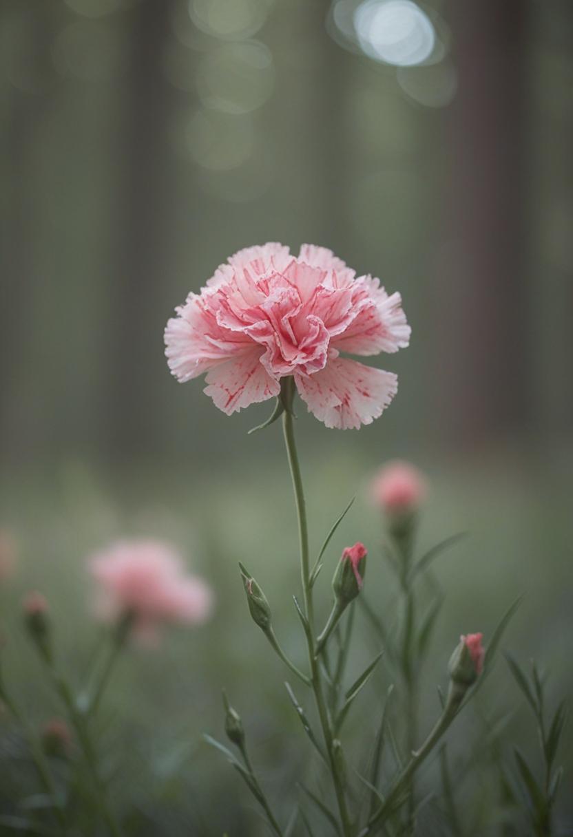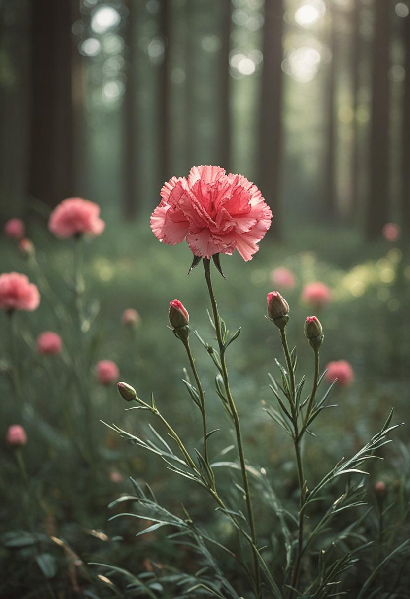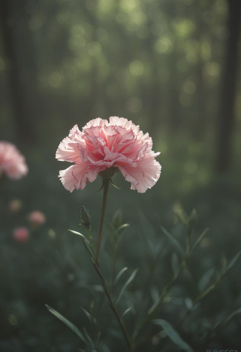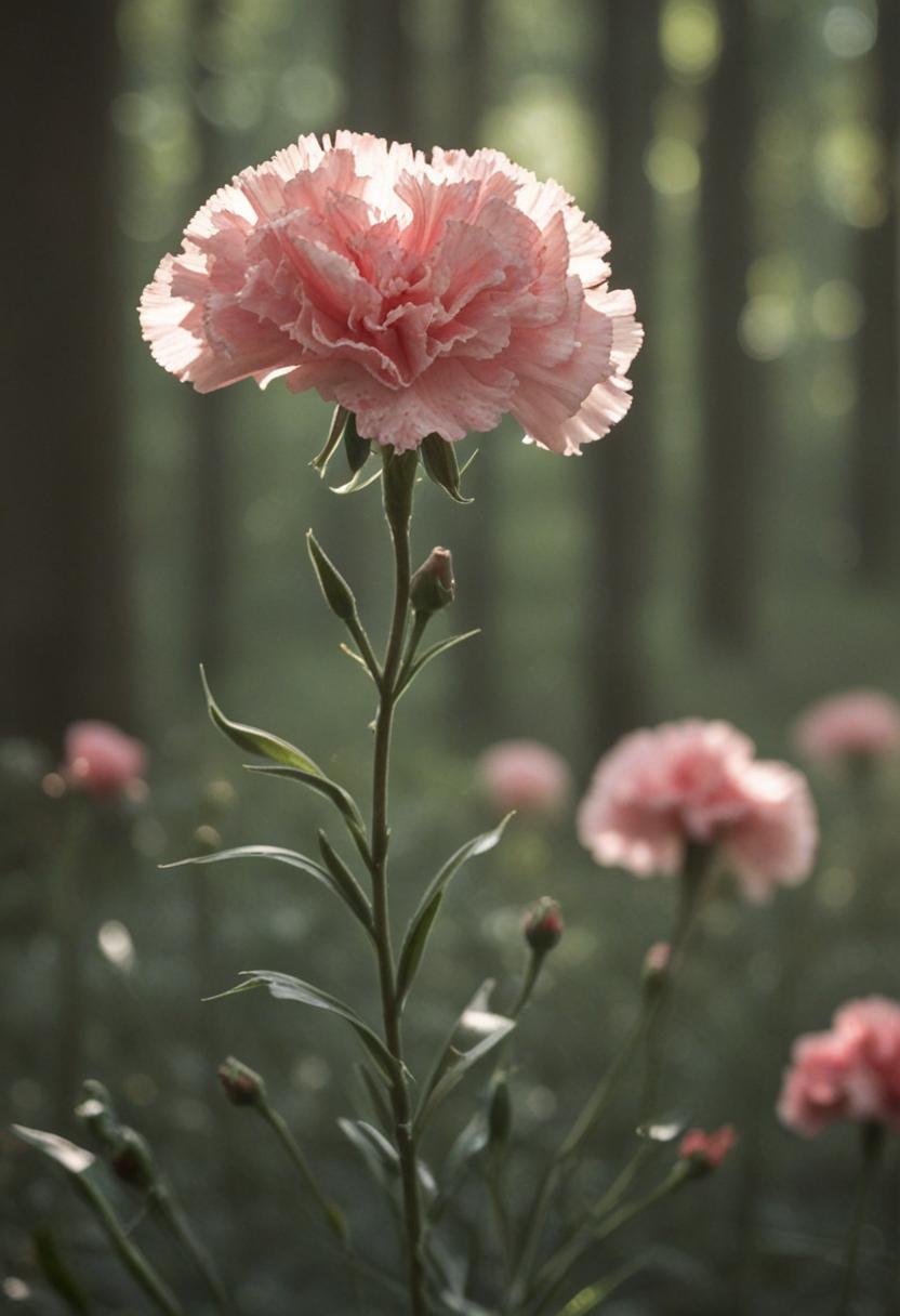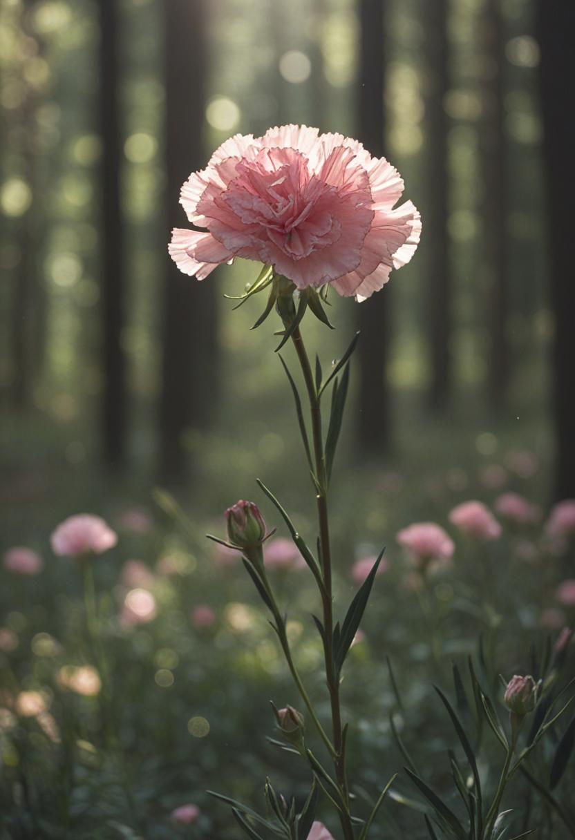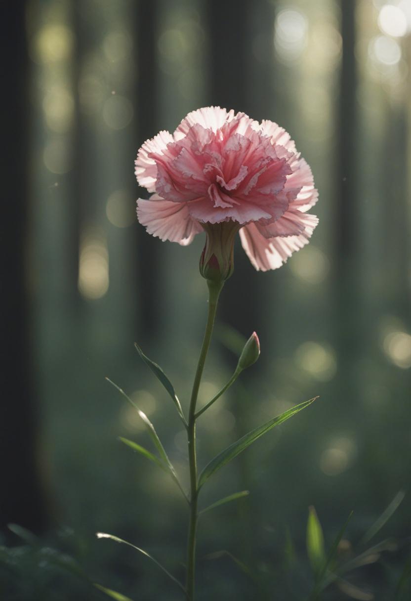 53. A dreamy close-up of a carnation in dappled forest light, evoking a soft, romantic aesthetic with gentle shadows and soft focus, capturing a serene and enchanting moment in nature.