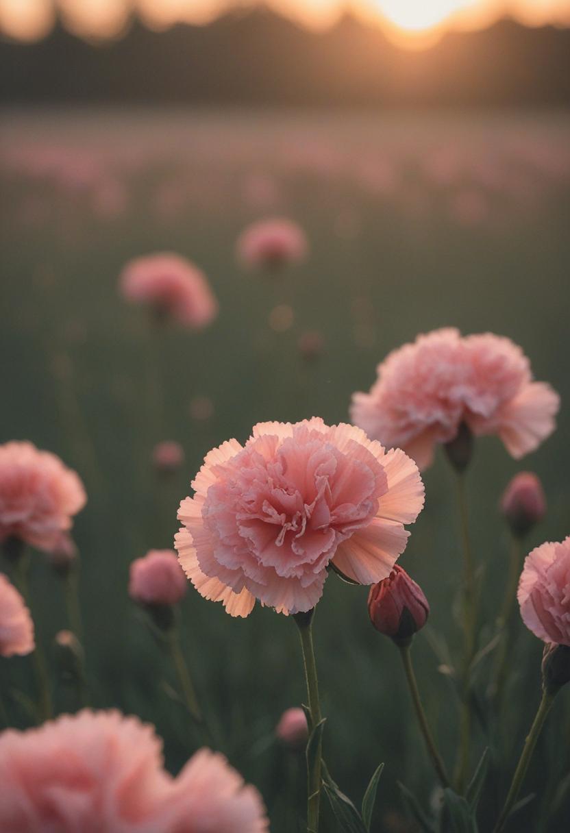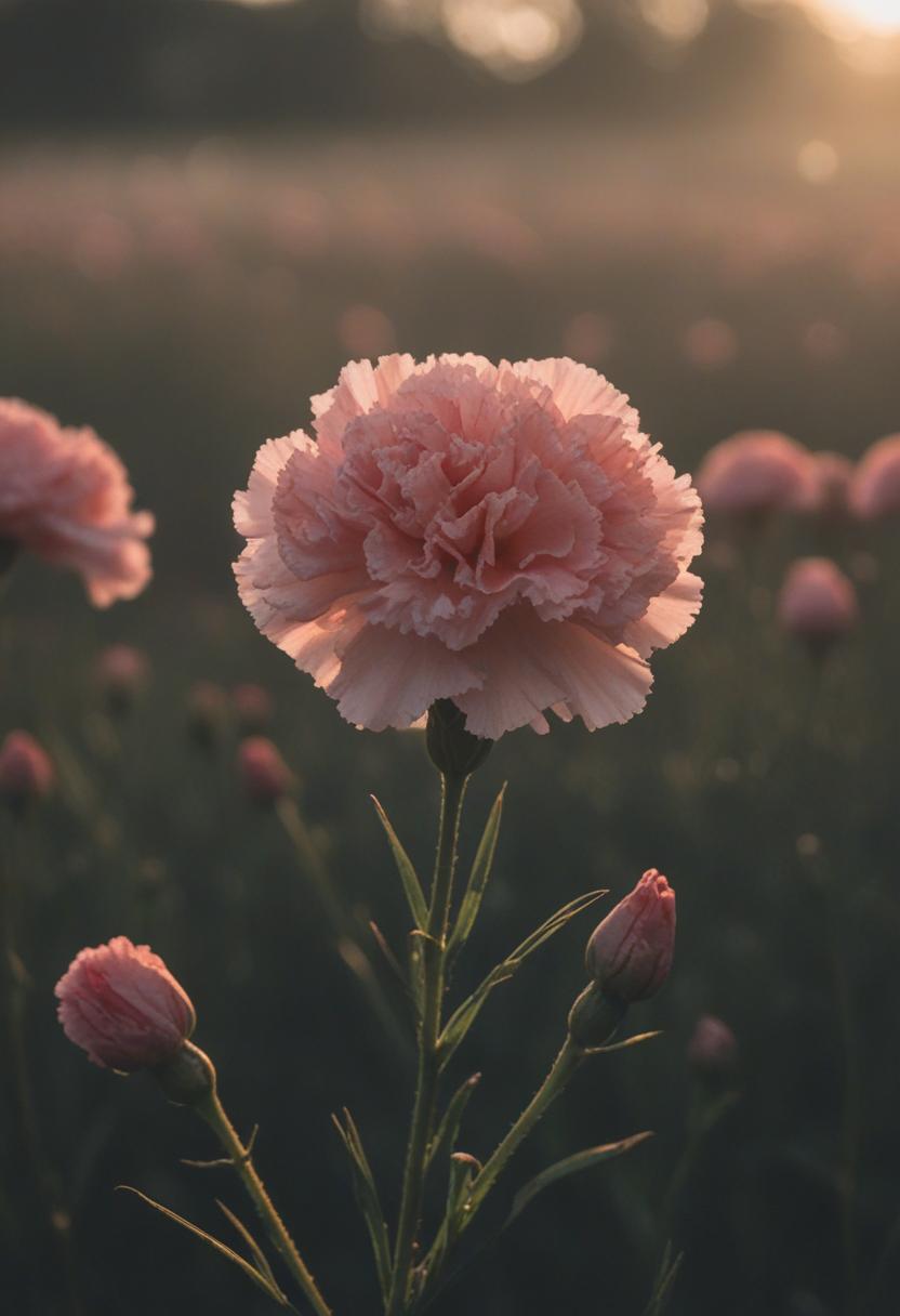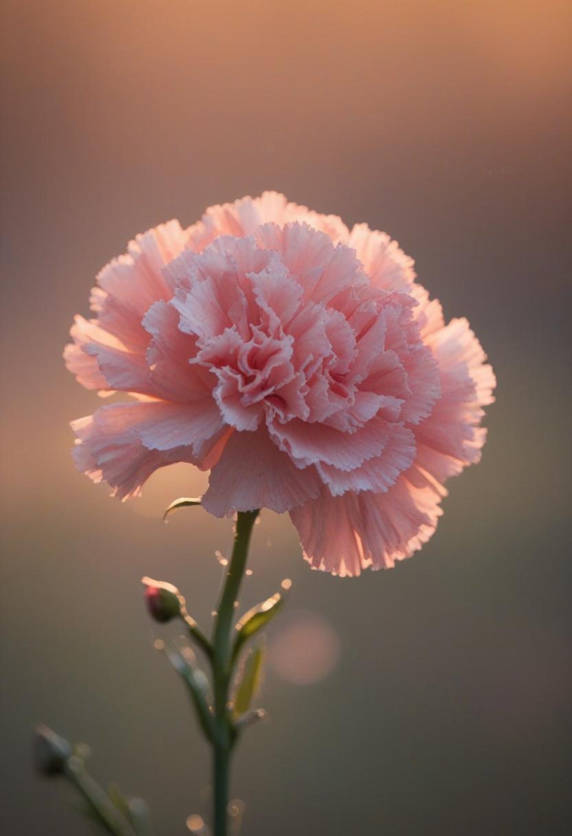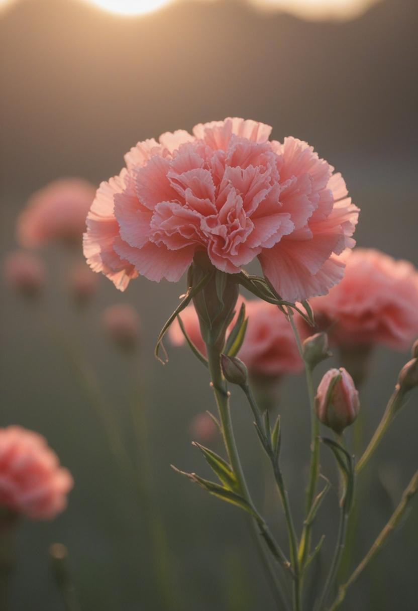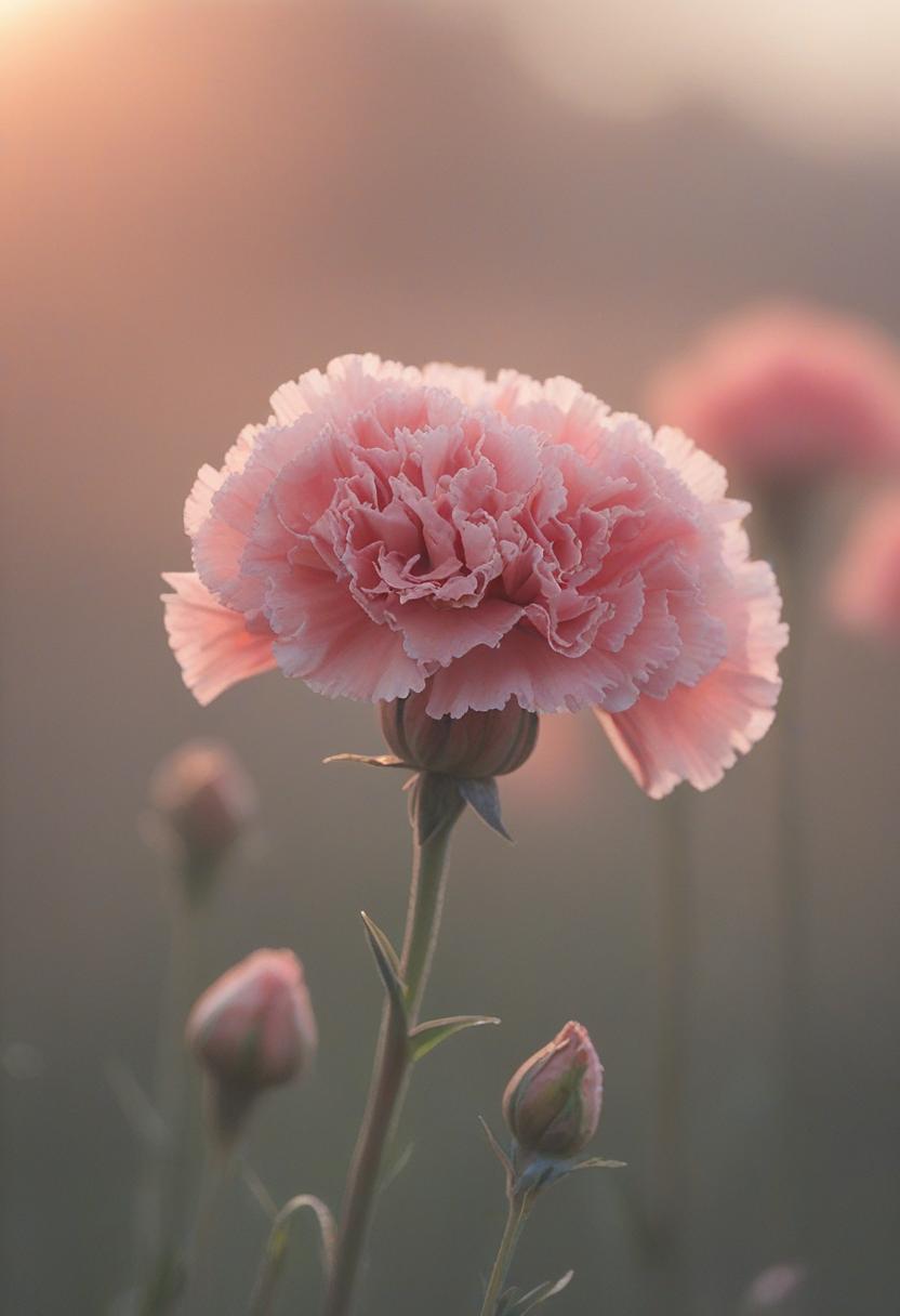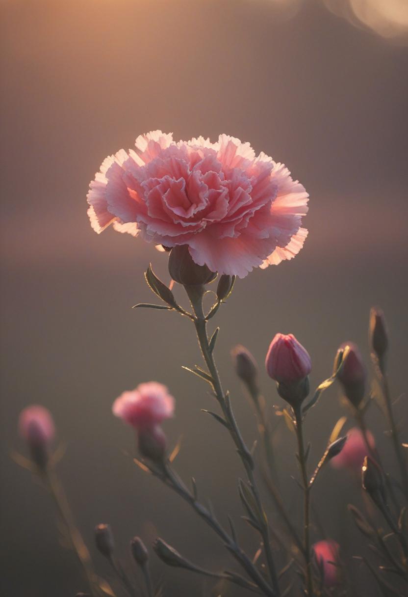 4. A dreamy wide-angle shot captures a carnation in the golden hour light, exuding soft warmth and romantic elegance, perfect for a serene, poetic atmosphere.