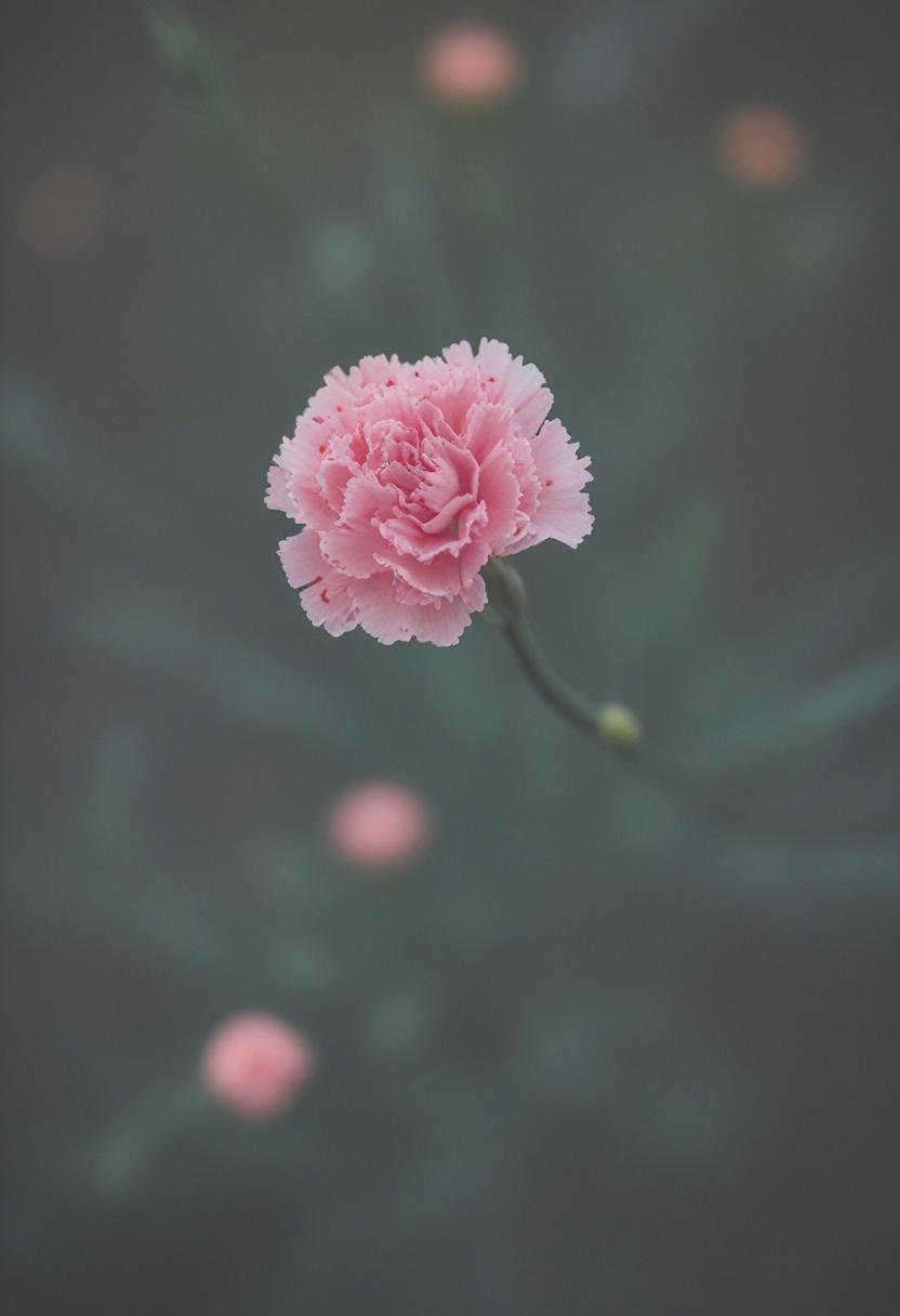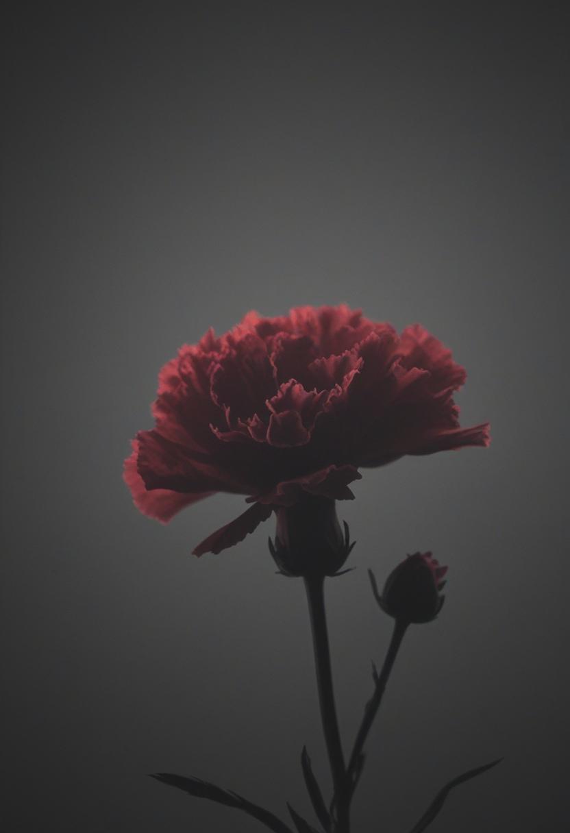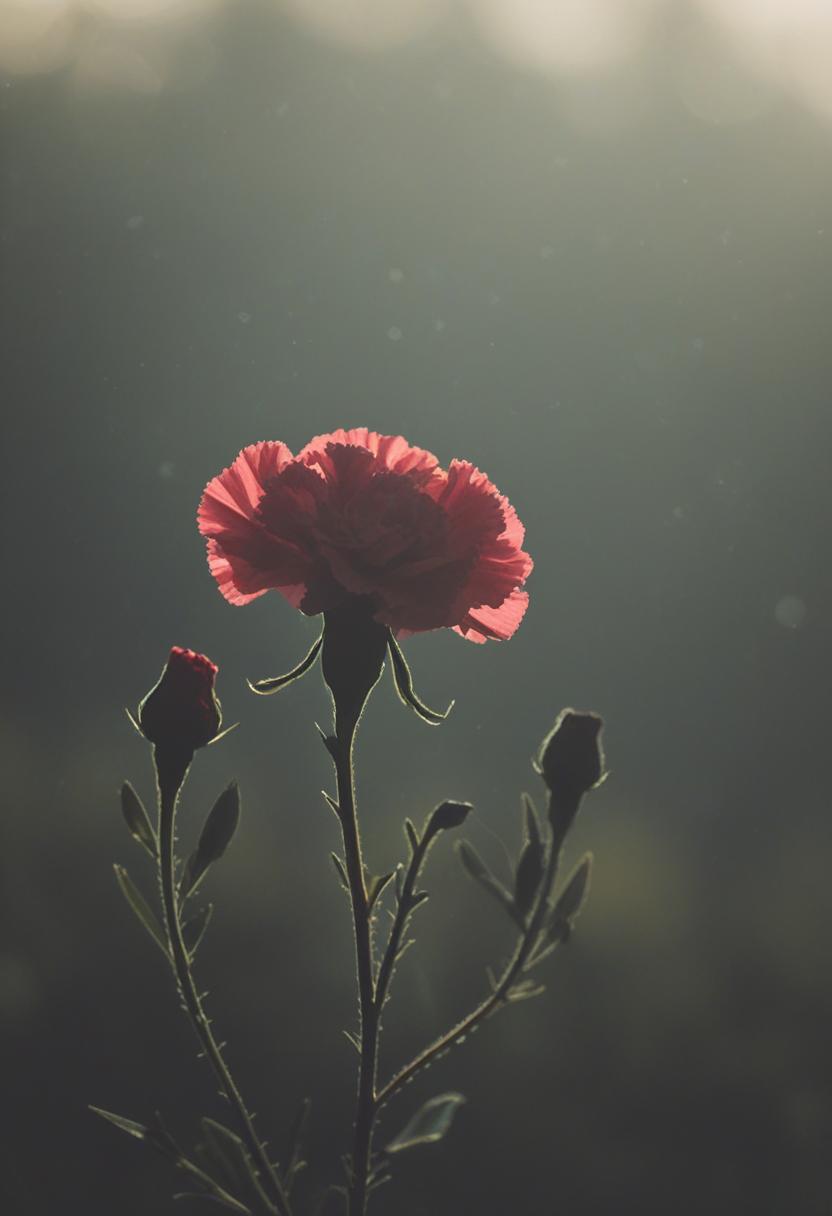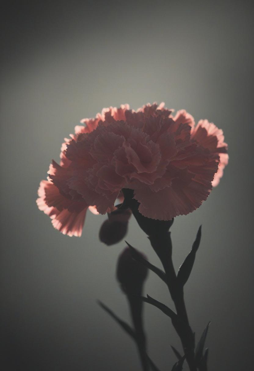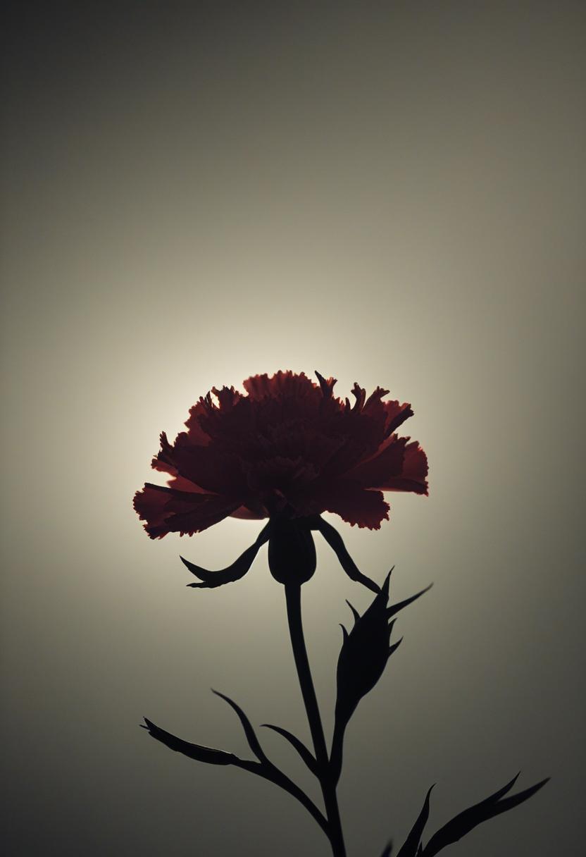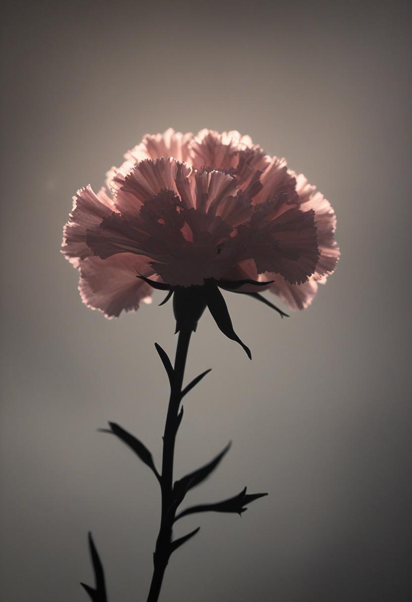 72. A moody wide-angle shot captures a carnation in dramatic backlighting, evoking a soft, ethereal carnation aesthetic with deep shadows and soft light.