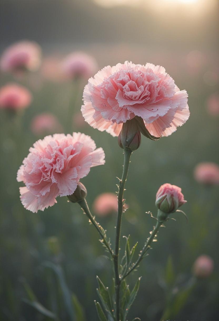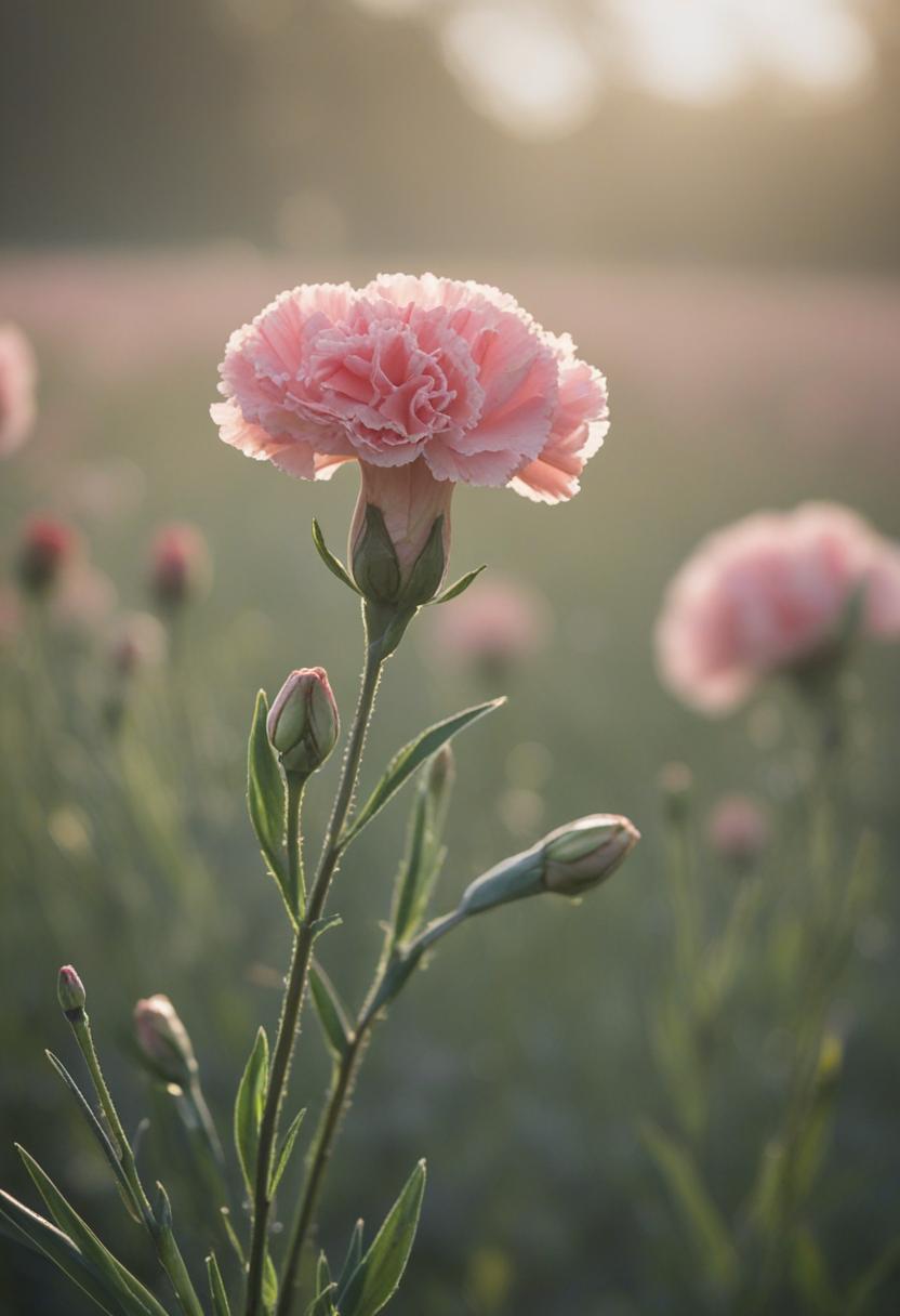 89. A soft morning light bathes a scenic view in a gentle glow, surrounded by the delicate beauty of a carnation, exuding a peaceful and romantic carnation aesthetic.