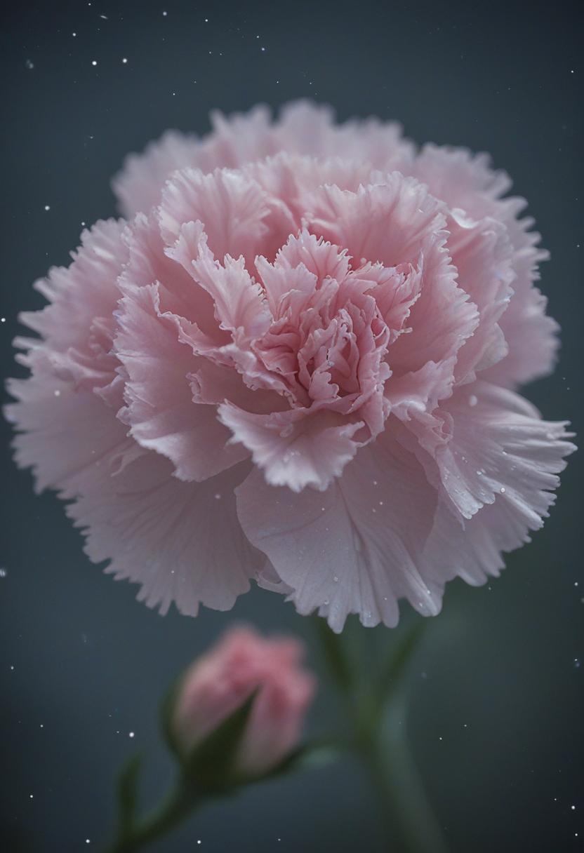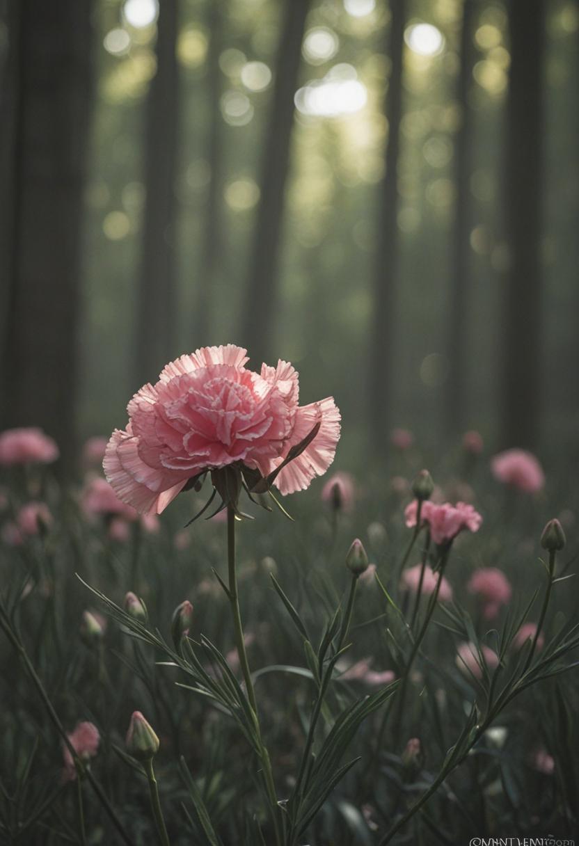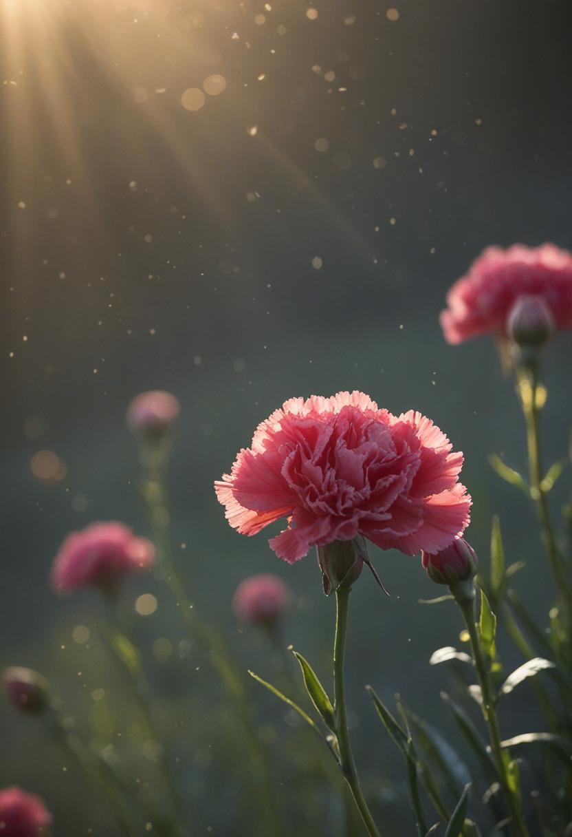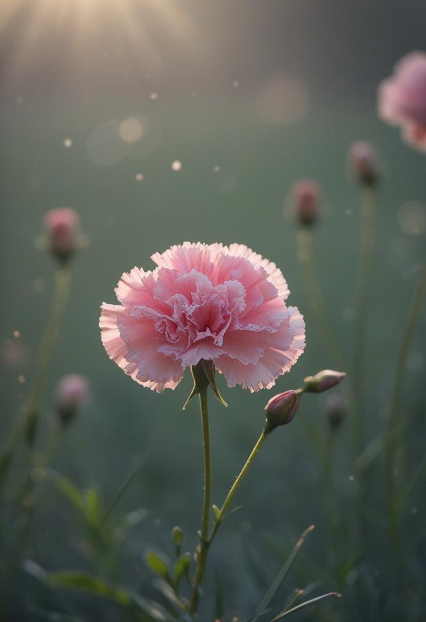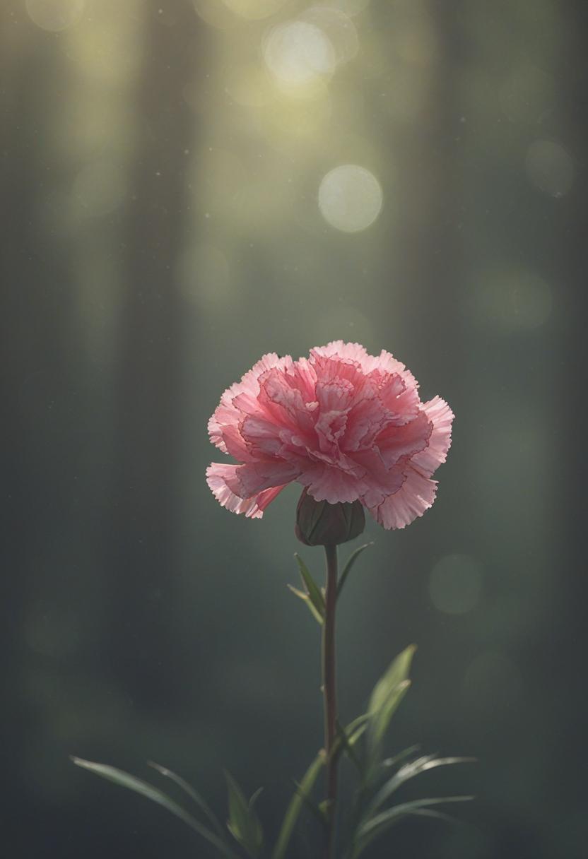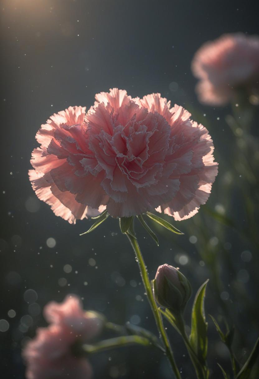 69. A wide-angle shot captures a dramatic carnation under ethereal backlighting, creating a soft, dreamy carnation aesthetic with a mysterious and enchanting atmosphere.