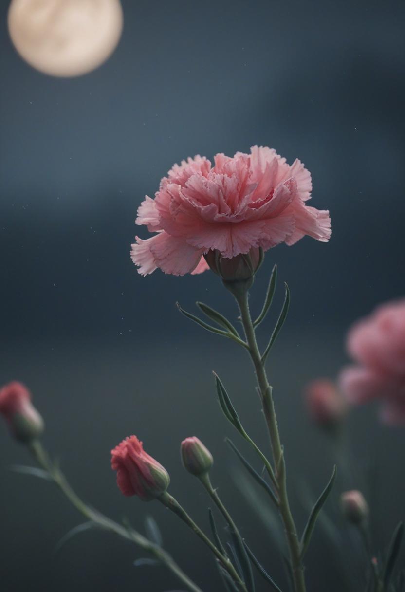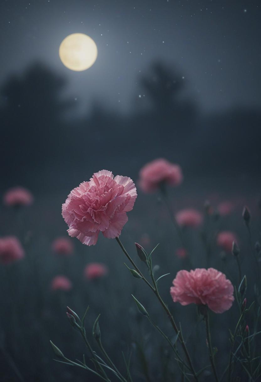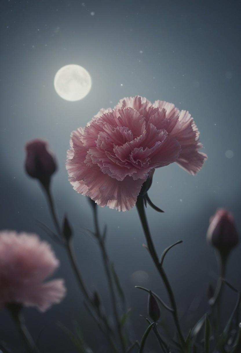 44. A vibrant carnation bathes in soft moonlight, captured in a lively midshot that blends romantic elegance with a dreamy, enchanting atmosphere.