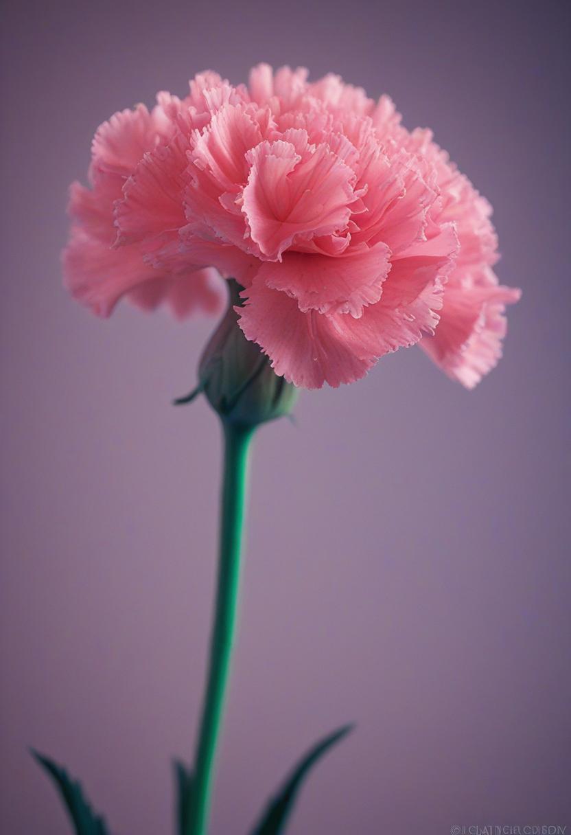 90. A soft morning light bathes a vibrant carnation in a midshot, capturing the flower's delicate beauty with a gentle, serene carnation aesthetic.
