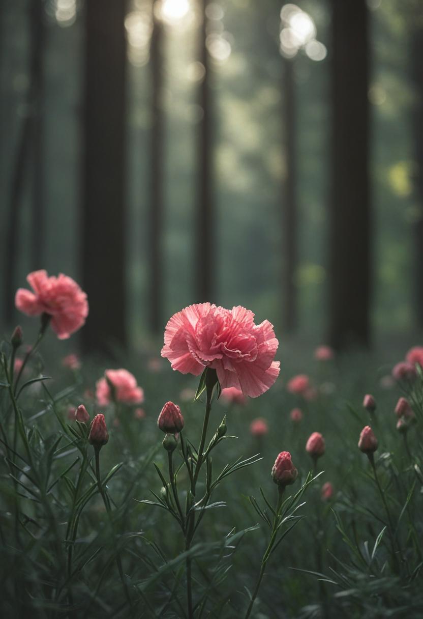 76. A soft midshot of a dappled forest bathed in warm, nostalgic light, surrounded by blooming carnations, evoking a gentle, romantic, and dreamy atmosphere.