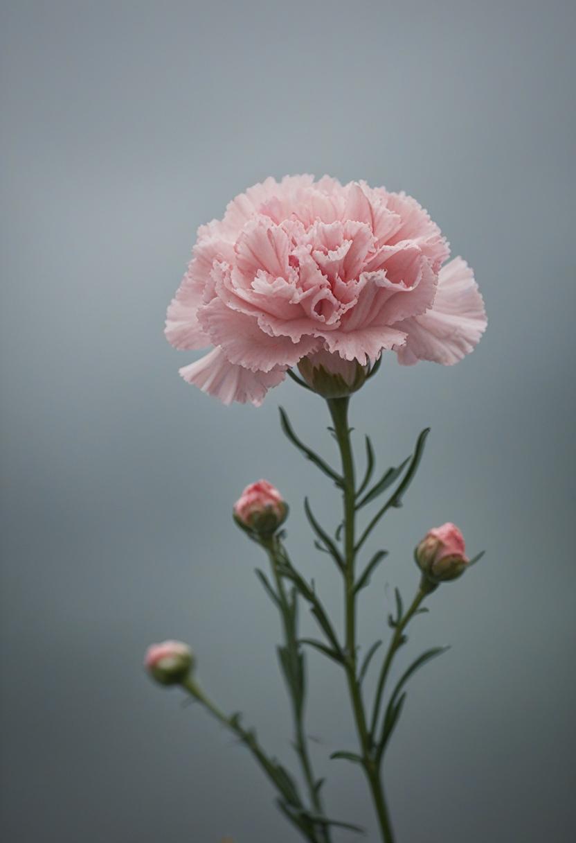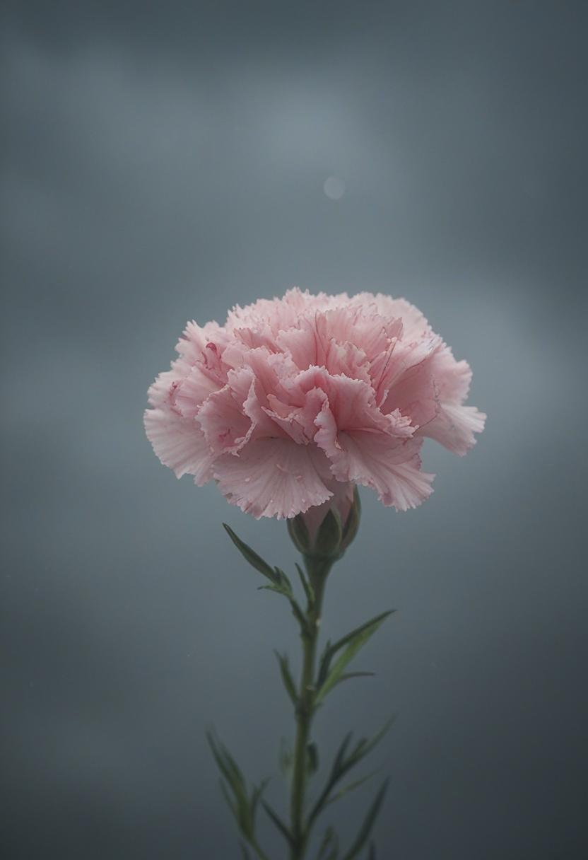 88. A mysterious studio shot featuring a carnation under cloudy, overcast skies, exuding a soft, ethereal glow. The atmosphere is calm and enigmatic, blending delicate beauty with an air of quiet intrigue.