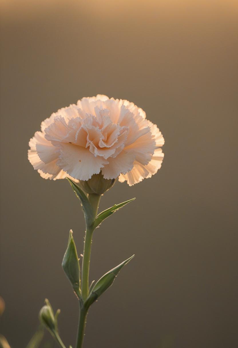 21. A minimalist side view of a carnation under a soft sunset glow, exuding a calm, serene carnation aesthetic with gentle light and muted tones.