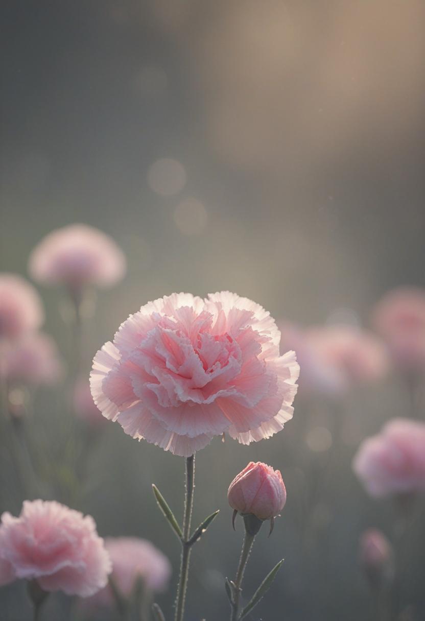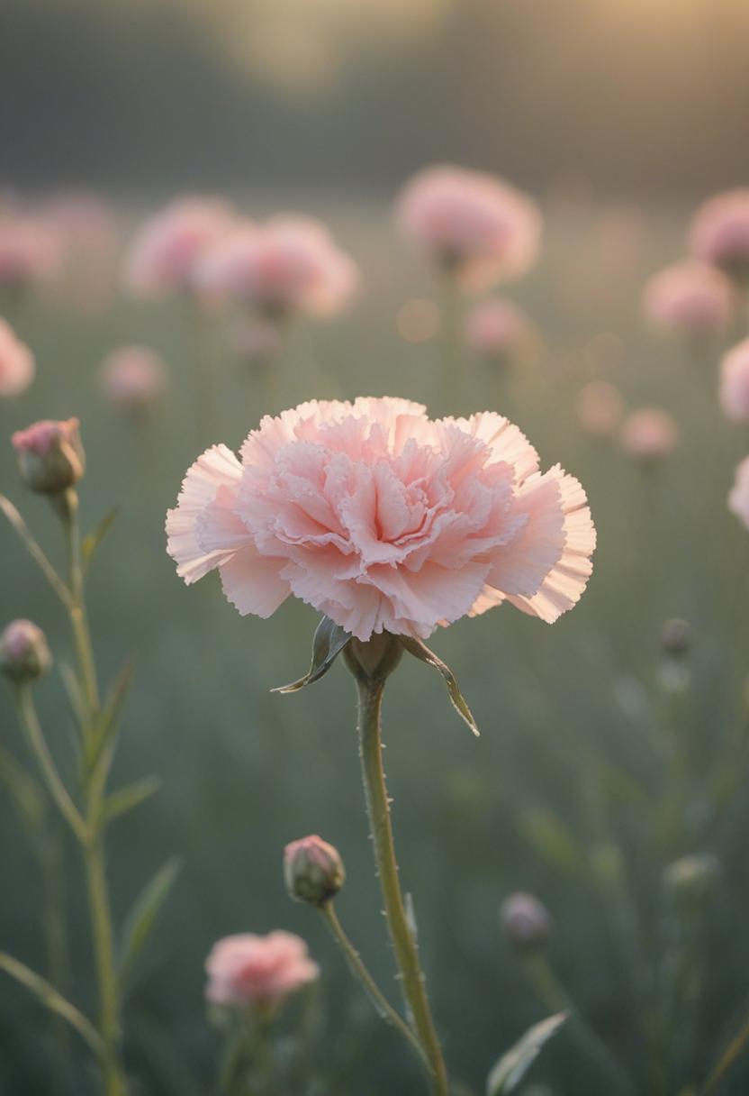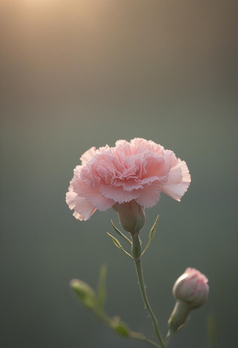 91. A soft morning light bathes a midshot of a carnation, capturing its delicate petals in a gentle glow, evoking a serene and romantic carnation aesthetic.