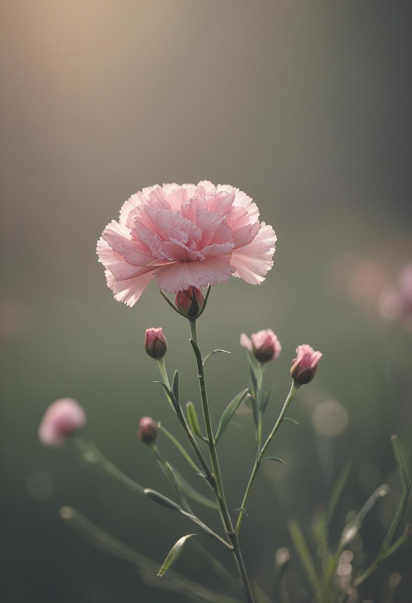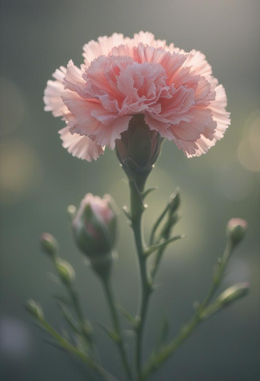 98. A soft, enchanting close-up of a carnation bathed in gentle morning light, capturing its delicate petals and vibrant color in a serene, dreamy atmosphere.
