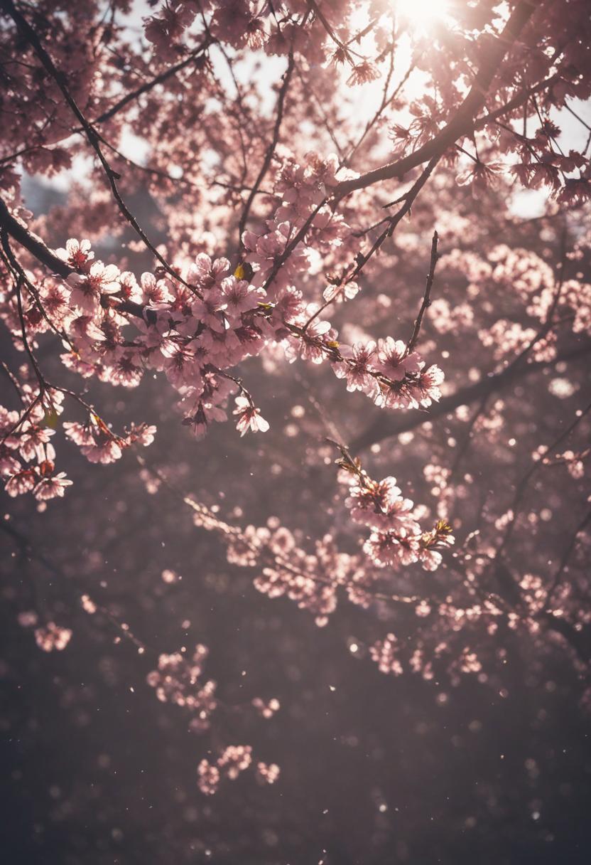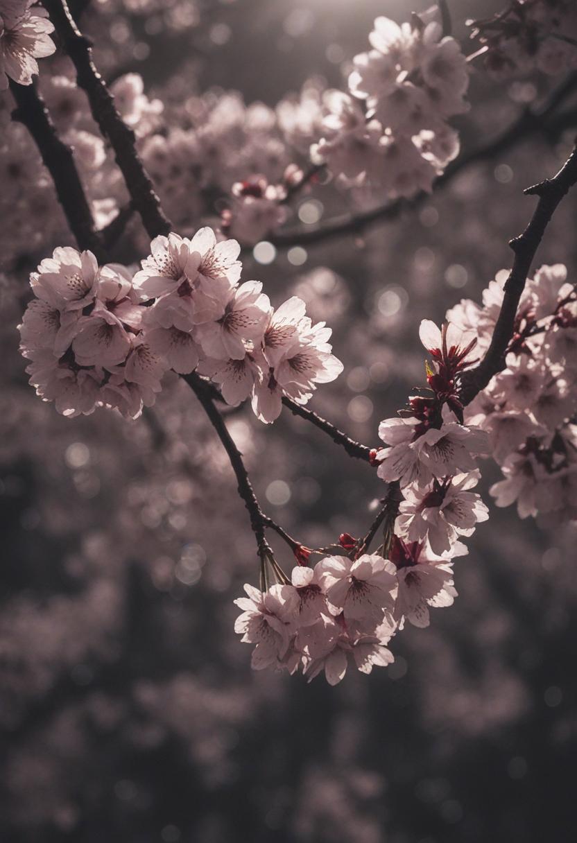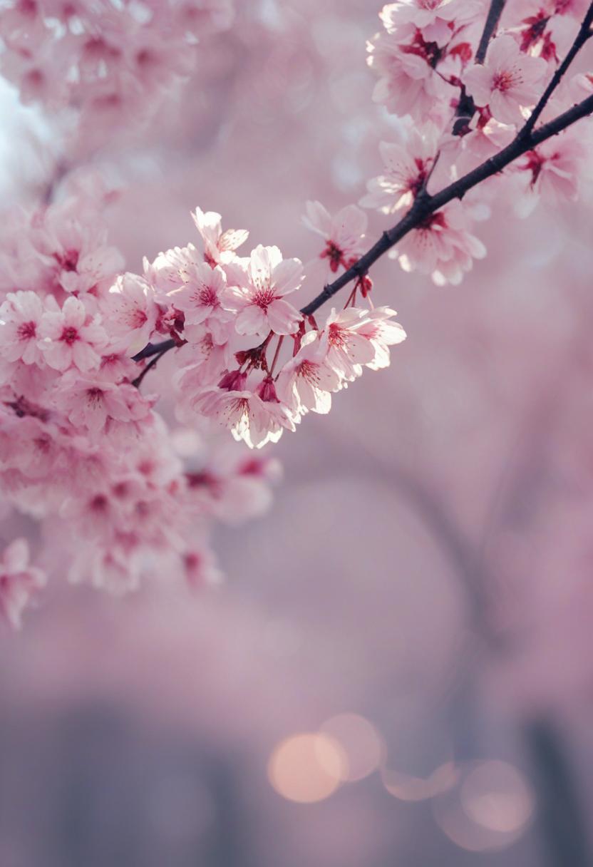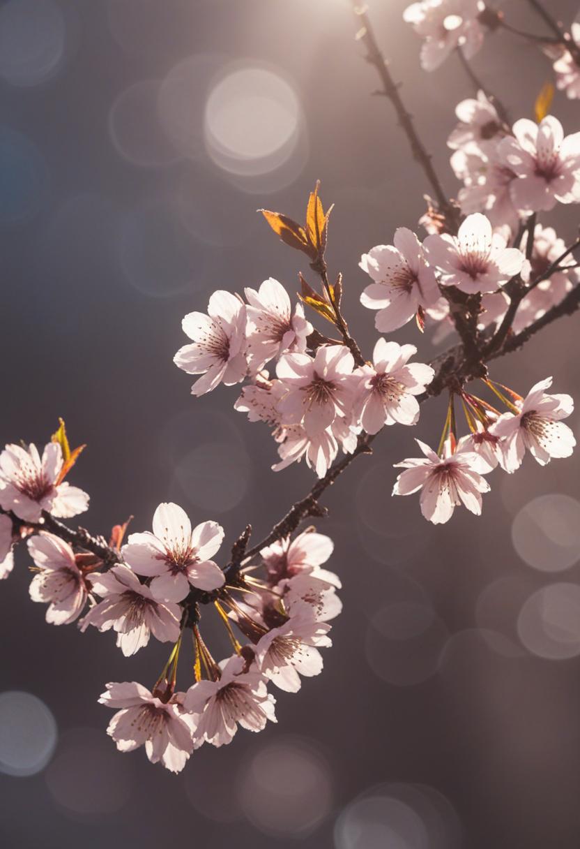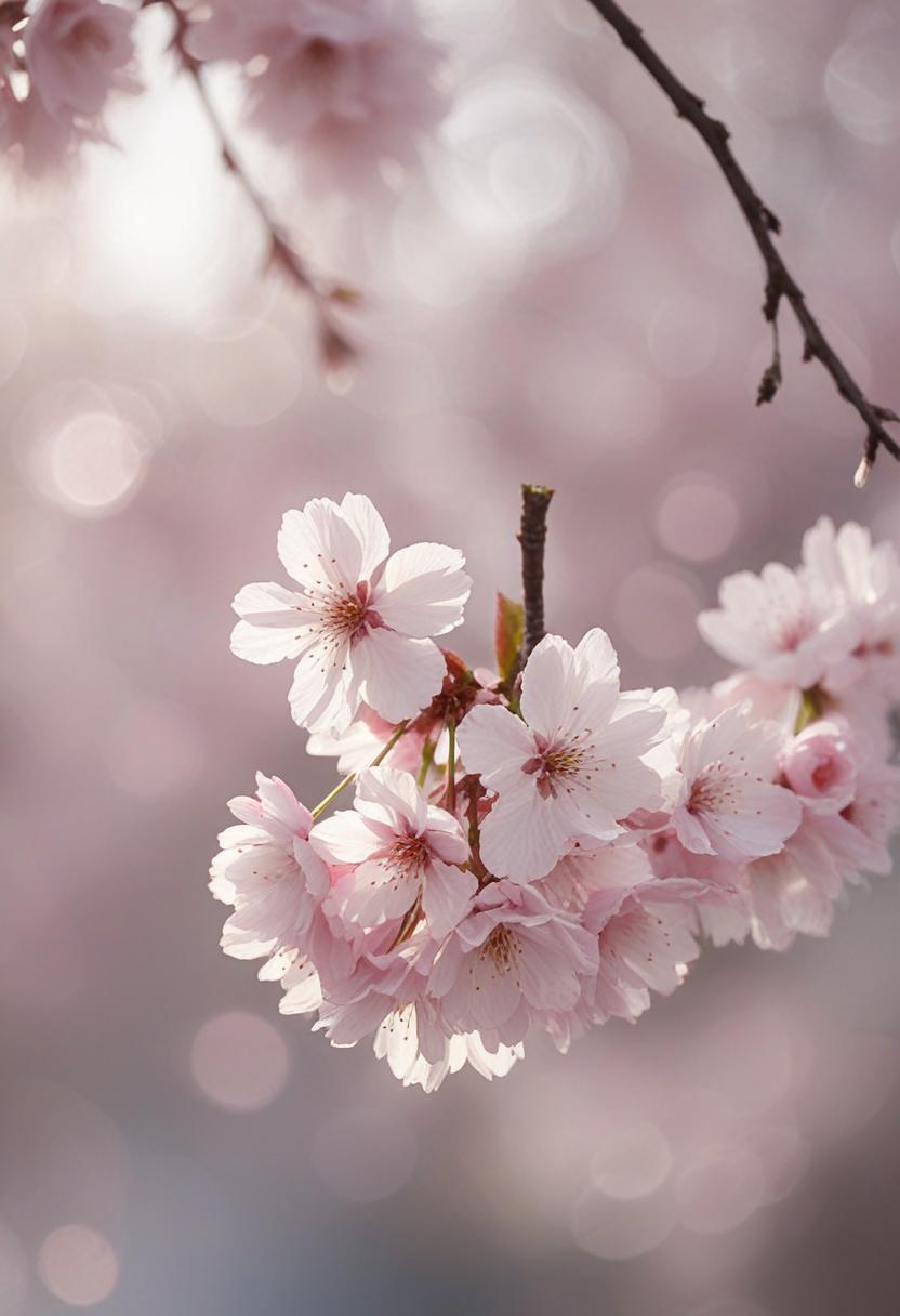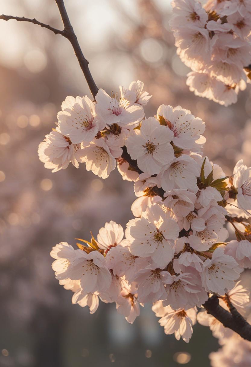 75. A lively close-up of a cherry blossom silhouette bathed in soft lighting, capturing the serene beauty of spring in a delicate, aesthetic style.