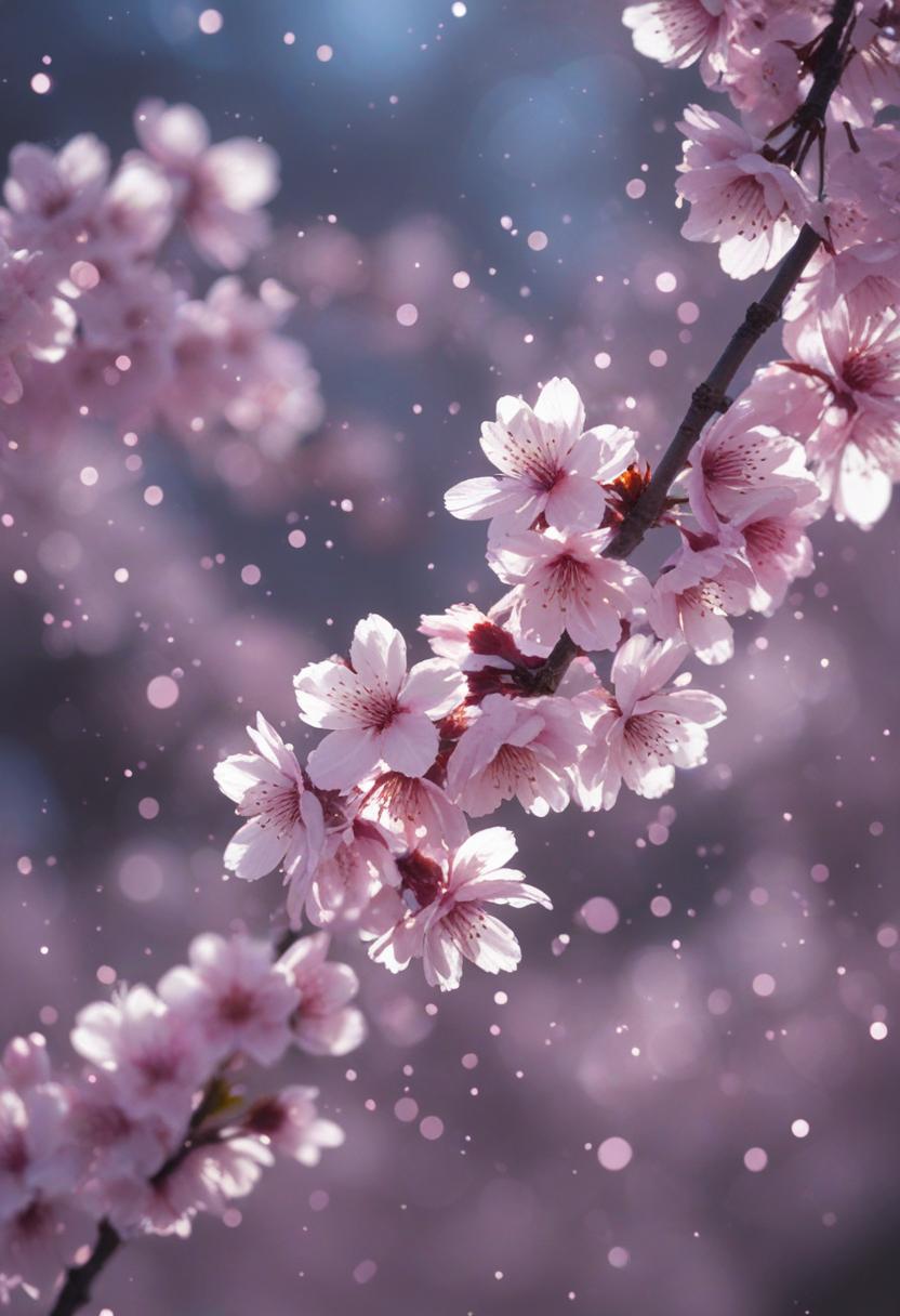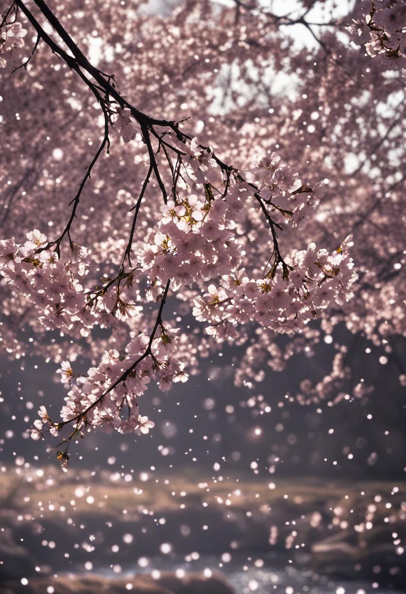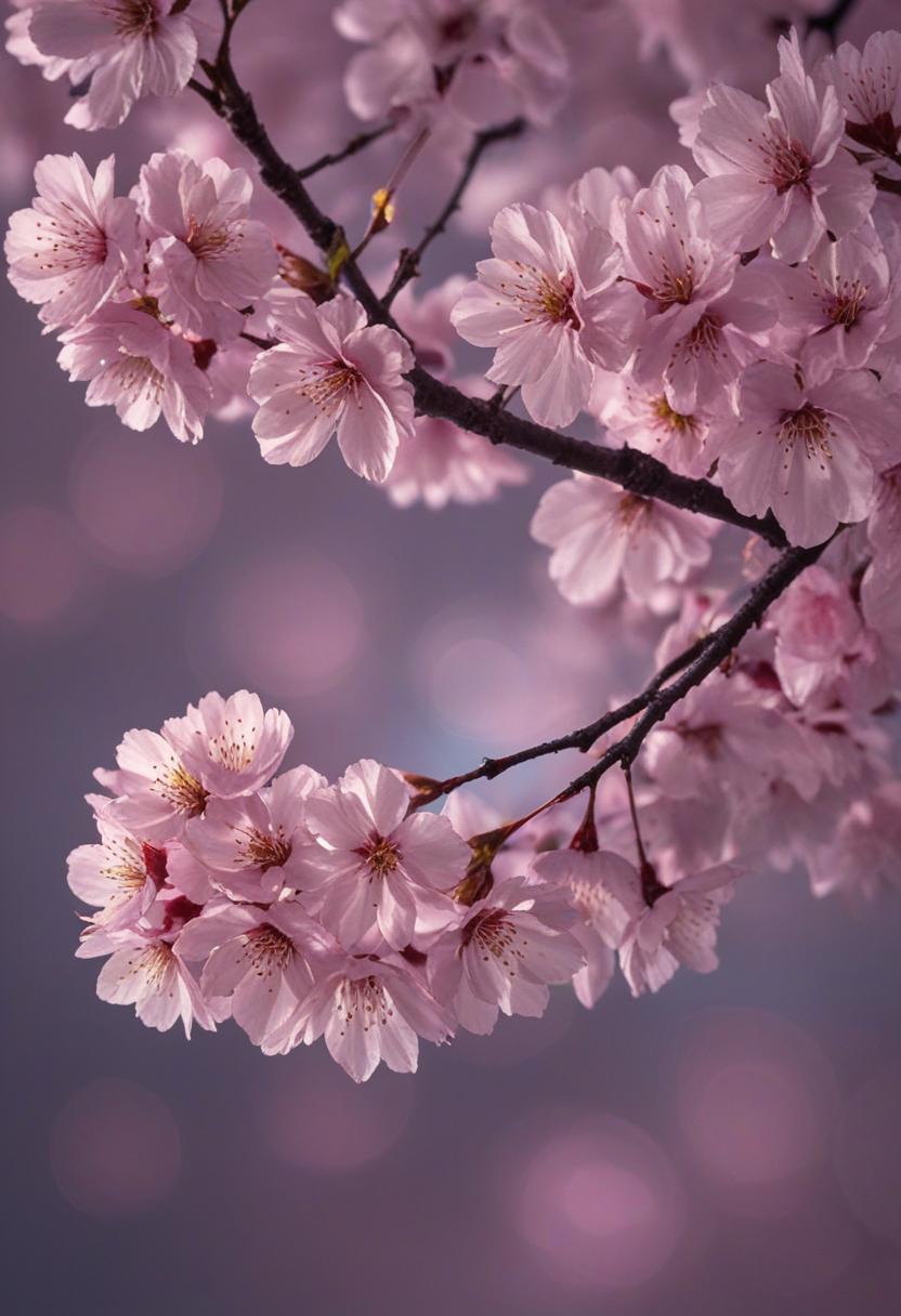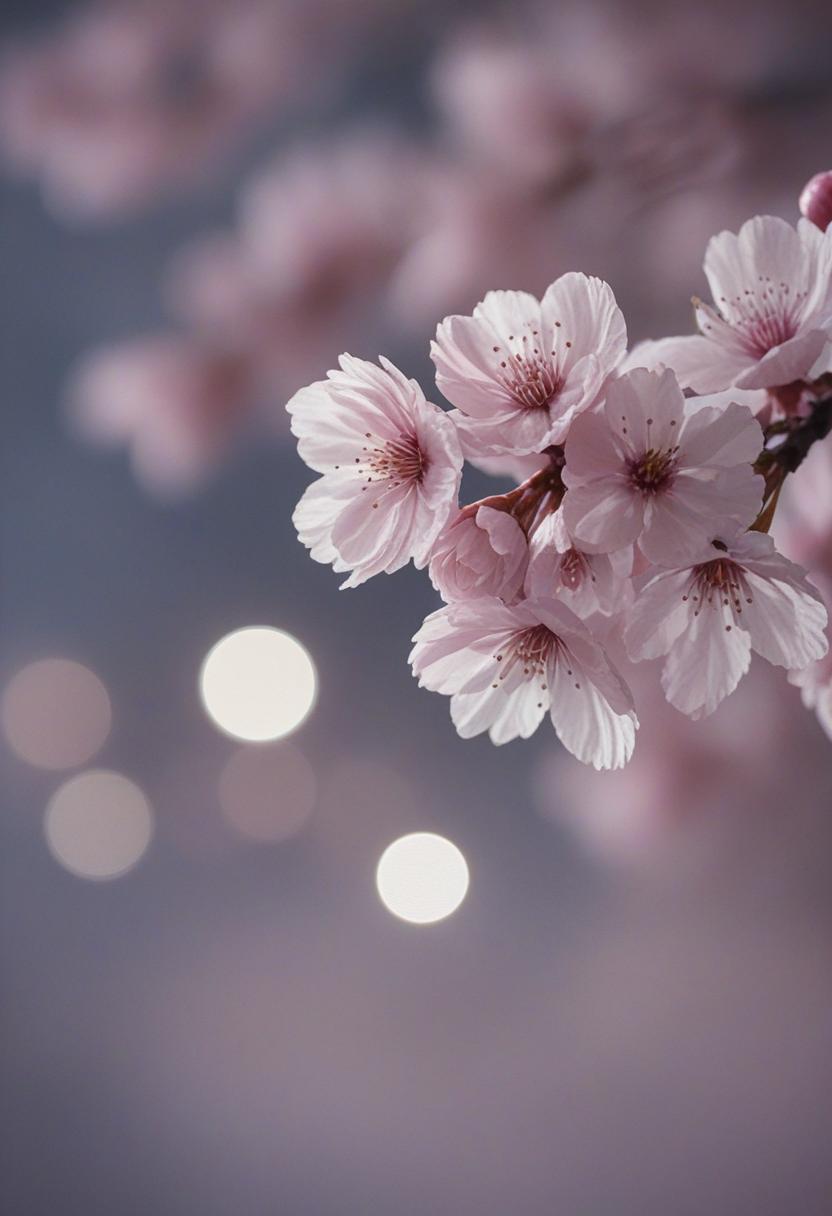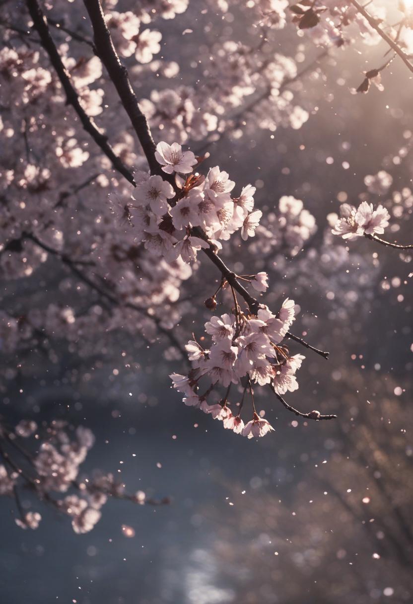75. A lively close-up of a cherry blossom silhouette bathed in soft lighting, capturing the serene beauty of spring in a delicate, aesthetic style.