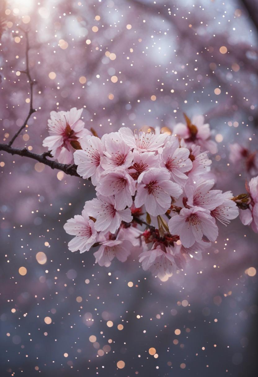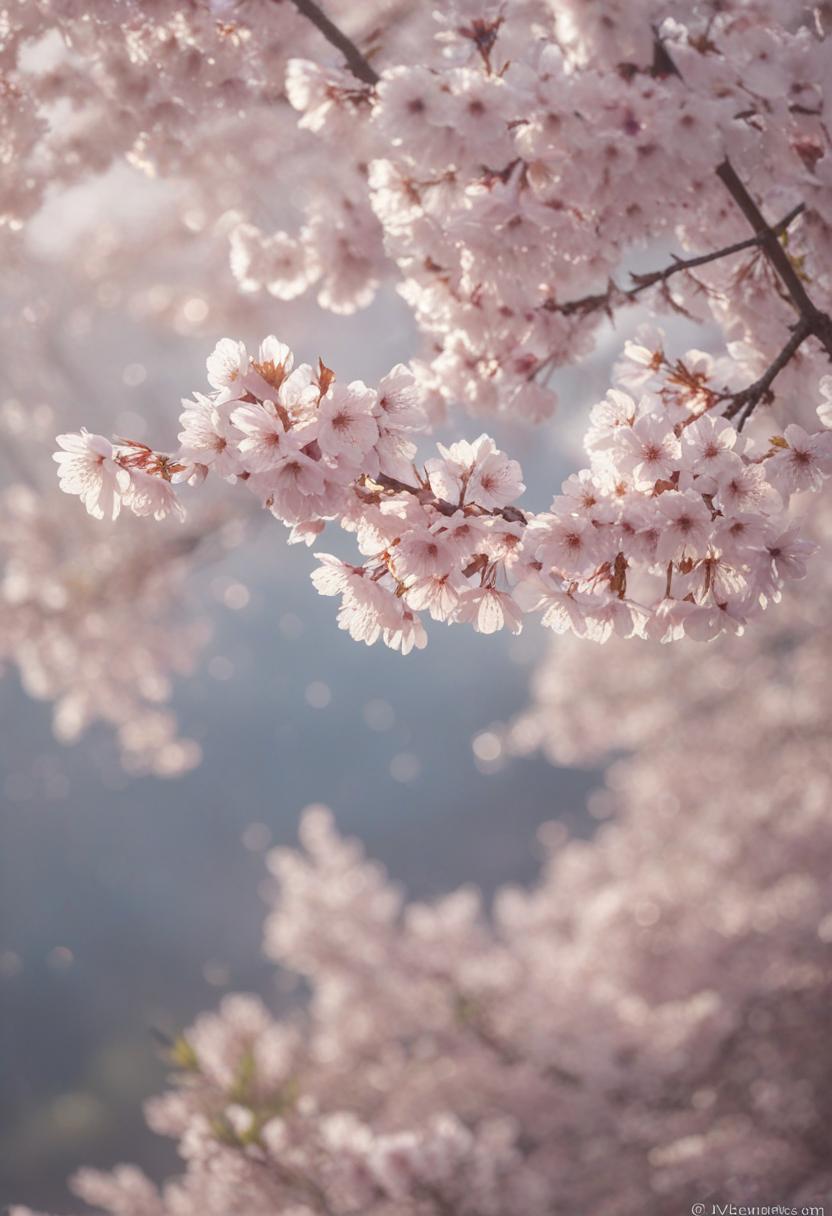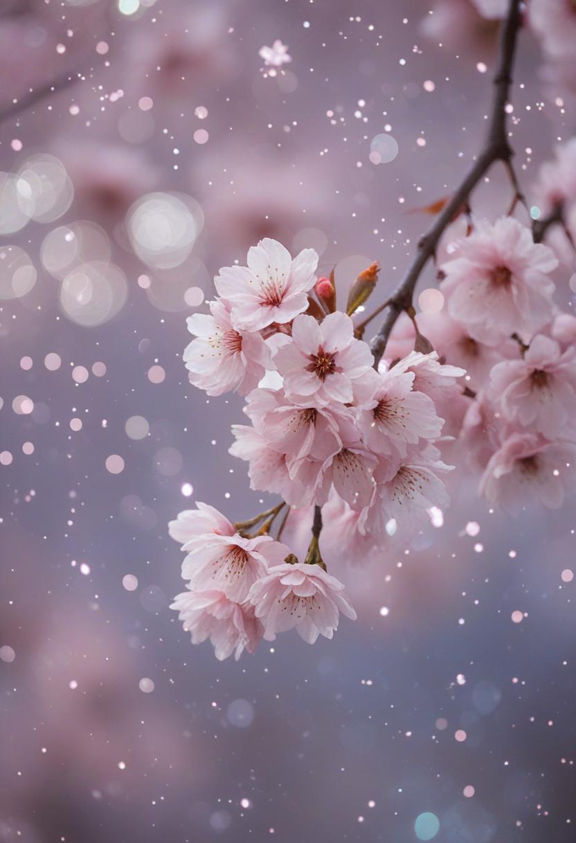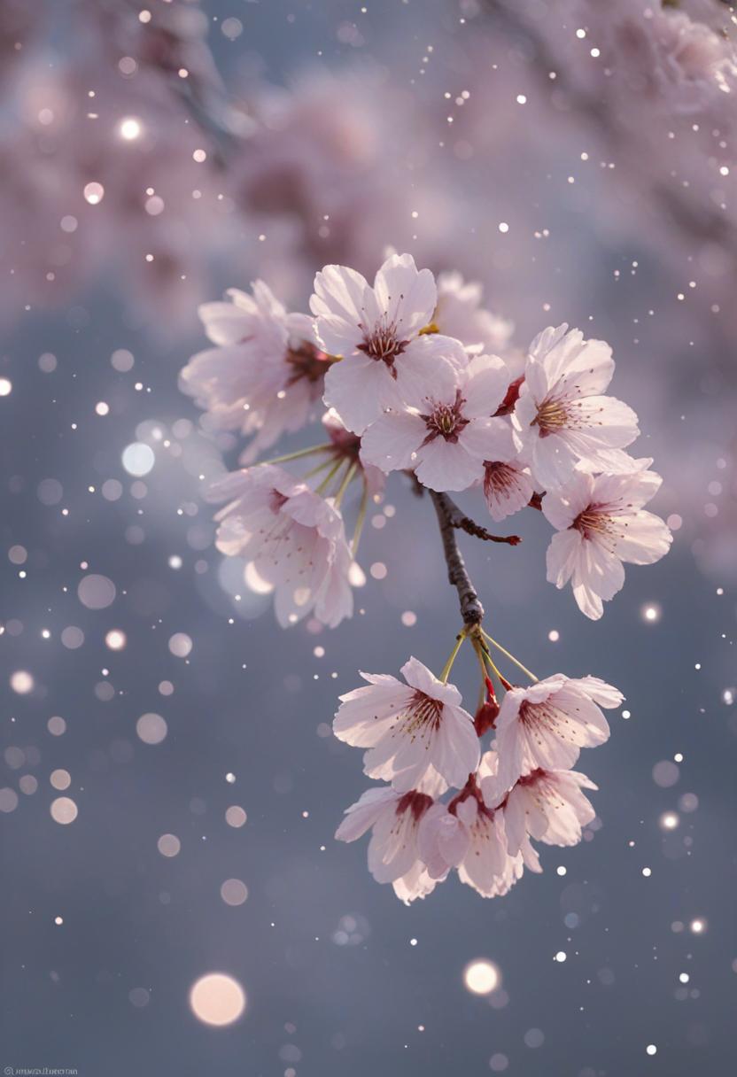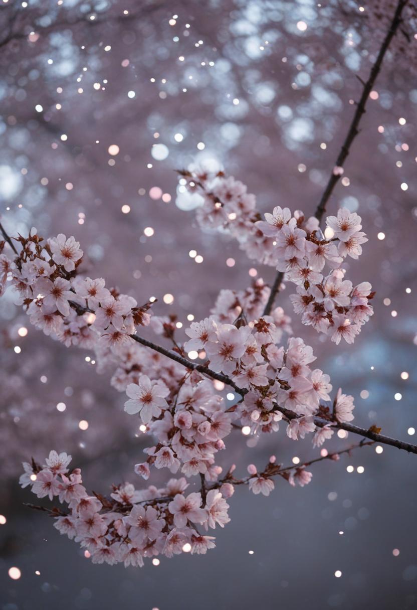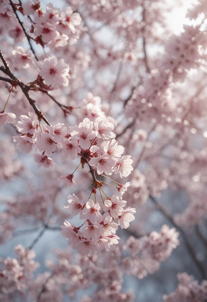 75. A lively close-up of a cherry blossom silhouette bathed in soft lighting, capturing the serene beauty of spring in a delicate, aesthetic style.