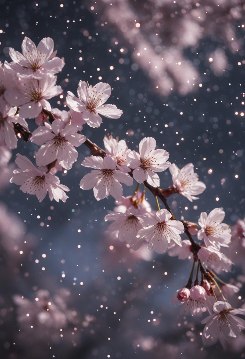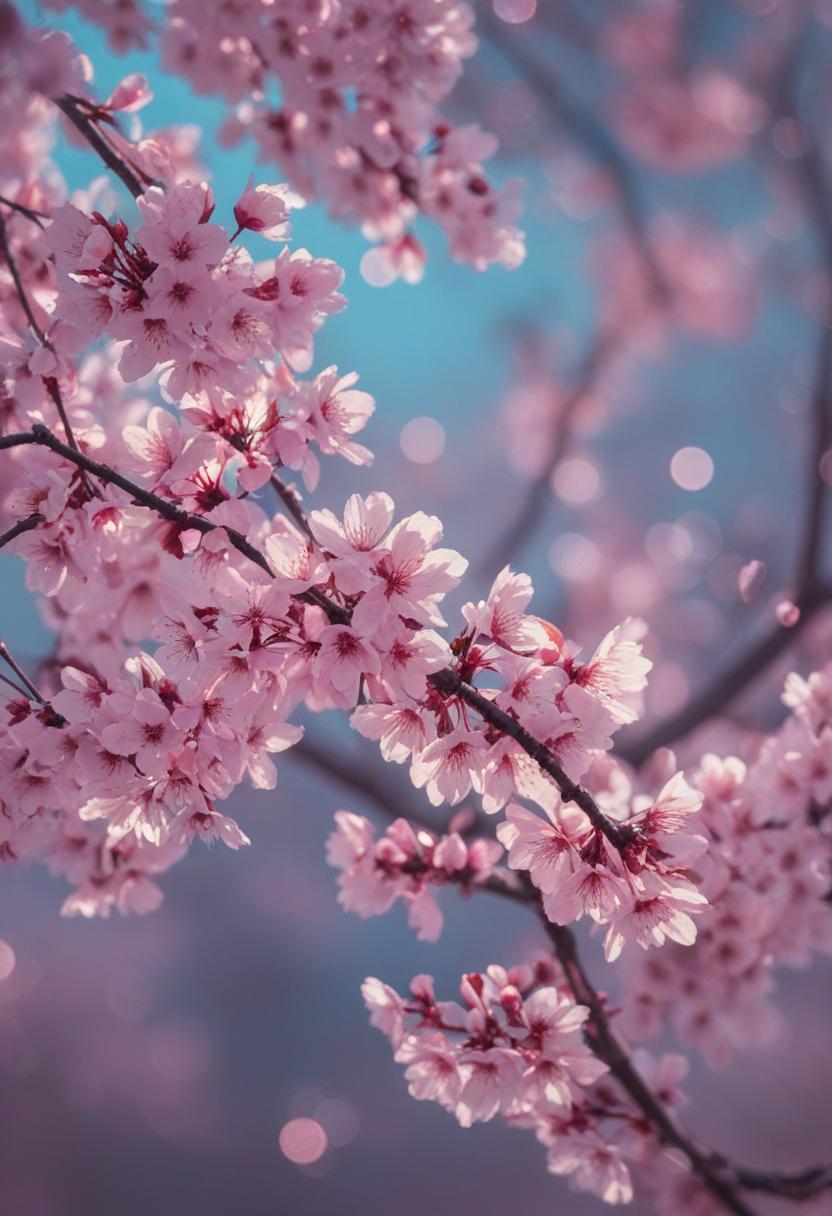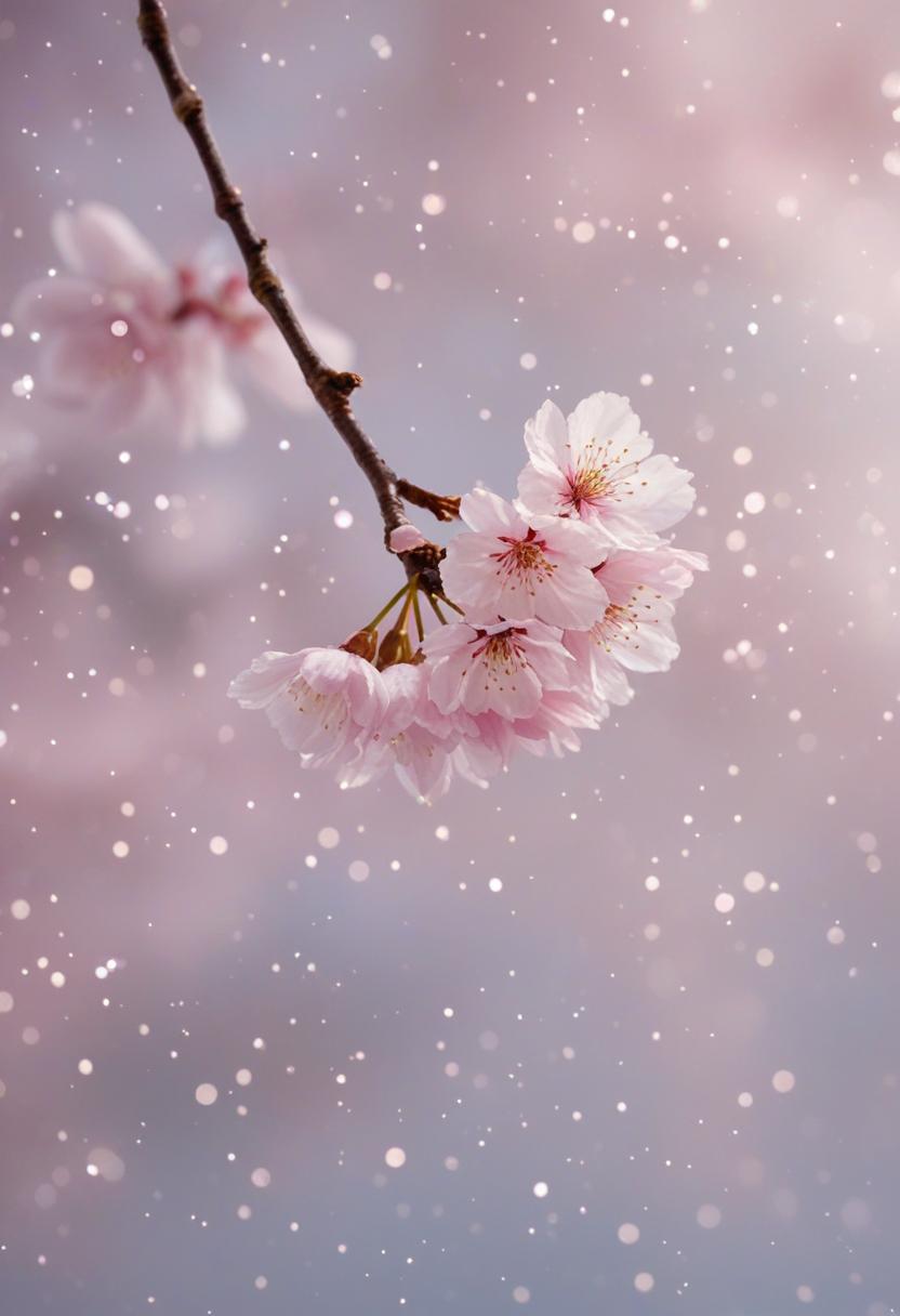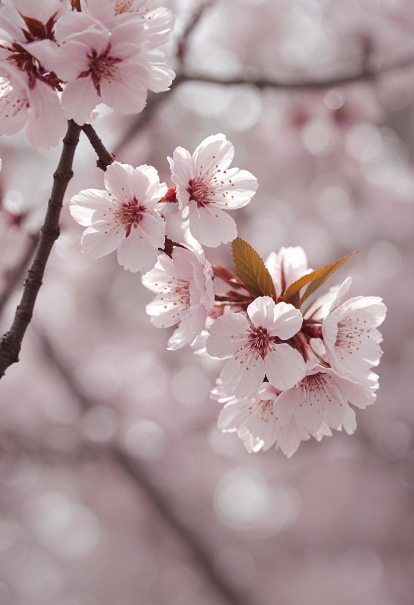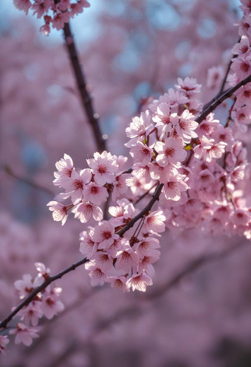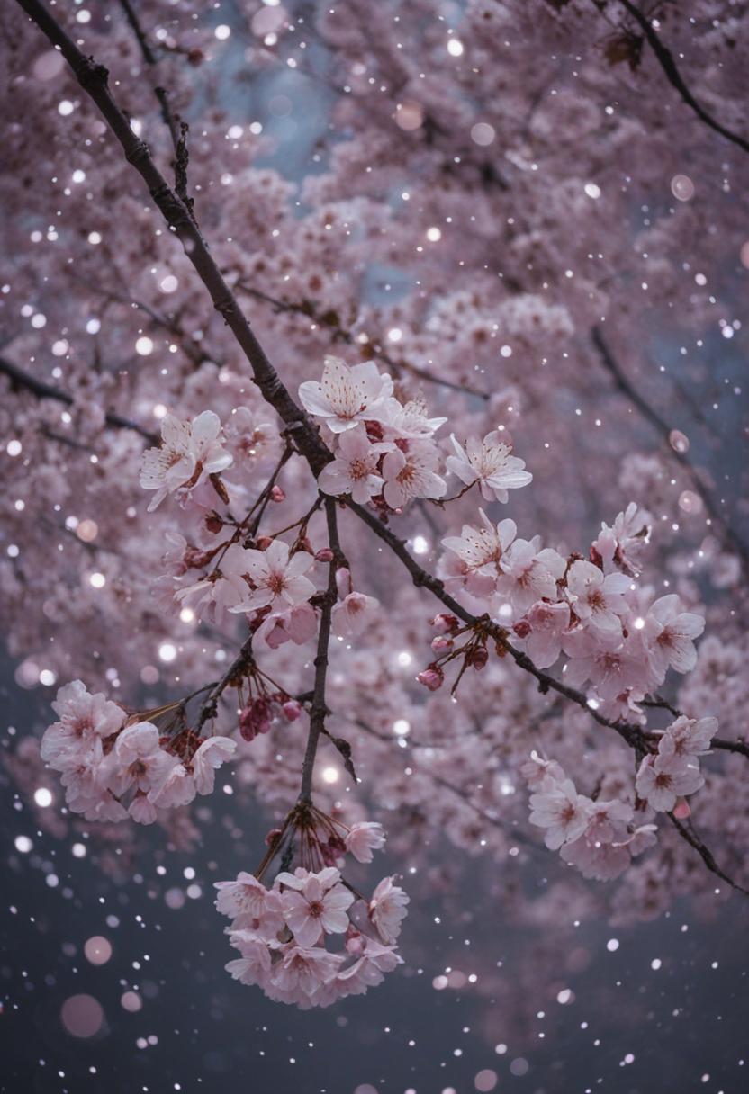 75. A lively close-up of a cherry blossom silhouette bathed in soft lighting, capturing the serene beauty of spring in a delicate, aesthetic style.