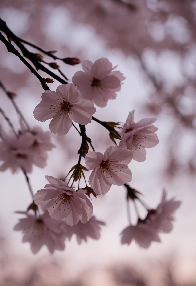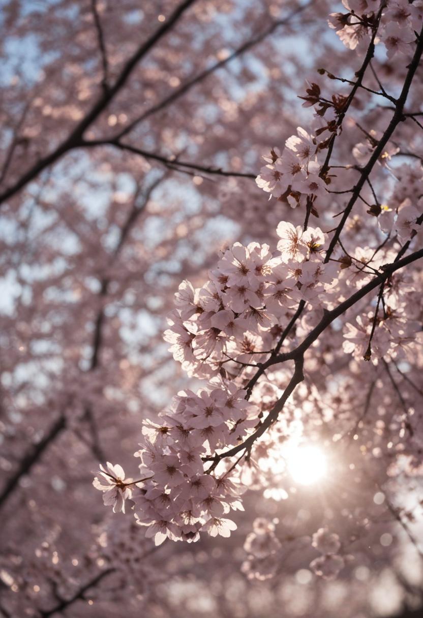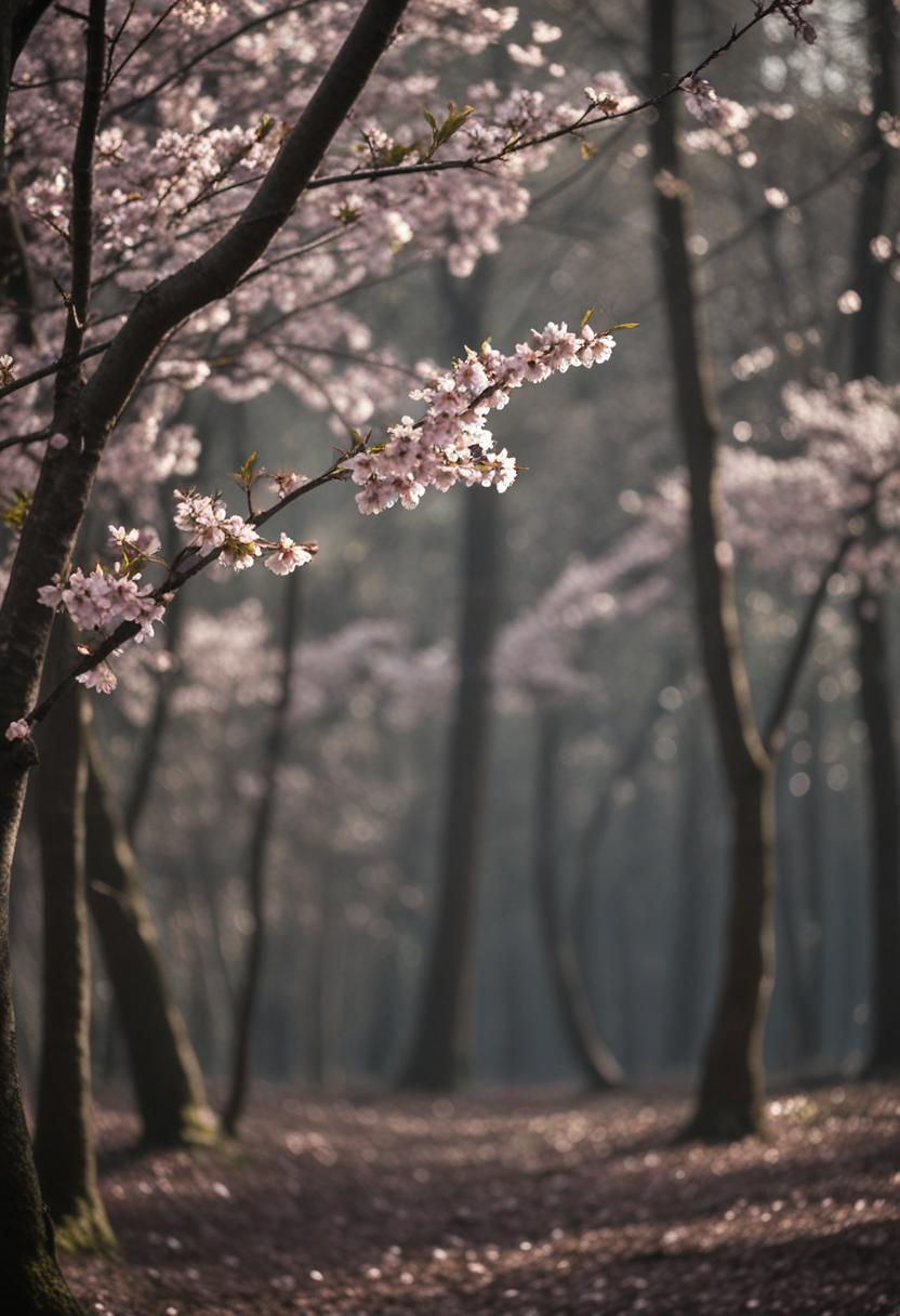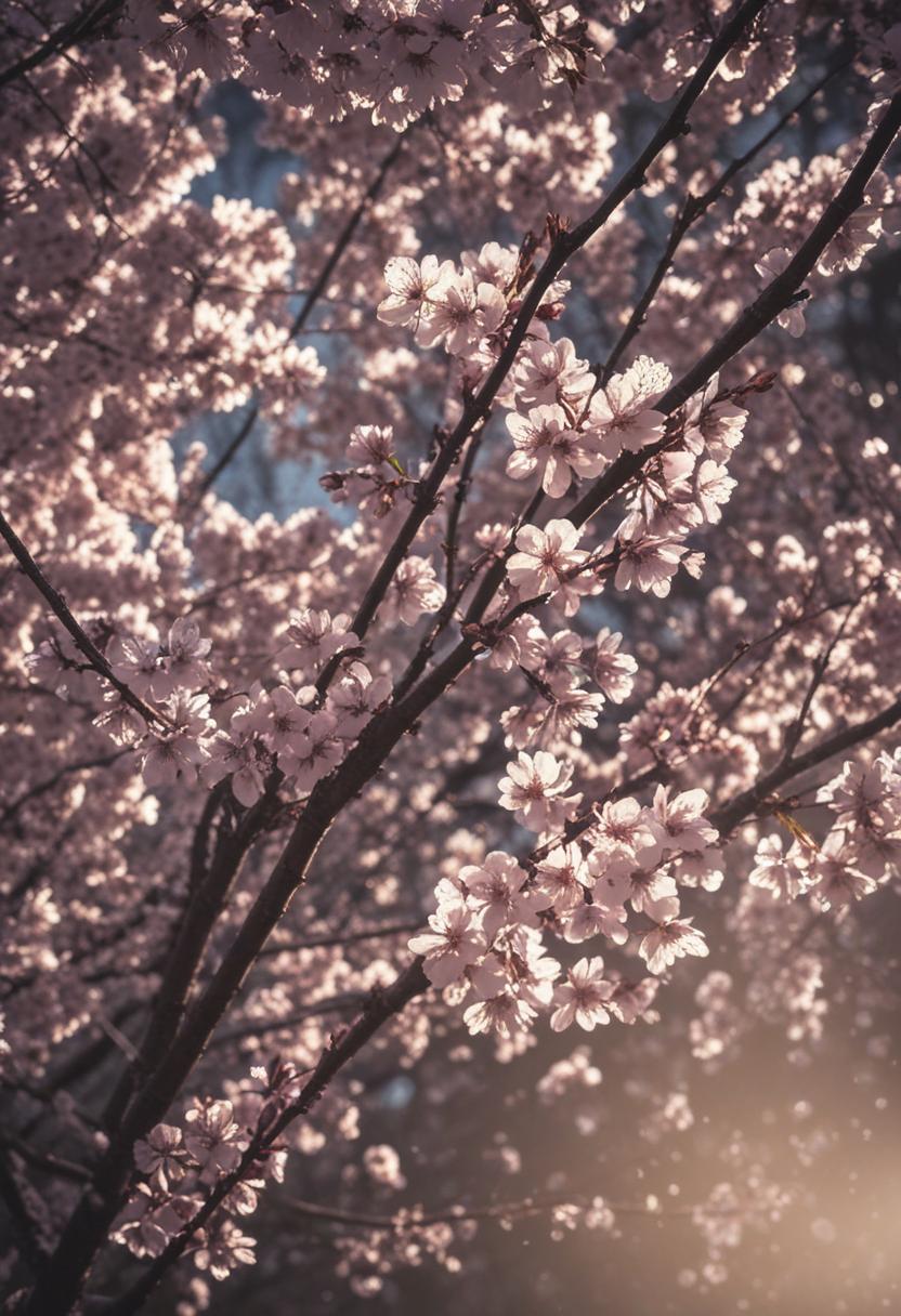 1. A dramatic midshot of a cherry blossom silhouette against soft lighting, capturing the serene beauty of spring with a poetic, ethereal vibe.