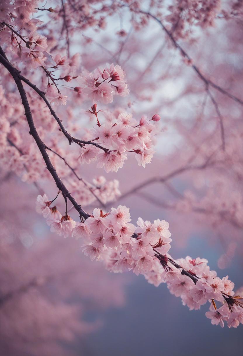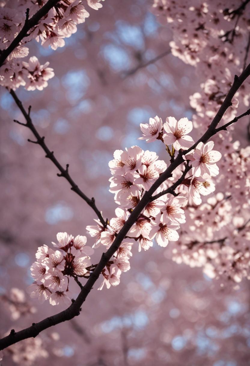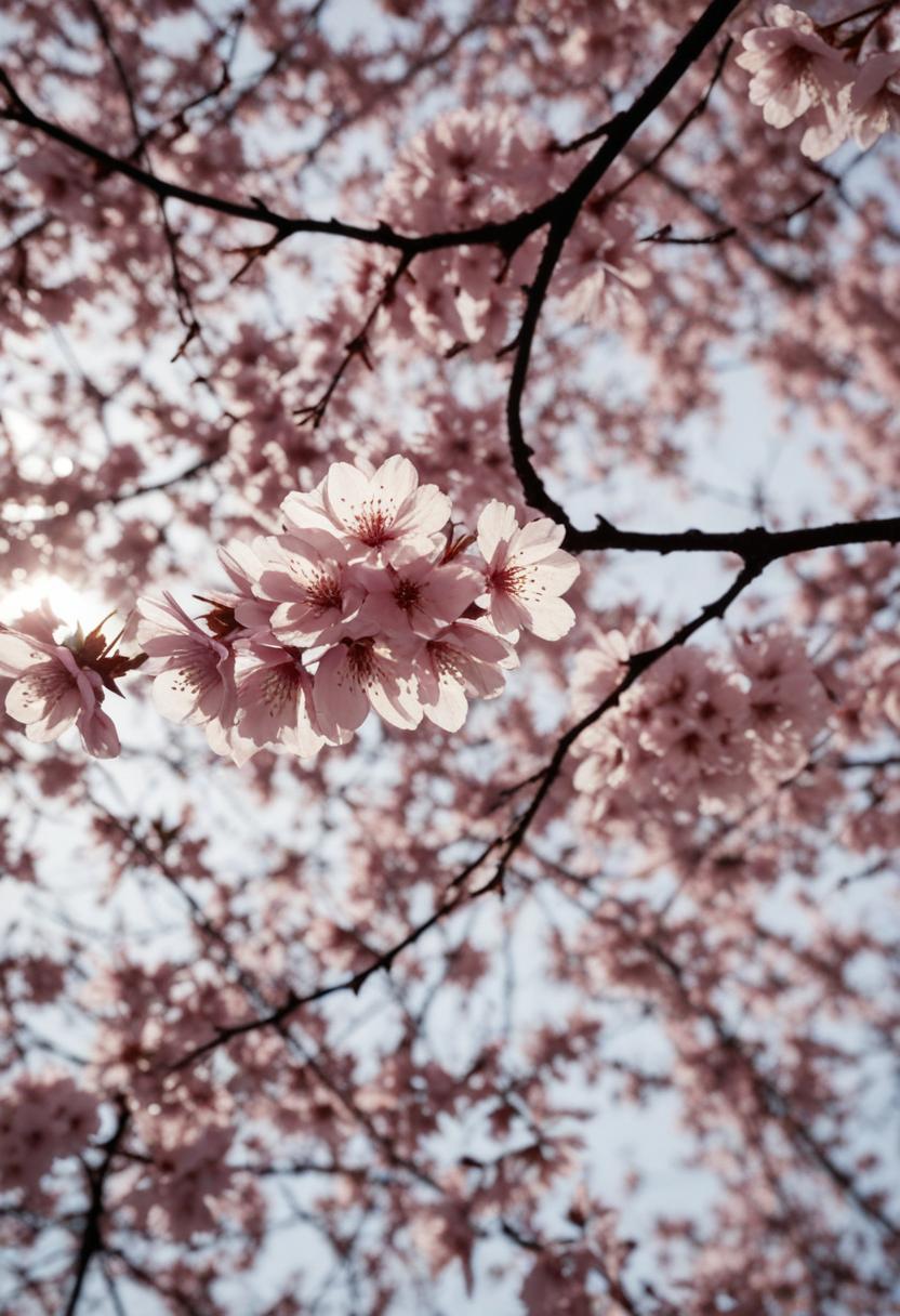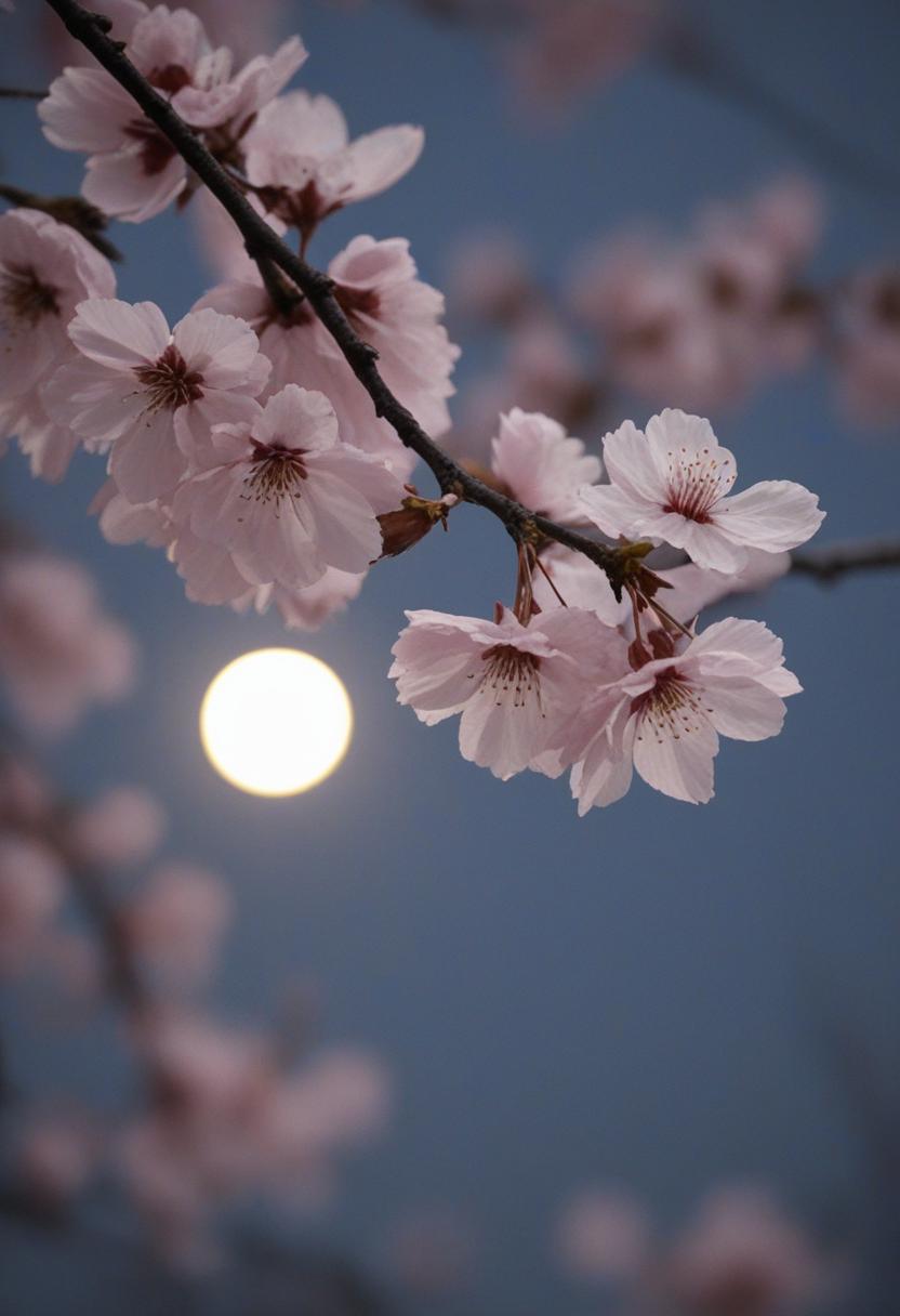1. A dramatic midshot of a cherry blossom silhouette against soft lighting, capturing the serene beauty of spring with a poetic, ethereal vibe.