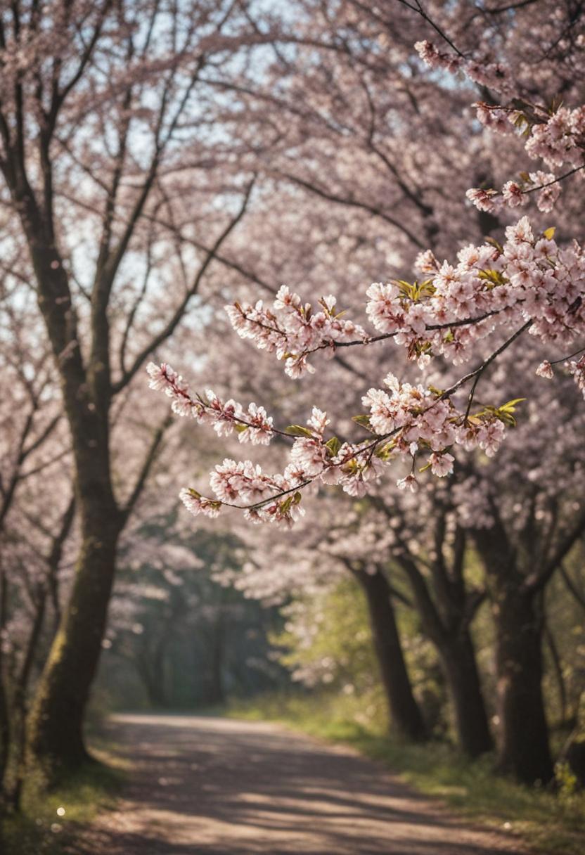 73. Soft morning light bathes a vibrant cherry blossom scene, creating a serene and aesthetic view of delicate petals against a peaceful, scenic backdrop.