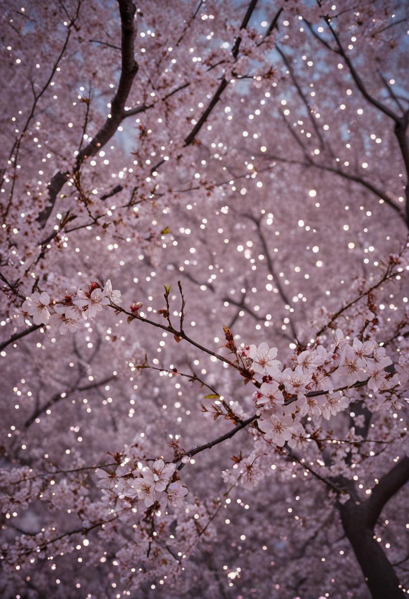 99. A lively wide-angle shot captures a cherry blossom silhouette bathed in soft lighting, exuding a serene and ethereal cherry blossom aesthetic.