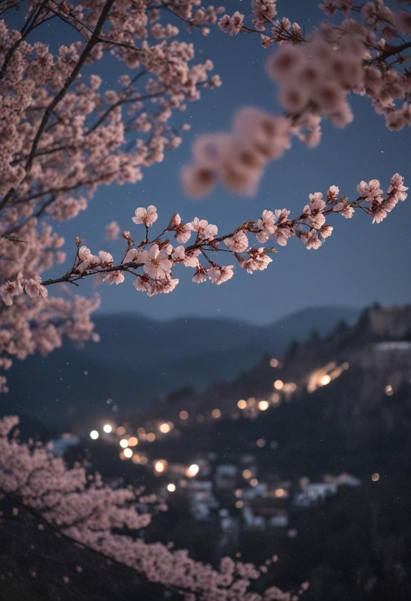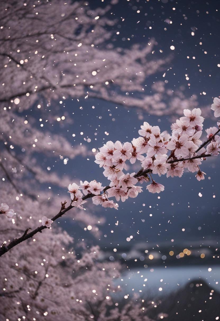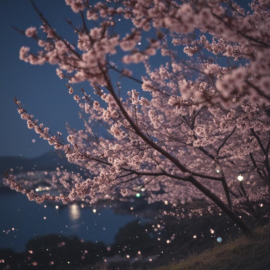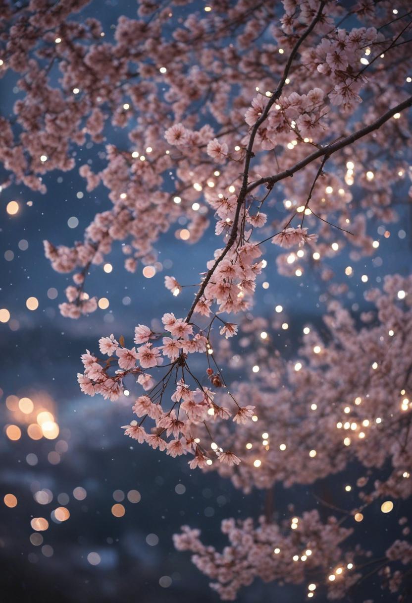 5. A serene top-down view of a cherry blossom tree under starlit sky, capturing a dreamy, cinematic aesthetic with soft light and delicate petals floating in the night air.