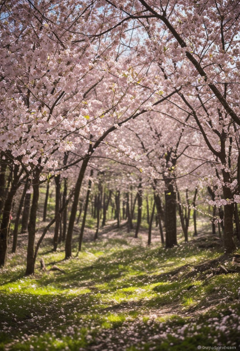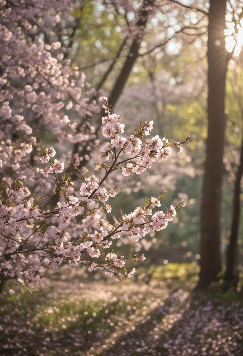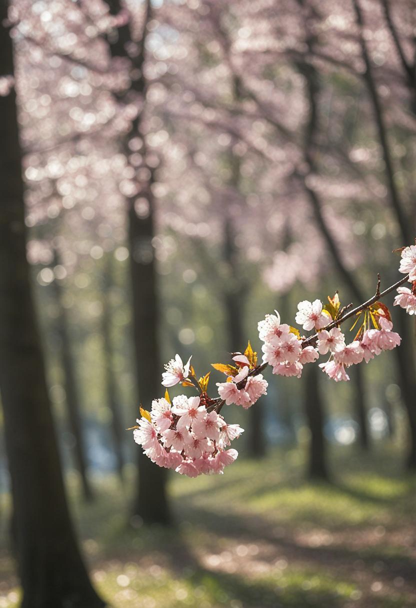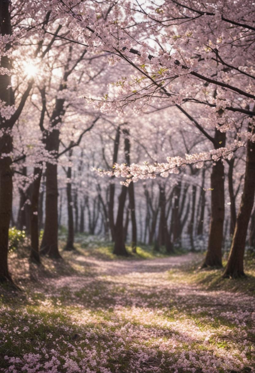 30. A dreamy wide-angle shot of a dappled forest bathed in soft cherry blossom light, creating a serene and ethereal cherry blossom aesthetic.