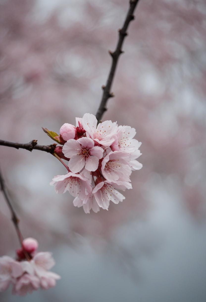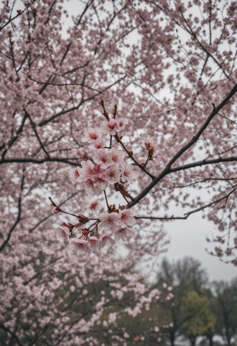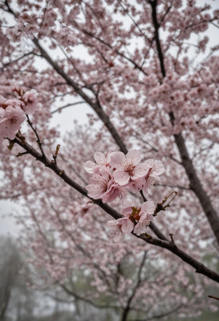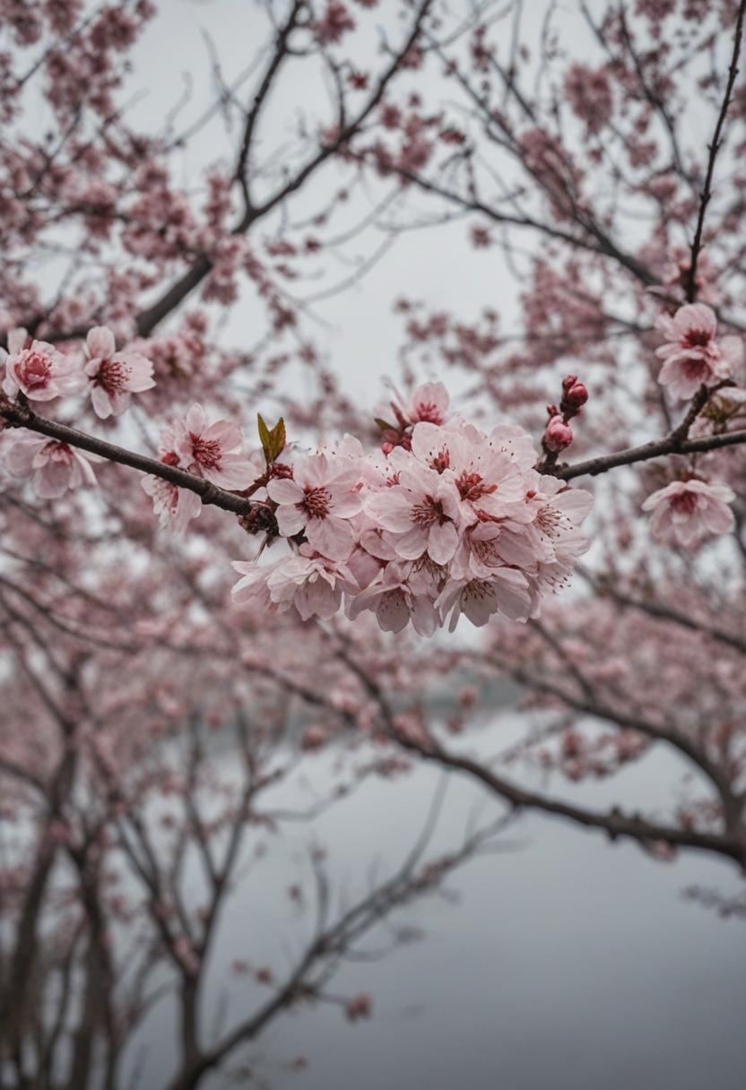 51. A serene midshot of cherry blossoms under a cloudy, overcast sky, exuding calm and quiet beauty.