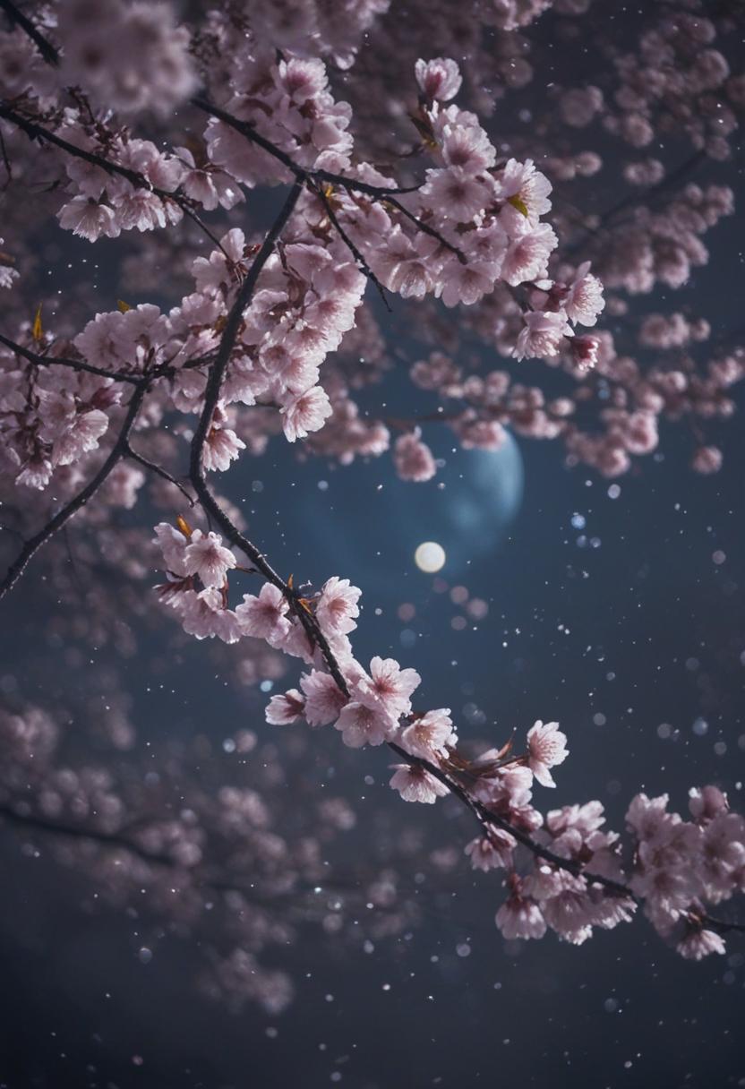 37. A serene midshot of a cherry blossom tree under moonlight, capturing a peaceful Zen atmosphere with soft, ethereal lighting and delicate petals drifting in the night breeze.
