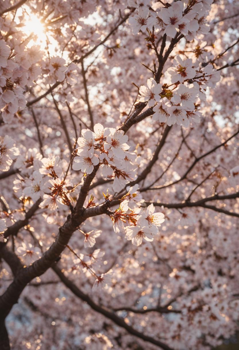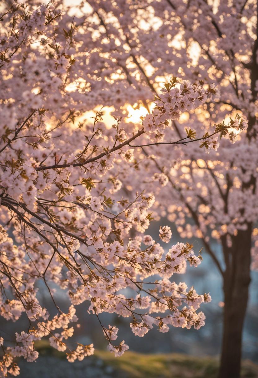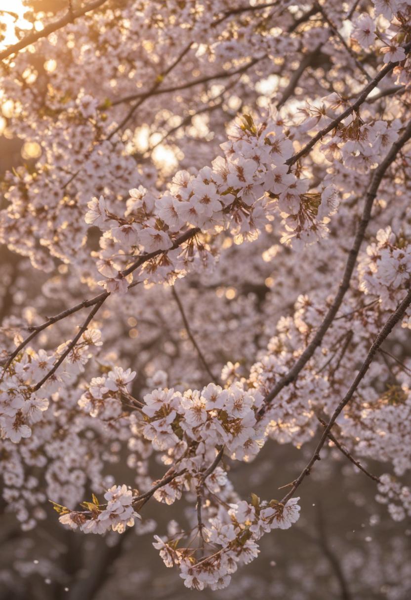 11. A surreal side view of cherry blossoms bathed in golden hour light, creating a dreamy, ethereal cherry blossom aesthetic.