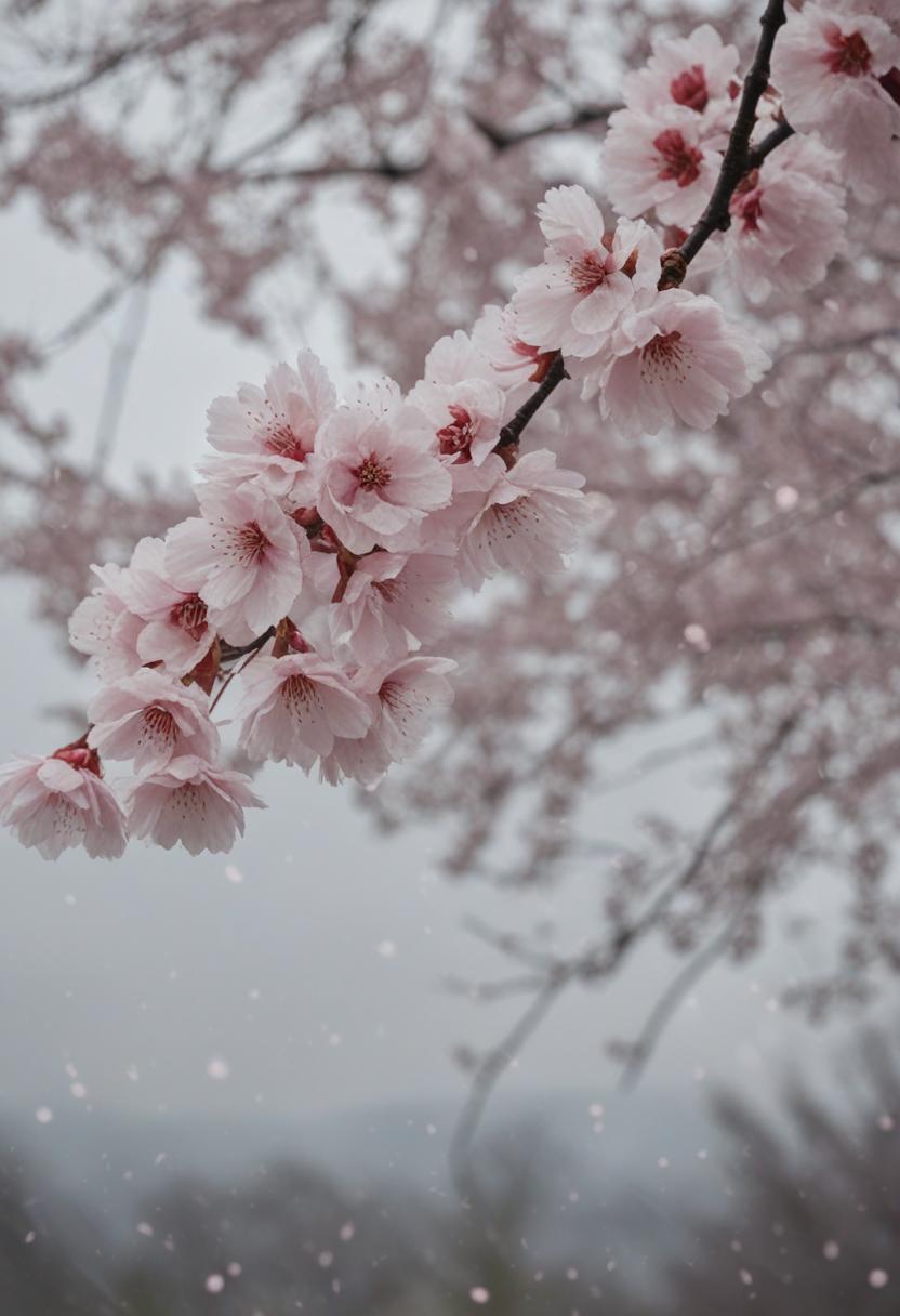 2. A serene cherry blossom scene under a cloudy, overcast sky, capturing a cinematic and scenic view with soft light and delicate petals drifting through the air.