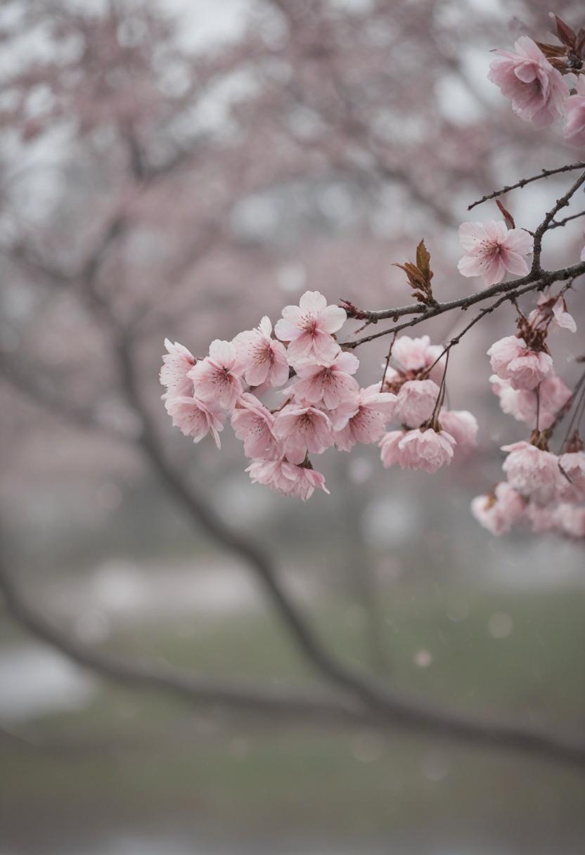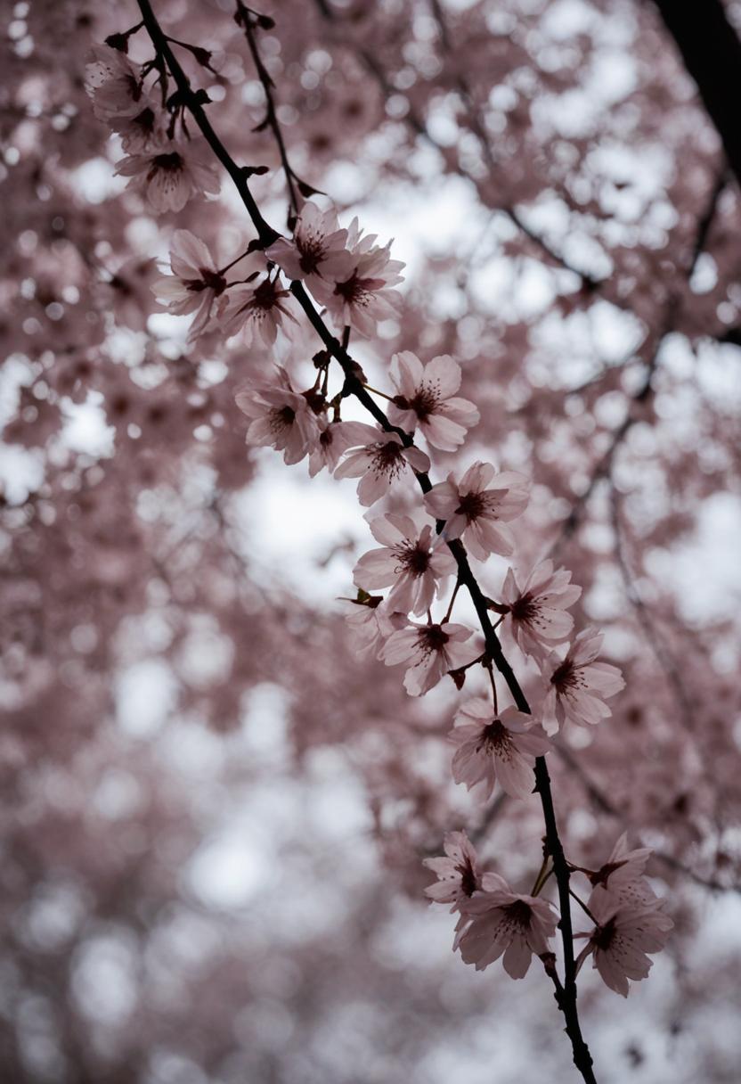 24. A dramatic close-up of cherry blossoms under a cloudy, overcast sky, exuding a serene and melancholic cherry blossom aesthetic.