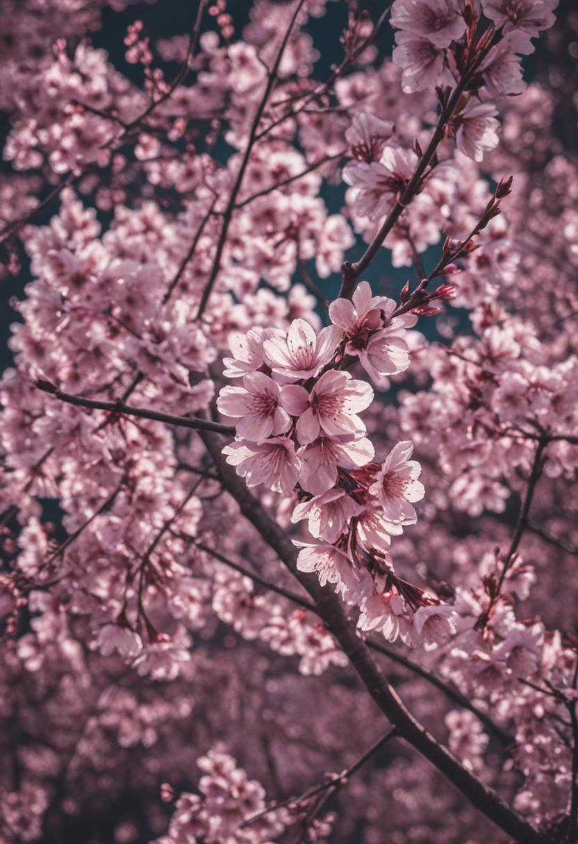 52. A vibrant close-up of cherry blossoms under a neon glow, capturing the lively essence of the cherry blossom aesthetic with soft, glowing light and delicate petals.