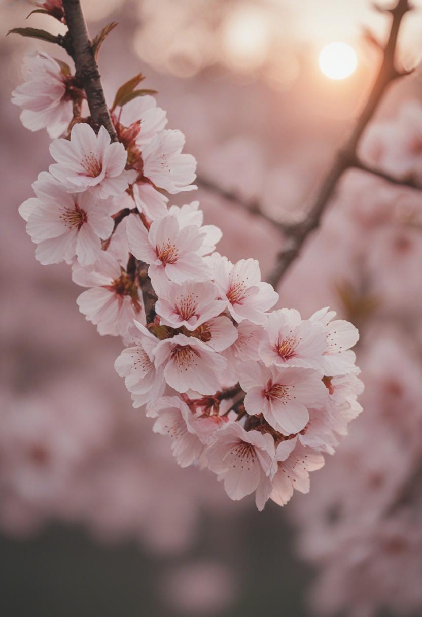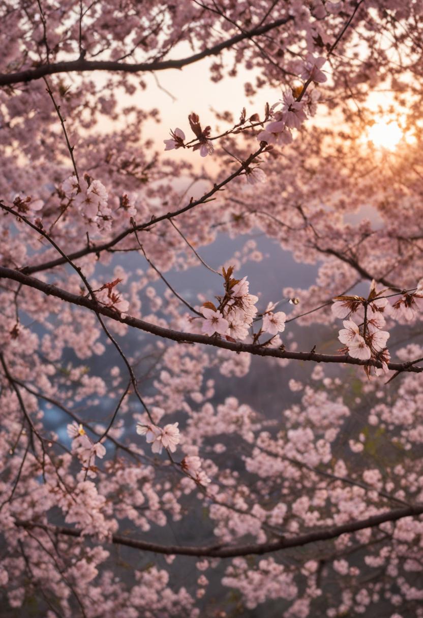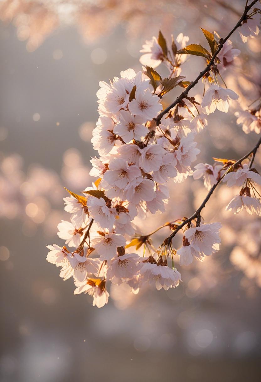 35. A cinematic close-up of cherry blossoms bathed in a soft sunset glow, capturing the serene beauty of fleeting spring moments.