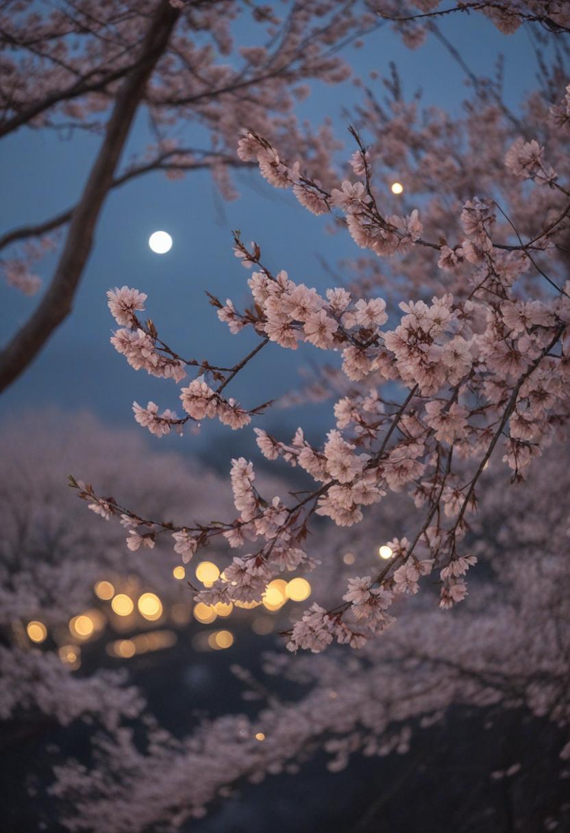 100. A minimalist wide-angle shot captures a serene cherry blossom tree under moonlight, exuding a soft, ethereal cherry blossom aesthetic.