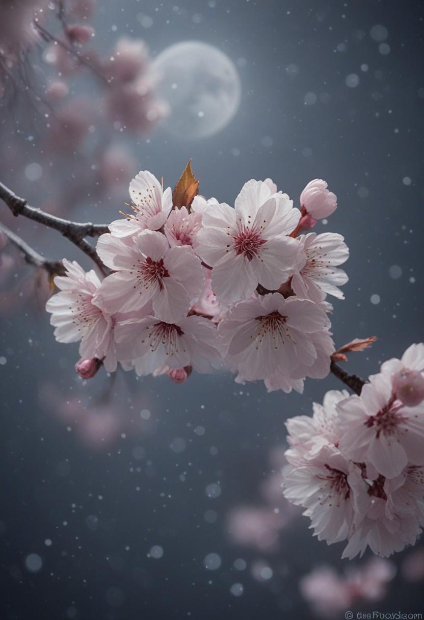 61. A close-up of cherry blossoms under moonlight, exuding a dreamy, serene atmosphere with soft lighting and delicate petals.