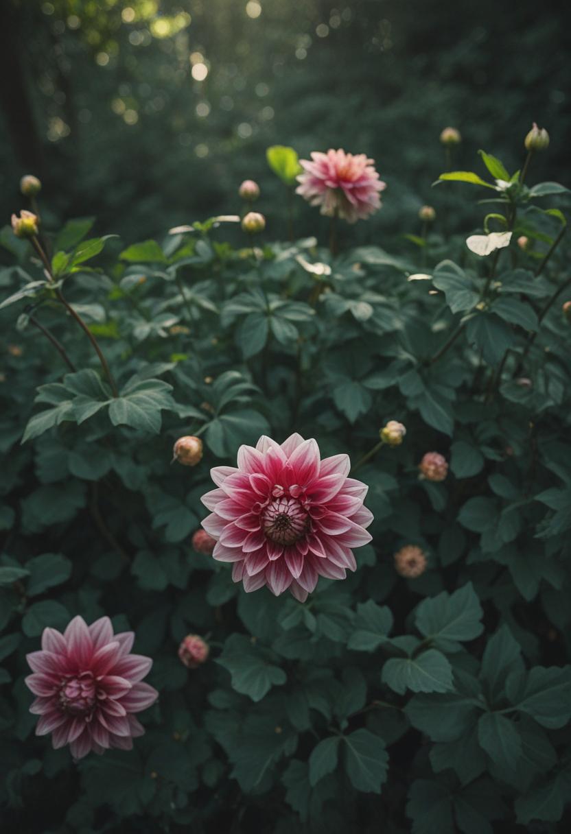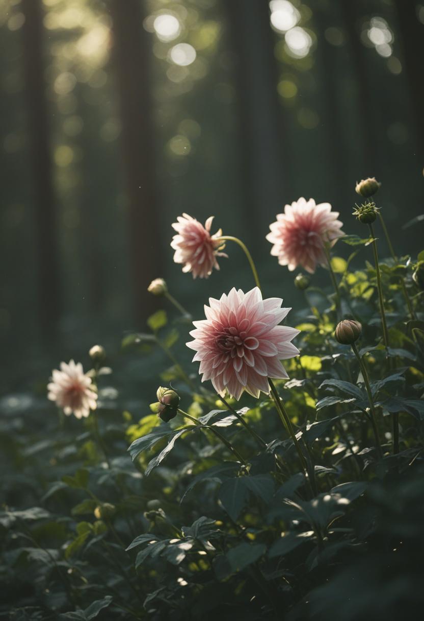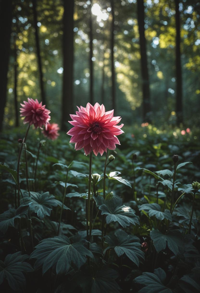 72. A dramatic wide-angle shot of a dahlia in a dappled forest light, capturing soft shadows and vibrant blooms under the canopy.