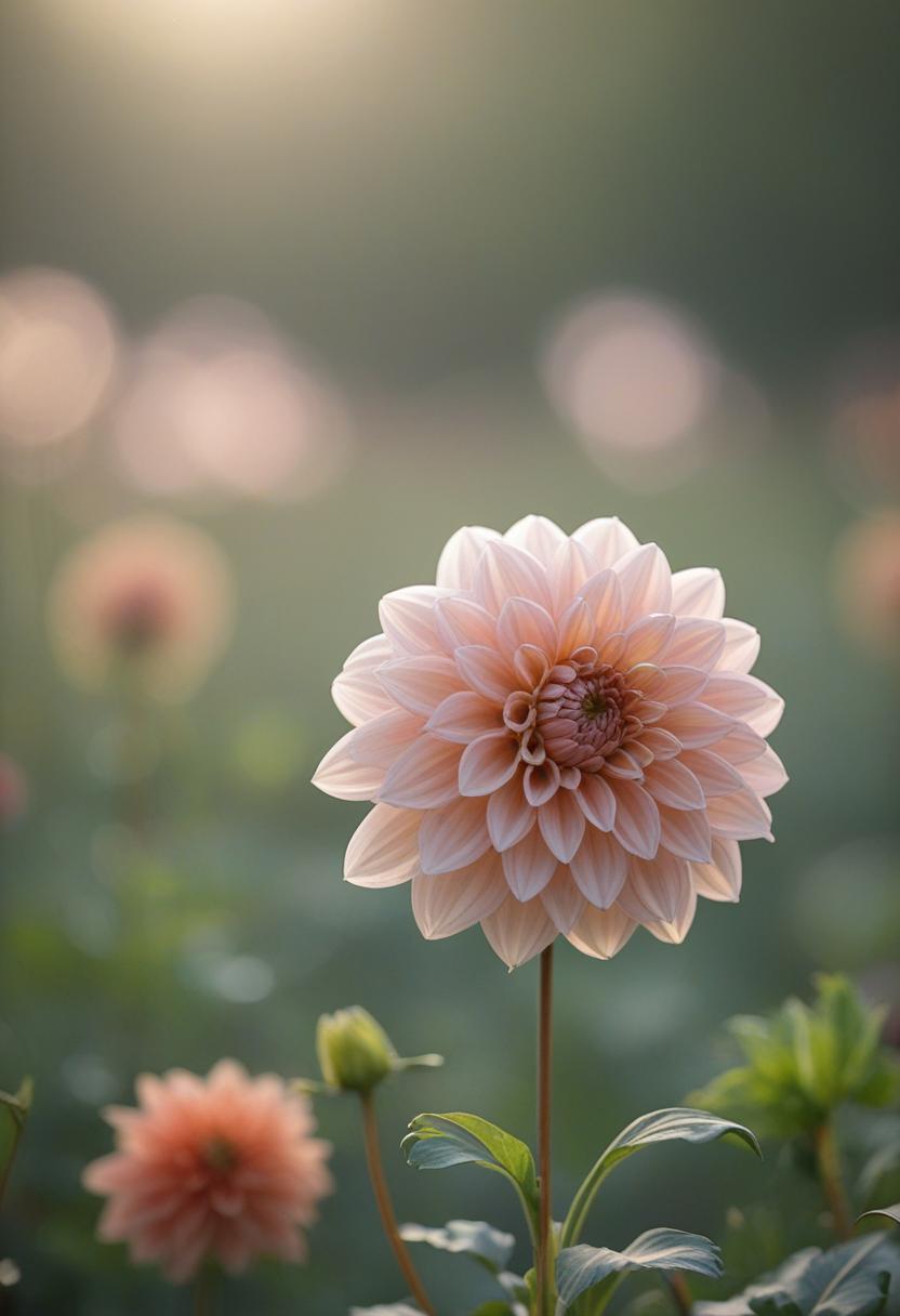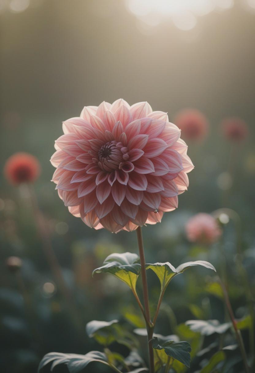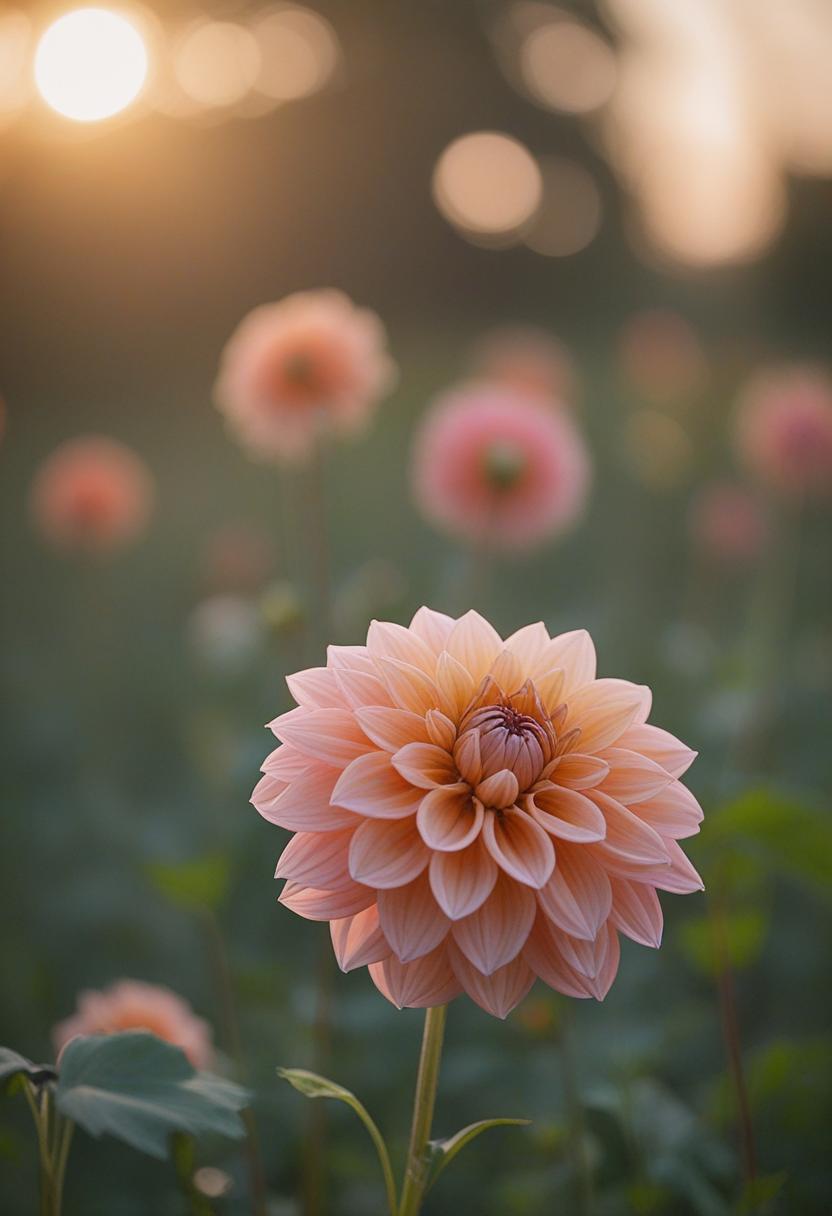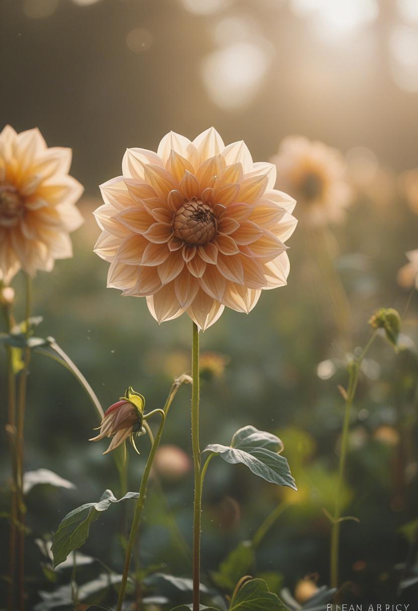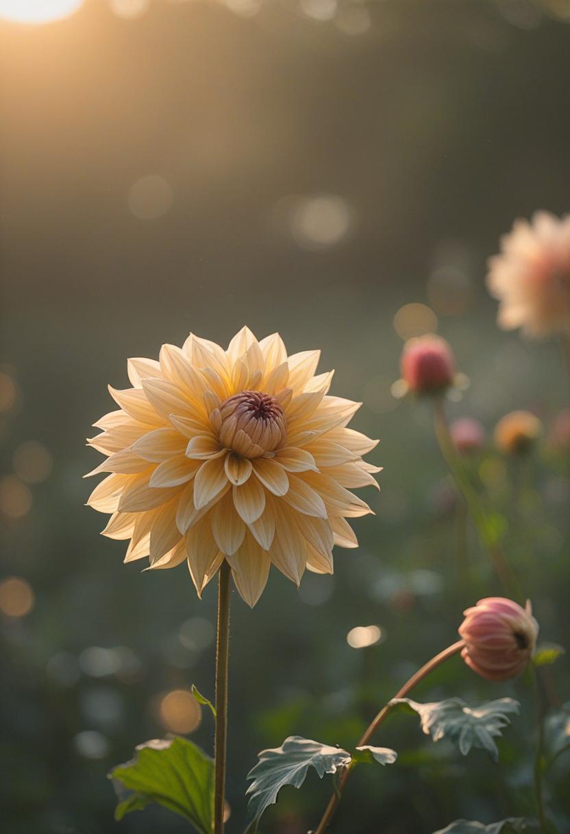 1. A soft morning glow illuminates a midshot of a dahlia, capturing its delicate petals in a serene, dreamy dahlia aesthetic.