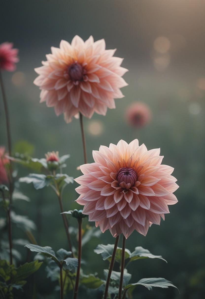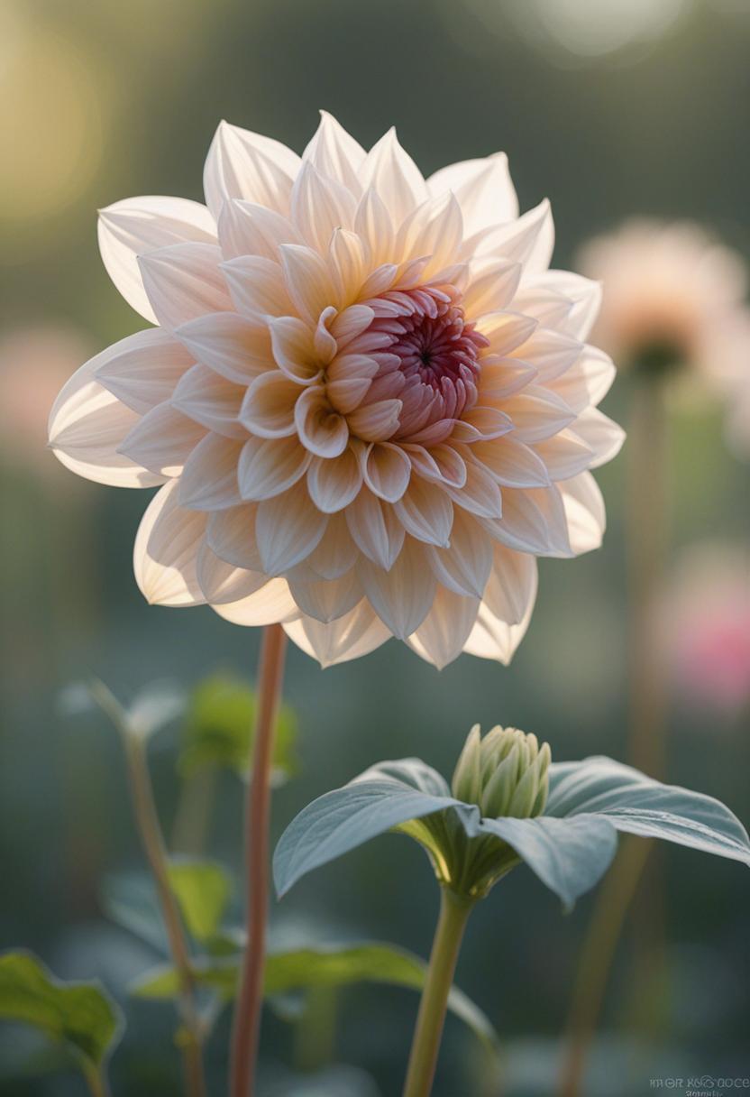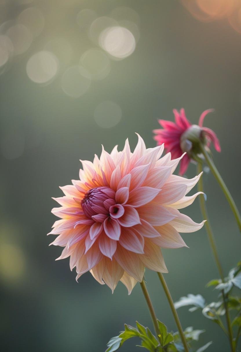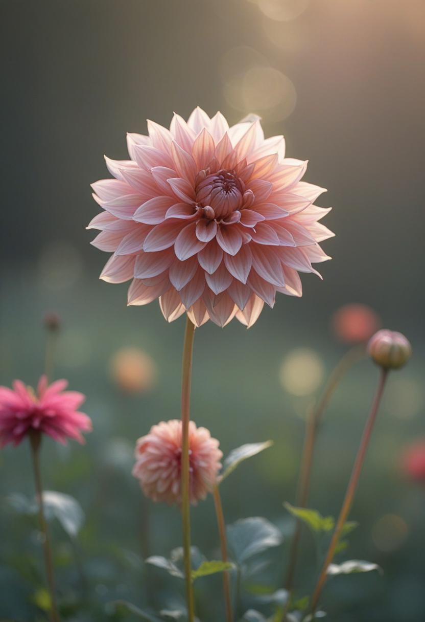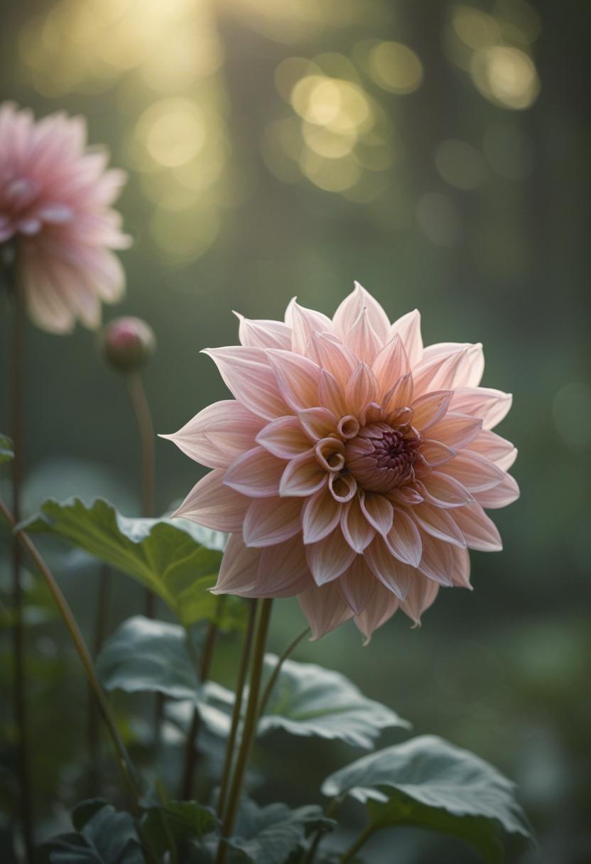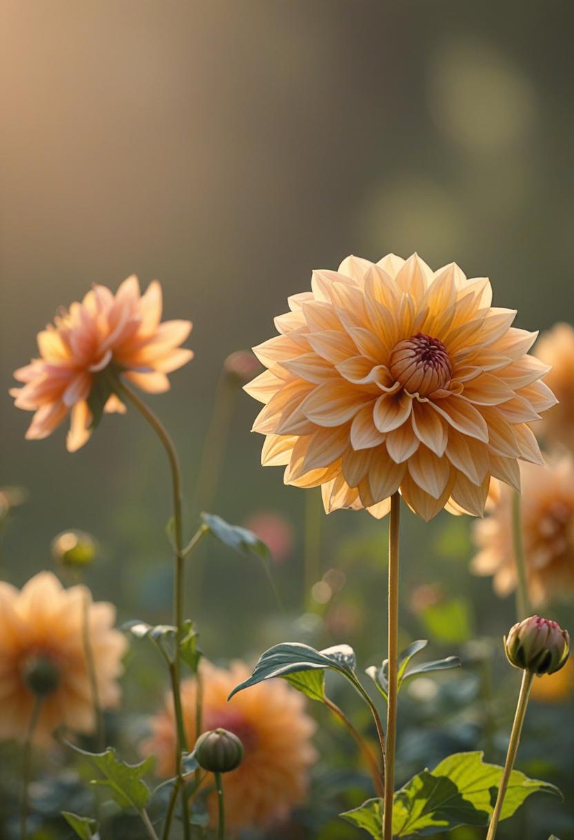 1. A soft morning glow illuminates a midshot of a dahlia, capturing its delicate petals in a serene, dreamy dahlia aesthetic.