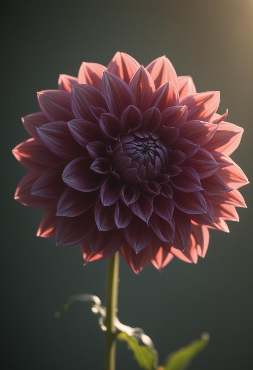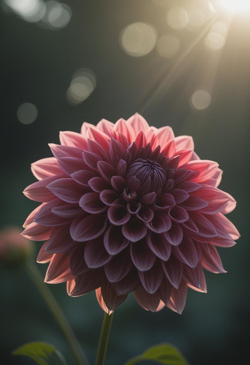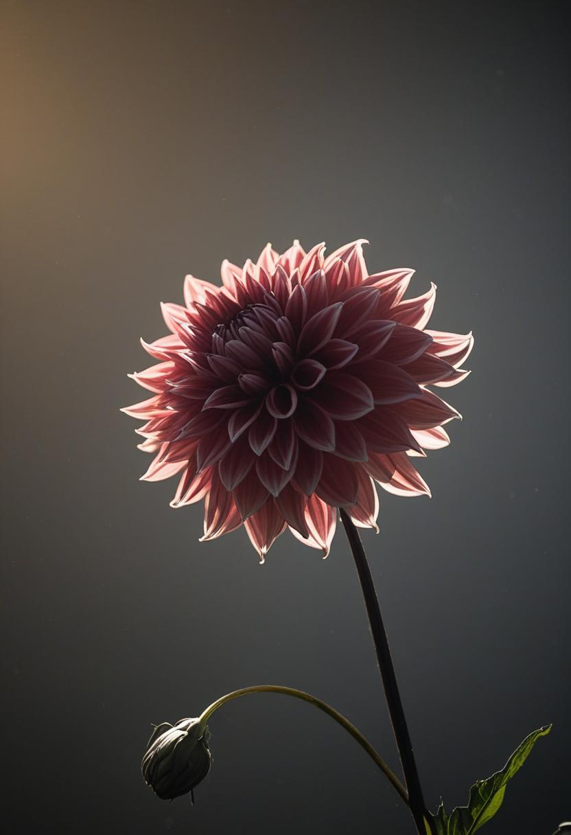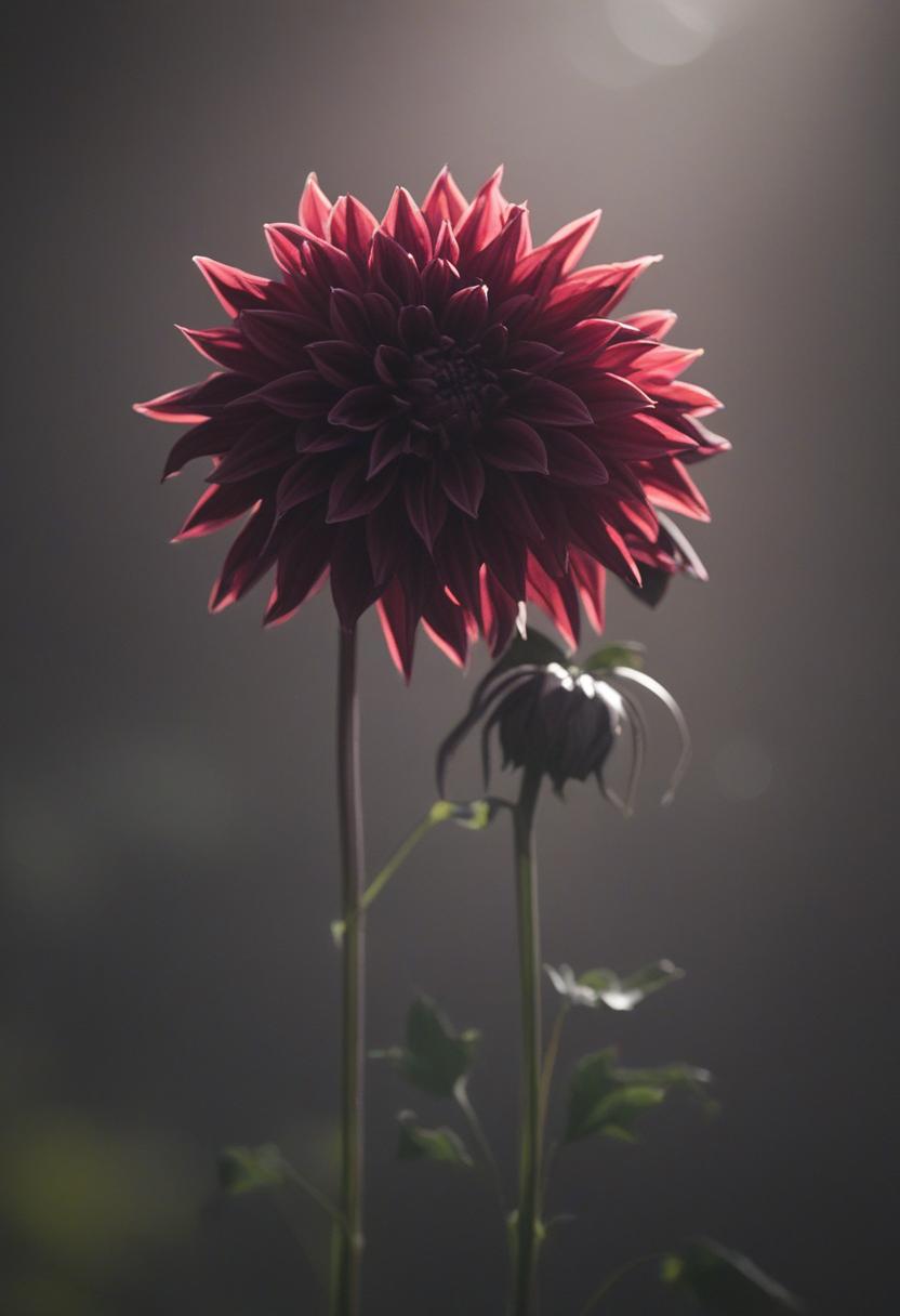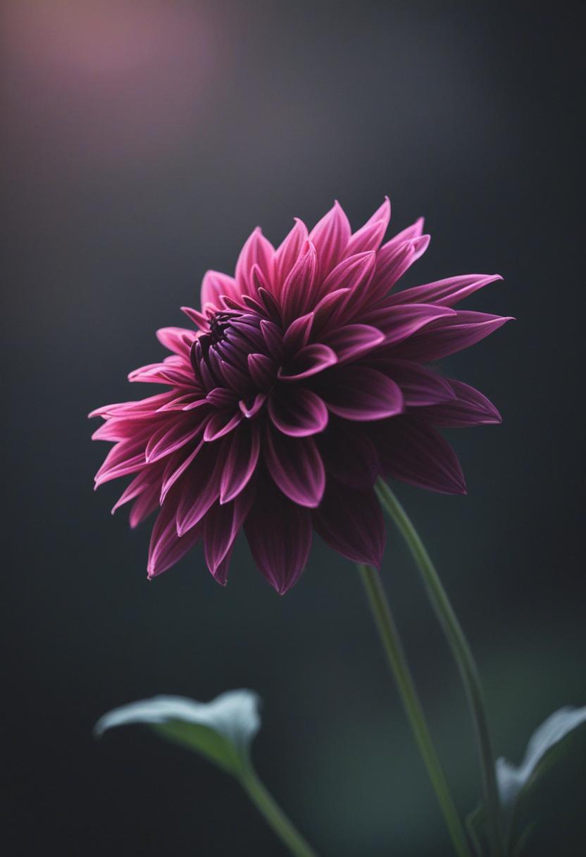 2. A dramatic dahlia in soft backlighting, captured in a romantic studio setting, exuding a dreamy, artistic vibe with rich shadows and elegant bloom.