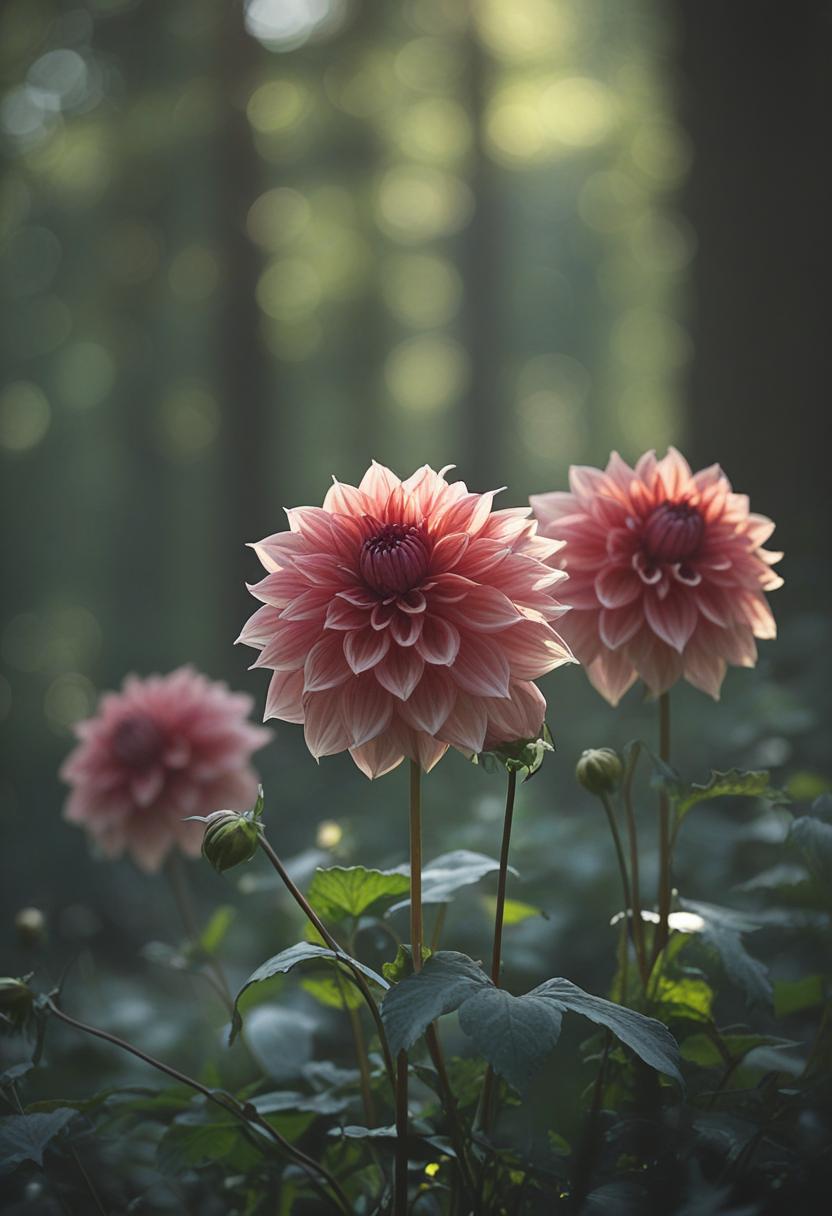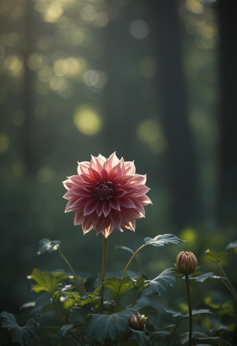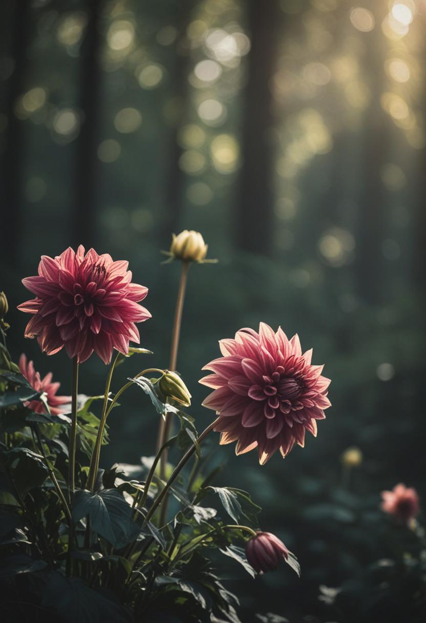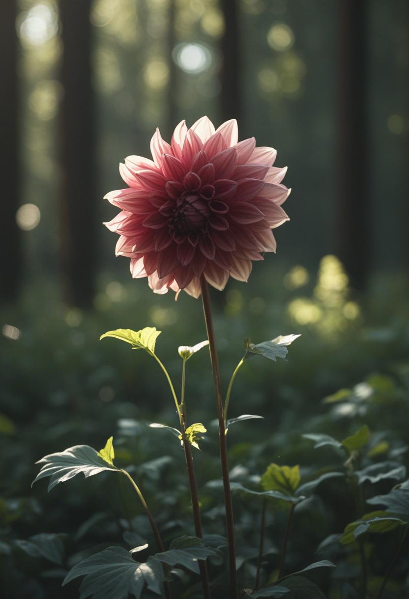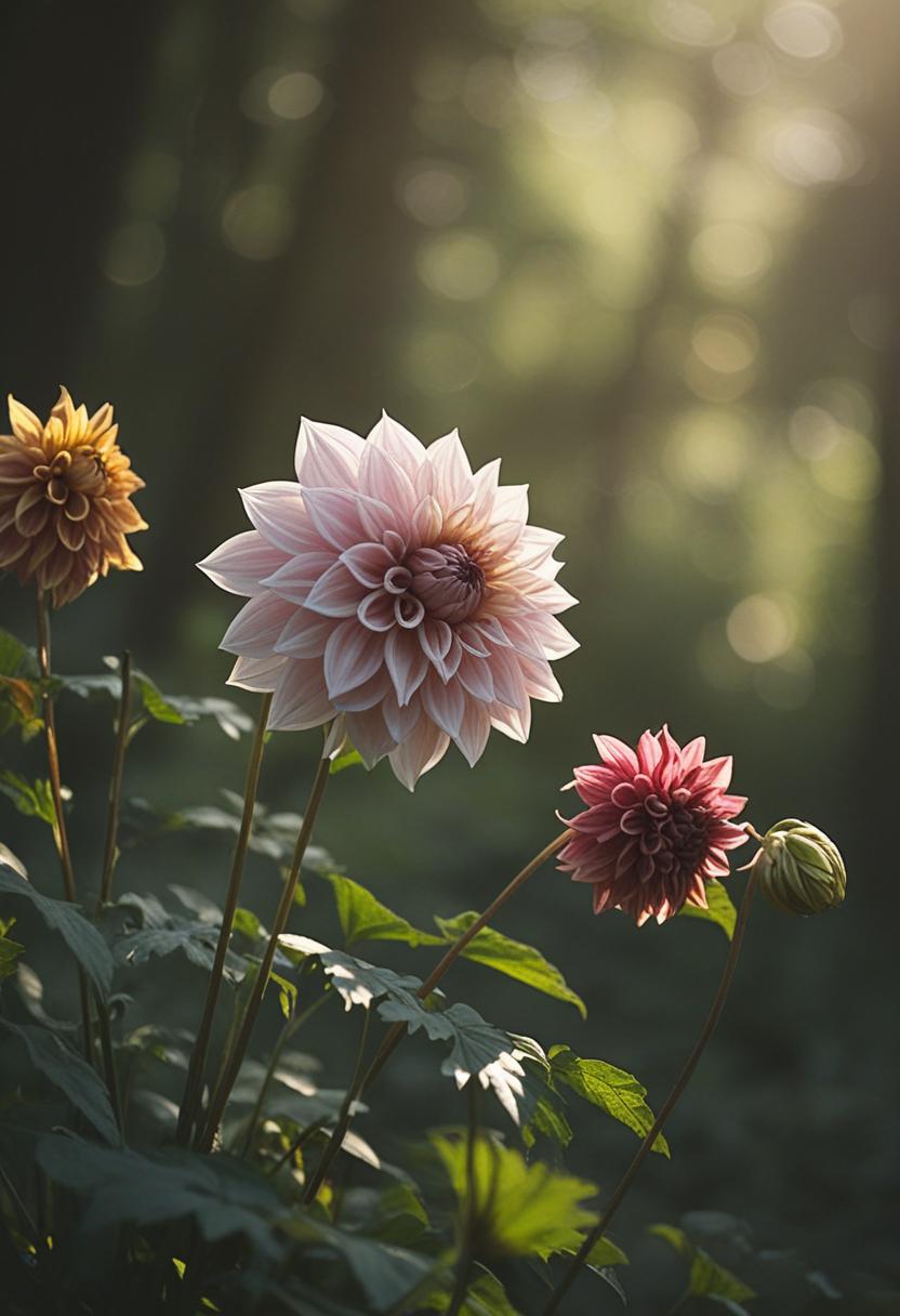 3. A dahlia blooms under dappled forest light in a dramatic studio shot, capturing soft shadows and rich textures with a dreamy, nature-inspired aesthetic.