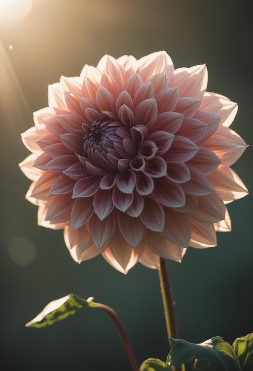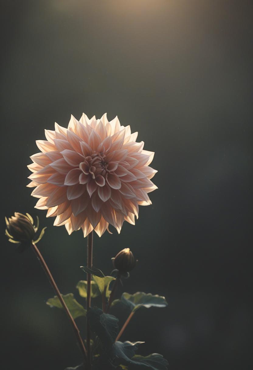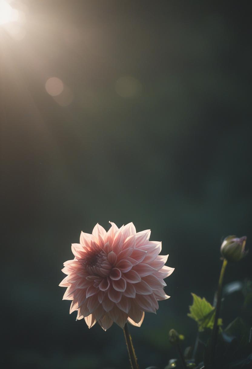 96. A dahlia in dramatic, ethereal studio lighting, bathed in soft backlighting, exuding a dreamy, artistic vibe with a touch of elegance and mystery.